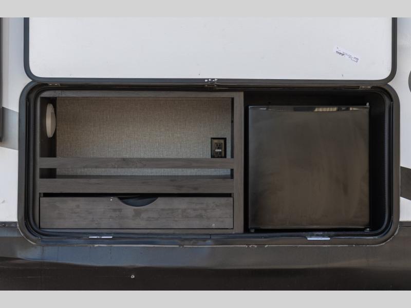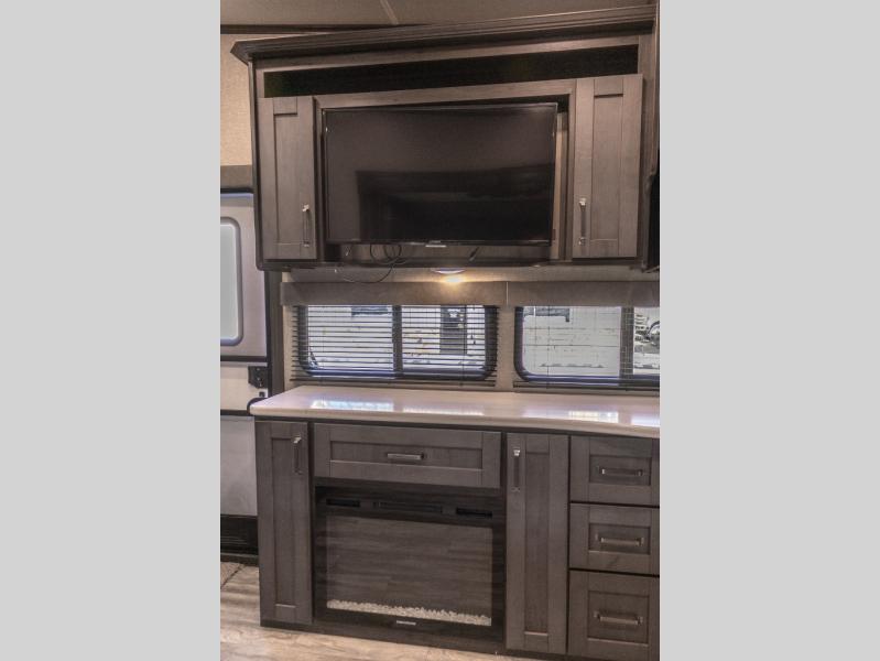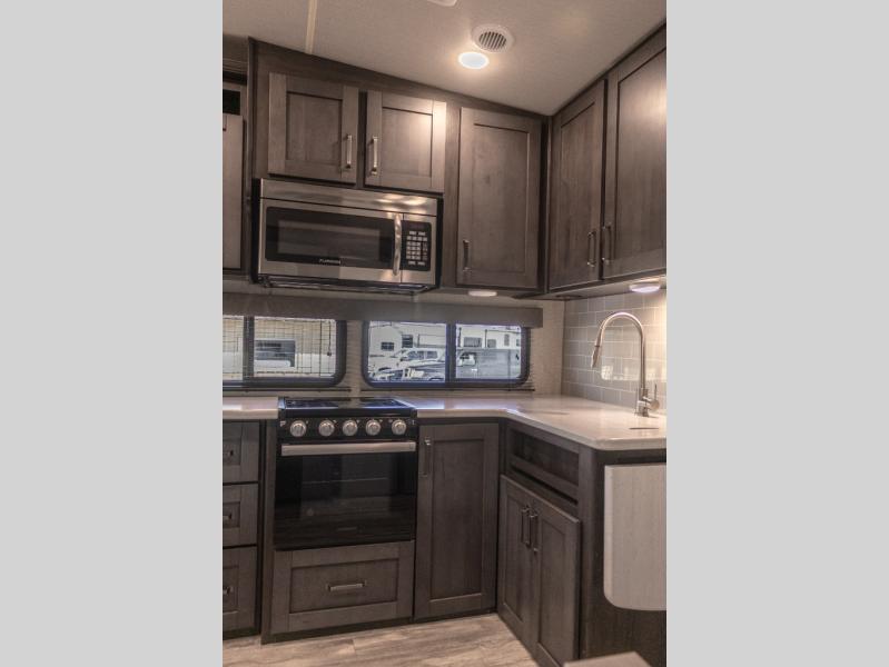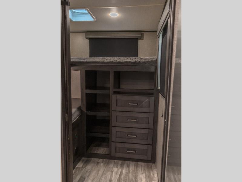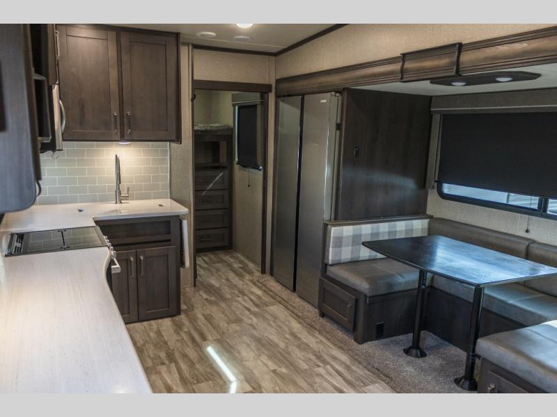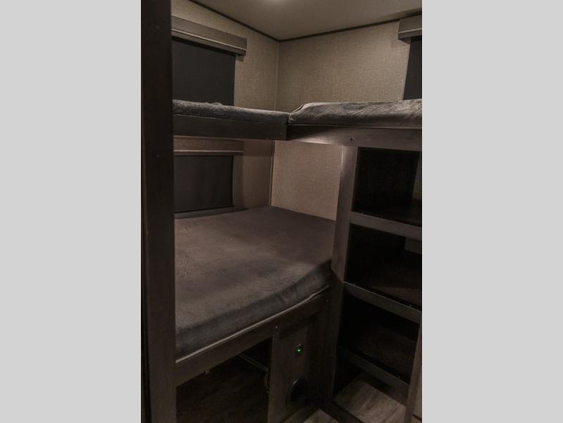 You probably selected this fifth wheel because of the rear bunkhouse that offers a 30" top bunk with a dresser below, a 34" top bunk with a 48" lower bunk, a ladder to reach the two top bunks and the privacy that it allows your family or friends when they camp with you. The gourmet kitchen has a flip-up countertop extension to make meal prepping easier and a 16 cu. ft. refrigerator to store lots of food and beverages for the large group. There is an outside kitchen as well to make meals when you want to be outdoors while others relax under the 21' electric awning. You can dine, relax and play games at the U-shaped dinette or choose the theatre seating option if you prefer, and the tri-fold sofa gives you more seating to watch the 40" LED HDTV with fireplace below. The front bedroom provides a walk-around queen bed, a slide out wardrobe with drawers and linen storage that stretches into the double entry bathroom which provides everything you need to stay clean and refreshed including a space savings radius shower.