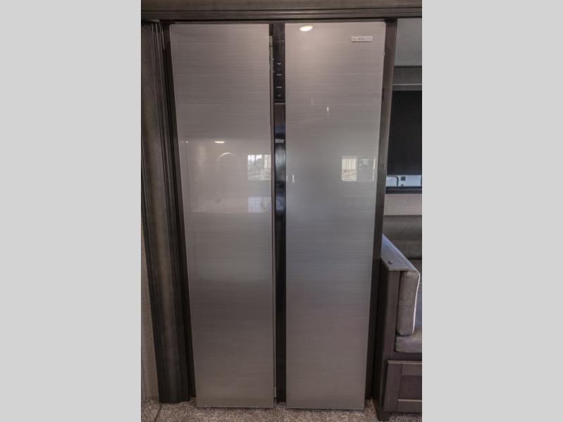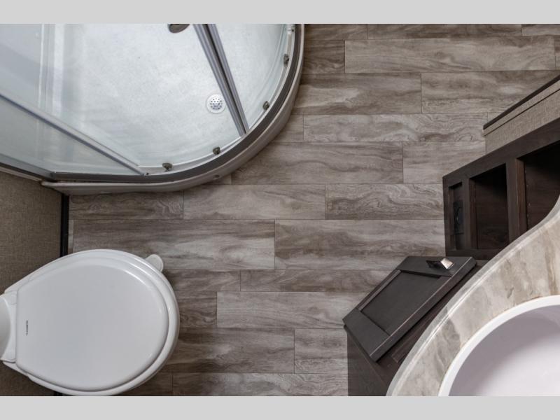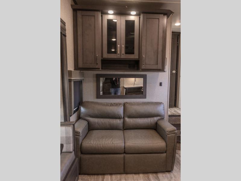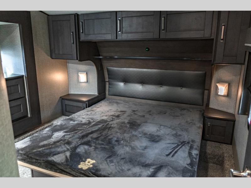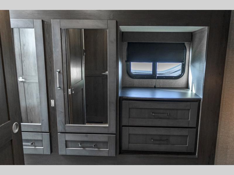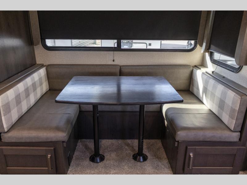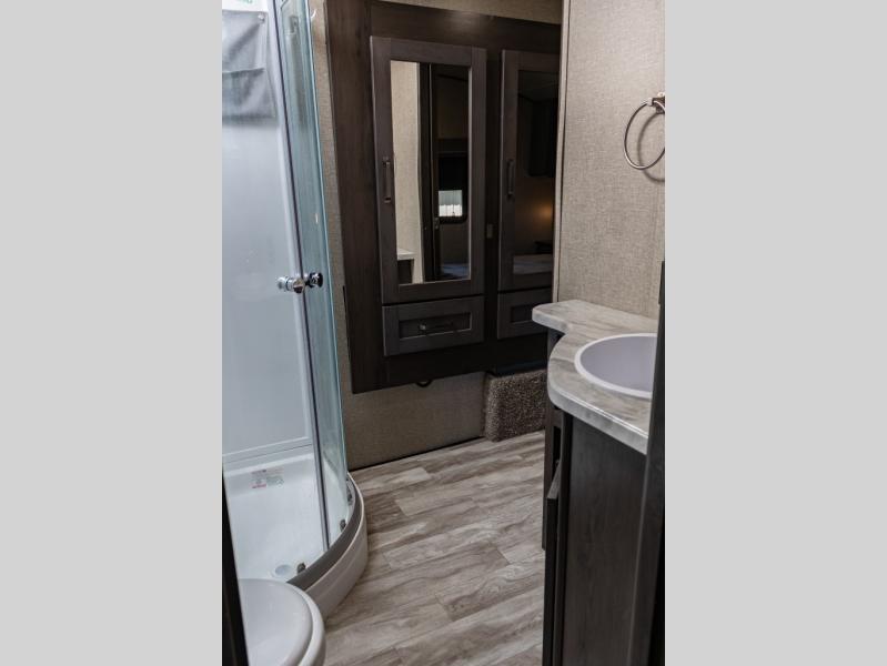 You probably selected this fifth wheel because of the rear bunkhouse that offers a 30" top bunk with a dresser below, a 34" top bunk with a 48" lower bunk, a ladder to reach the two top bunks and the privacy that it allows your family or friends when they camp with you. The gourmet kitchen has a flip-up countertop extension to make meal prepping easier and a 16 cu. ft. refrigerator to store lots of food and beverages for the large group. There is an outside kitchen as well to make meals when you want to be outdoors while others relax under the 21' electric awning. You can dine, relax and play games at the U-shaped dinette or choose the theatre seating option if you prefer, and the tri-fold sofa gives you more seating to watch the 40" LED HDTV with fireplace below. The front bedroom provides a walk-around queen bed, a slide out wardrobe with drawers and linen storage that stretches into the double entry bathroom which provides everything you need to stay clean and refreshed including a space savings radius shower.