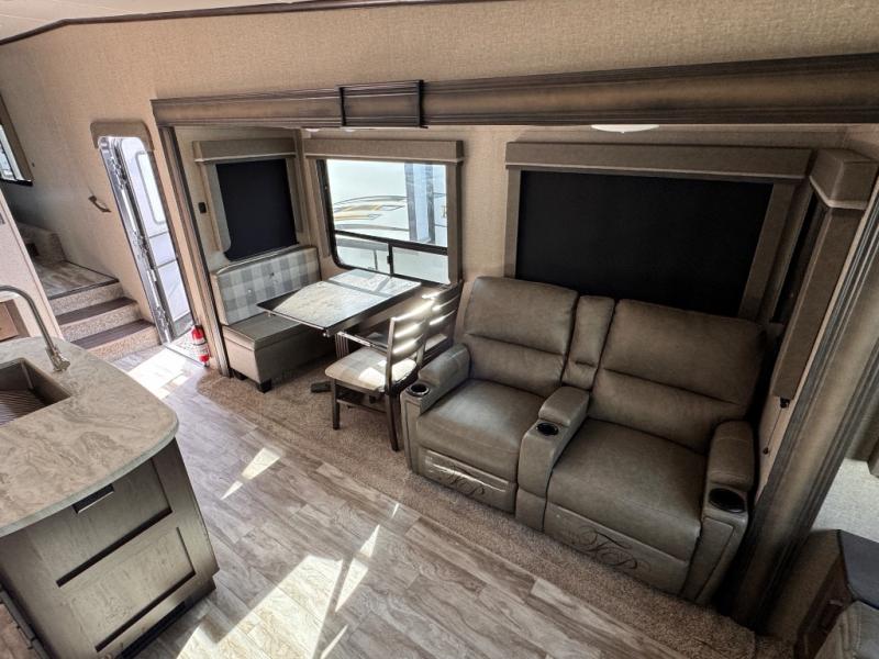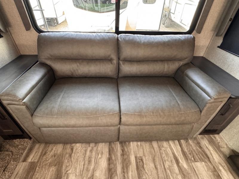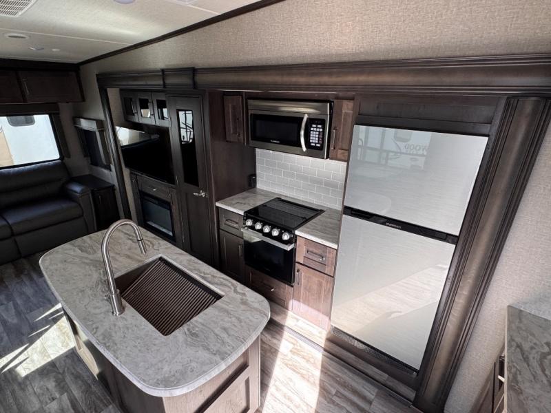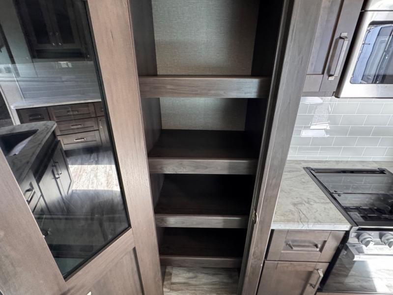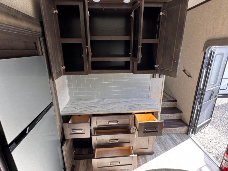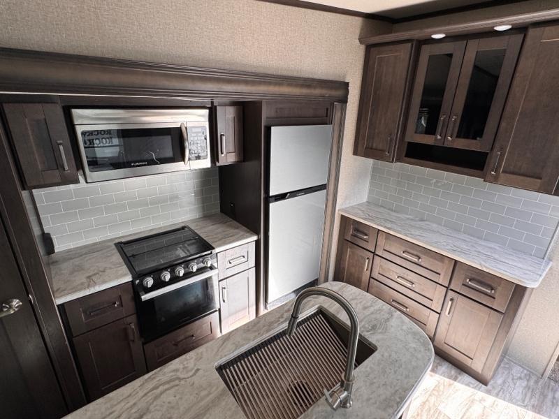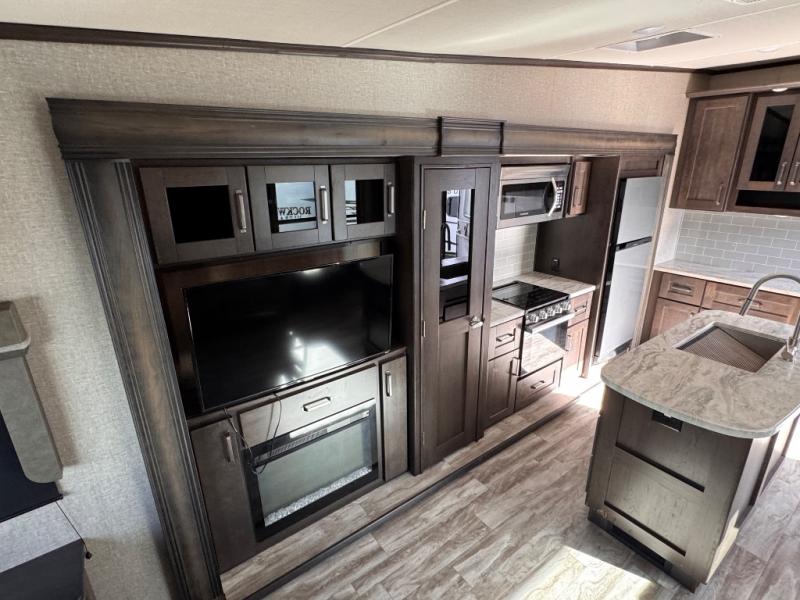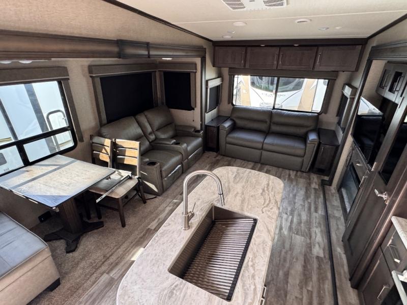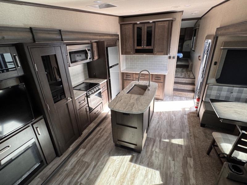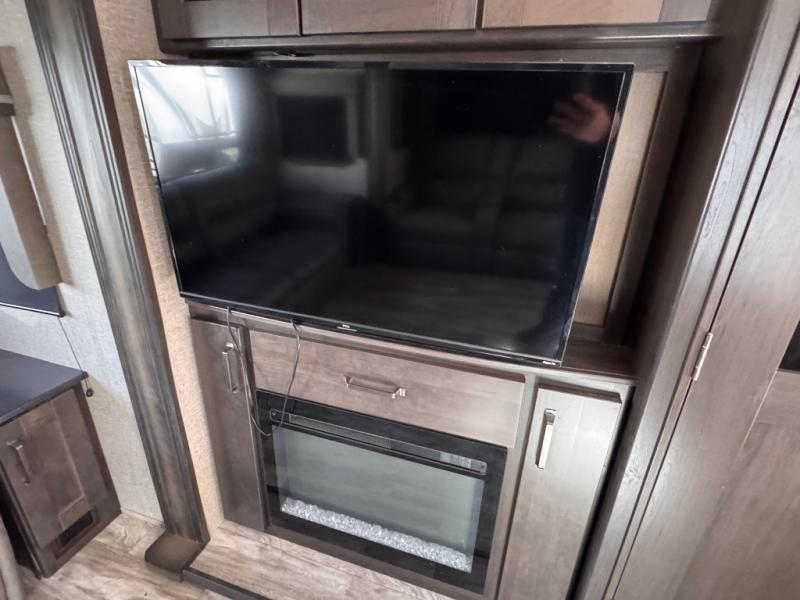 Get ready to enjoy everything the campgrounds and surrounding area has to offer when you are setup to camp in this fifth wheel! The two electric awnings offer protected areas creating outdoor living spaces, just grab your camping chairs from the unobstructed pass-through storage. And the interior offers a spacious living area and kitchen combination with two slide outs. You can sit on the tri-fold sofa or the dinette with an option for a free standing dinette. The hutch and kitchen island offer counter space to prepare and serve meals, and there is a large pantry for goodies. The 40" LED HDTV with fireplace below provides entertainment before bedtime or on a rainy day. And the front bedroom offers privacy, a walk-around queen bed, storage, and it is next to the full bathroom which is just a few steps down the hallway.