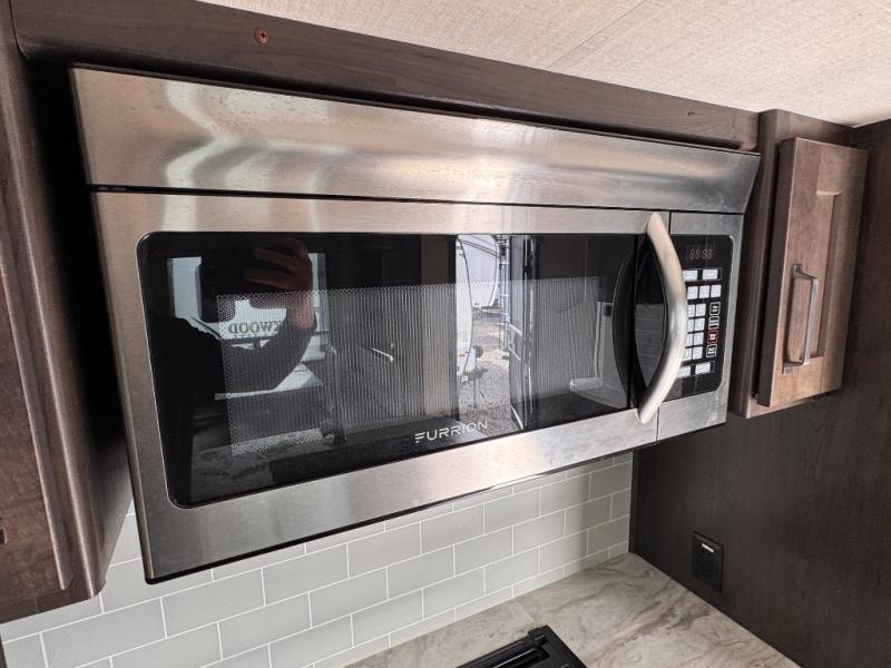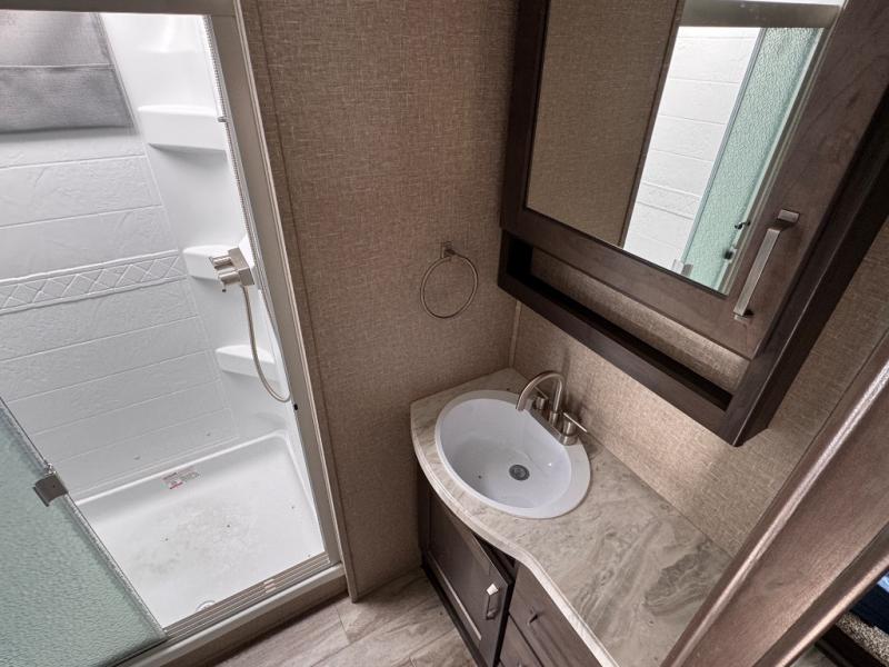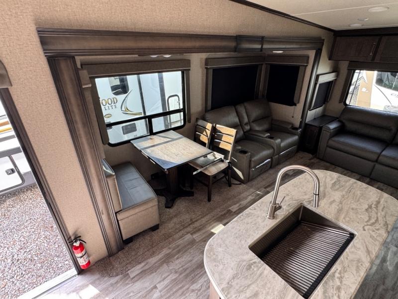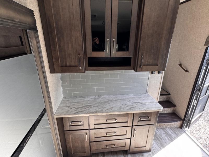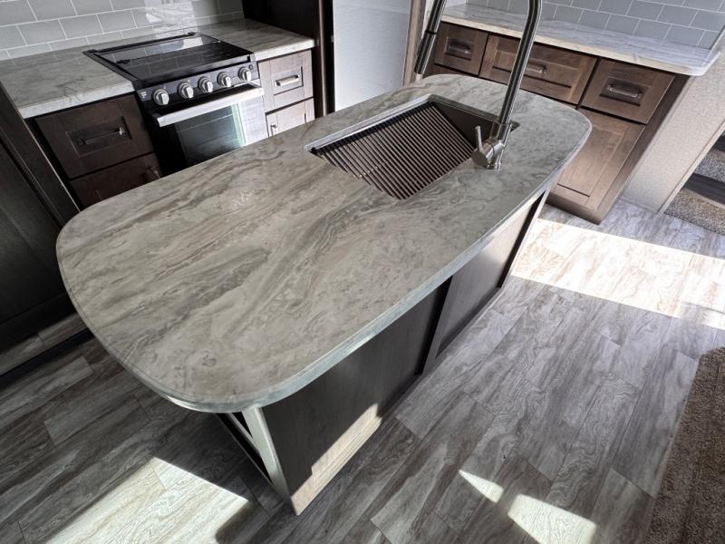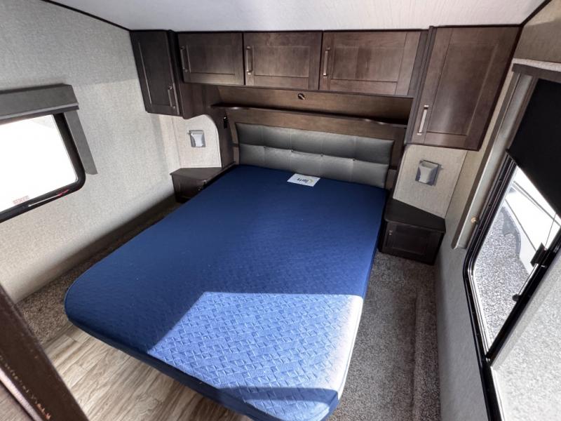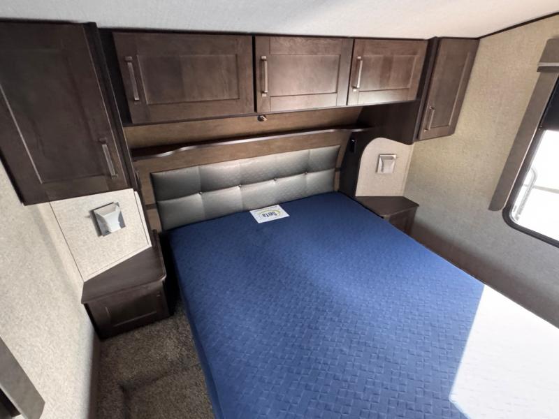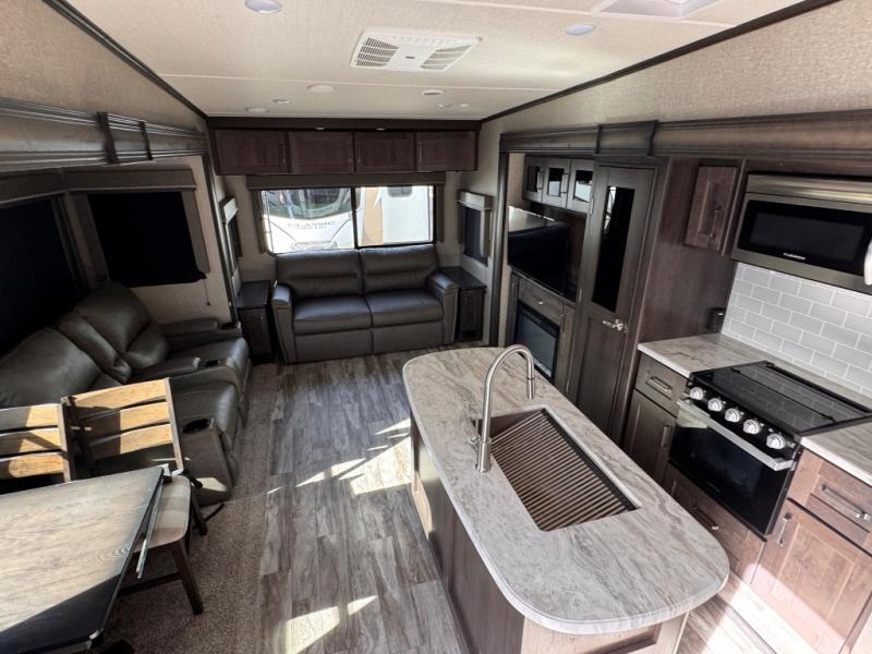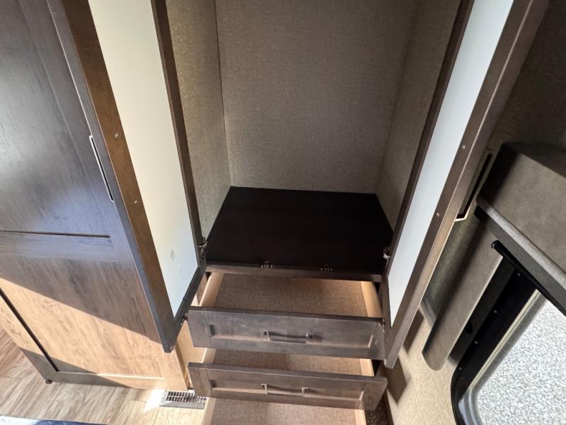 Get ready to enjoy everything the campgrounds and surrounding area has to offer when you are setup to camp in this fifth wheel! The two electric awnings offer protected areas creating outdoor living spaces, just grab your camping chairs from the unobstructed pass-through storage. And the interior offers a spacious living area and kitchen combination with two slide outs. You can sit on the tri-fold sofa or the dinette with an option for a free standing dinette. The hutch and kitchen island offer counter space to prepare and serve meals, and there is a large pantry for goodies. The 40" LED HDTV with fireplace below provides entertainment before bedtime or on a rainy day. And the front bedroom offers privacy, a walk-around queen bed, storage, and it is next to the full bathroom which is just a few steps down the hallway.