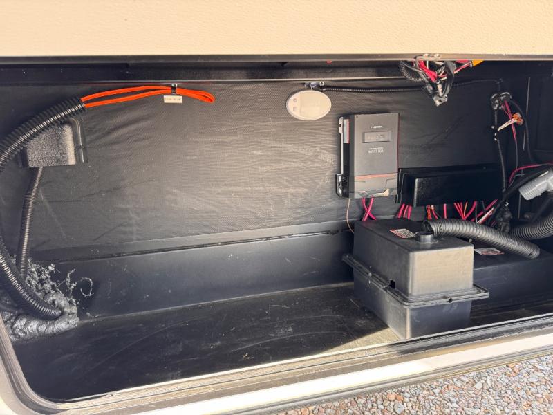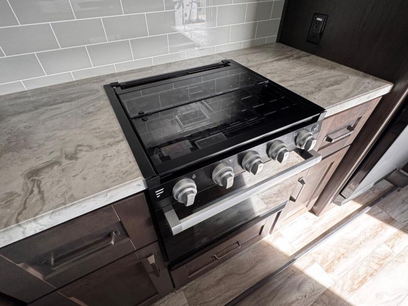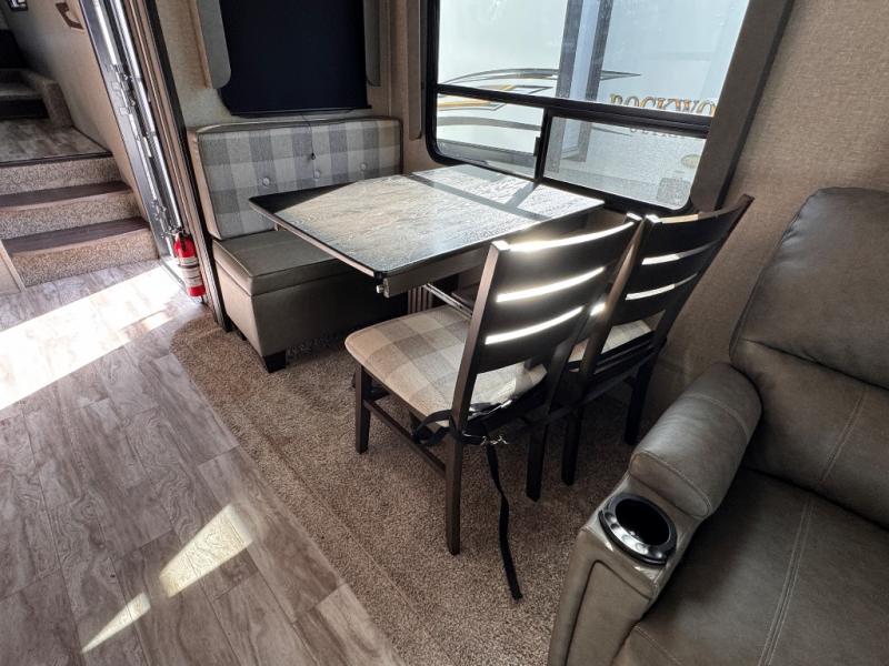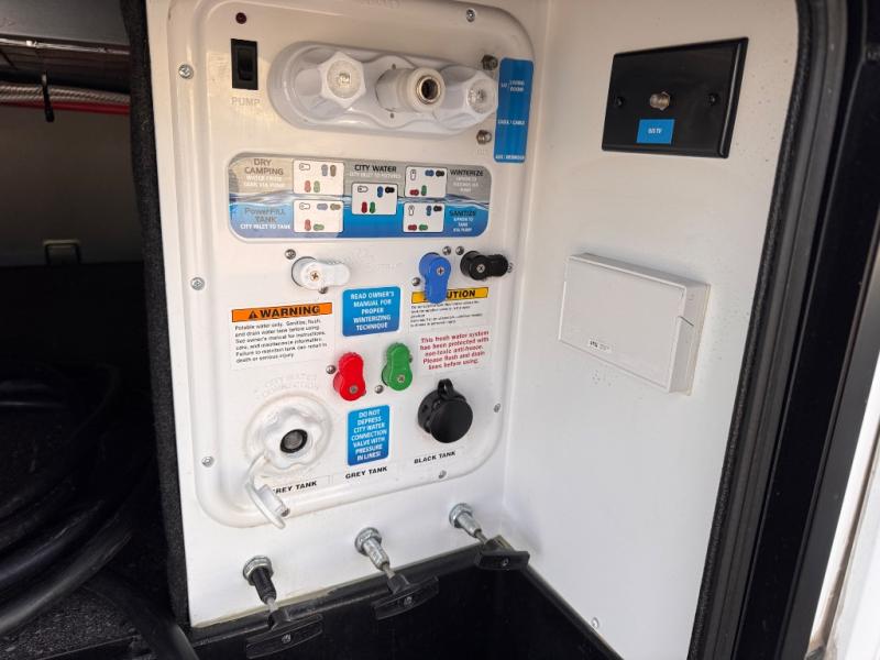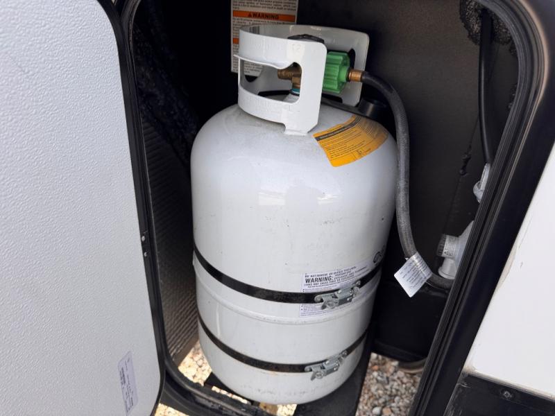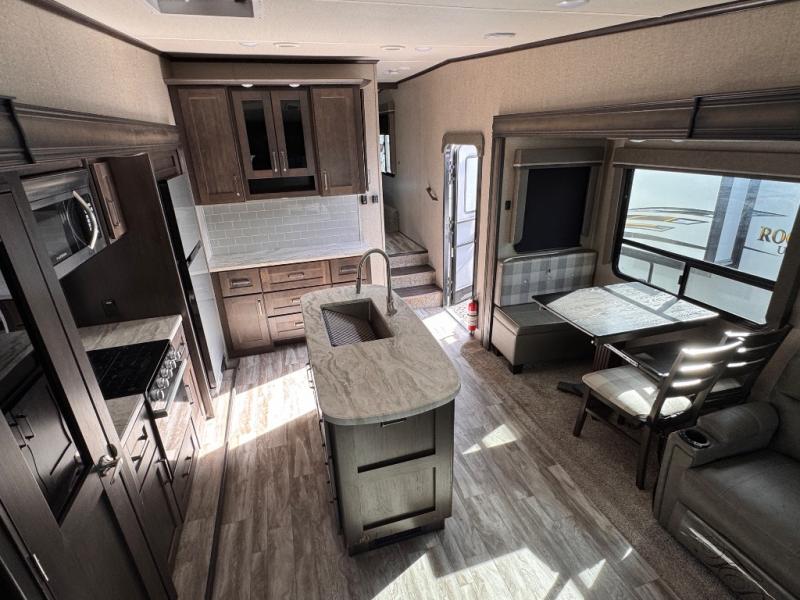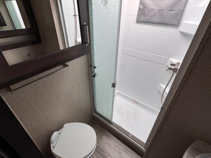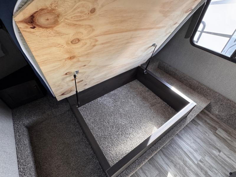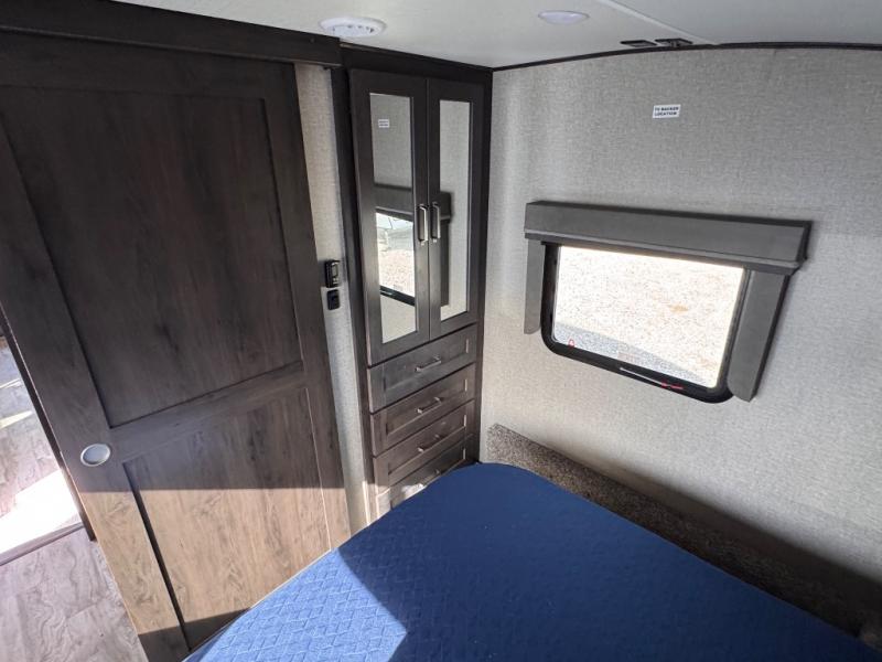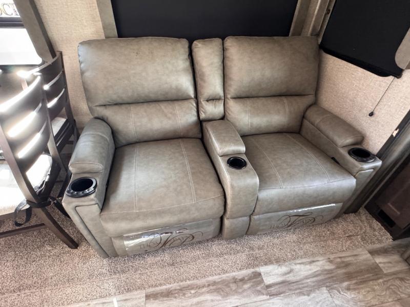 Get ready to enjoy everything the campgrounds and surrounding area has to offer when you are setup to camp in this fifth wheel! The two electric awnings offer protected areas creating outdoor living spaces, just grab your camping chairs from the unobstructed pass-through storage. And the interior offers a spacious living area and kitchen combination with two slide outs. You can sit on the tri-fold sofa or the dinette with an option for a free standing dinette. The hutch and kitchen island offer counter space to prepare and serve meals, and there is a large pantry for goodies. The 40" LED HDTV with fireplace below provides entertainment before bedtime or on a rainy day. And the front bedroom offers privacy, a walk-around queen bed, storage, and it is next to the full bathroom which is just a few steps down the hallway.