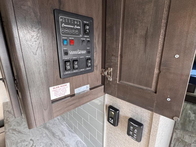 With any Reflection 150 Series fifth wheel by Grand Design, there is more available payload capacity and a broader range of half-ton trucks capable of towing this fifth wheel, and no slider hitch is needed thanks to the 90-degree turning radius which makes them short bed friendly and easier to tow. The mandatory Ultimate Power package provides a "One-Touch" automatic leveling system and a detachable power cord with LED light for easy setup, plus motion sensor pass-through lighting and entry lighting, and the Tire Linc TPMS will help you stay safe on the road. The interior offers residential luxury from the cabinetry and gunstock hardware plus the booth dinette to the residential-style window treatment. Make your refined decision today!