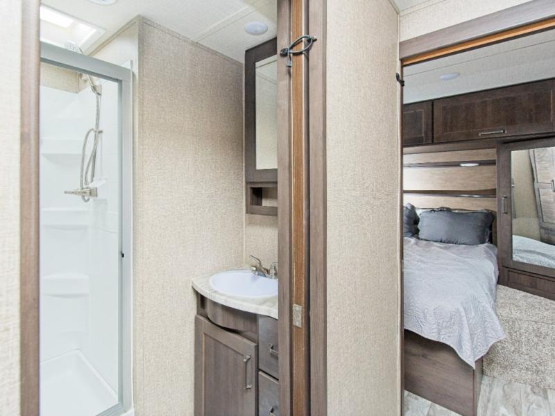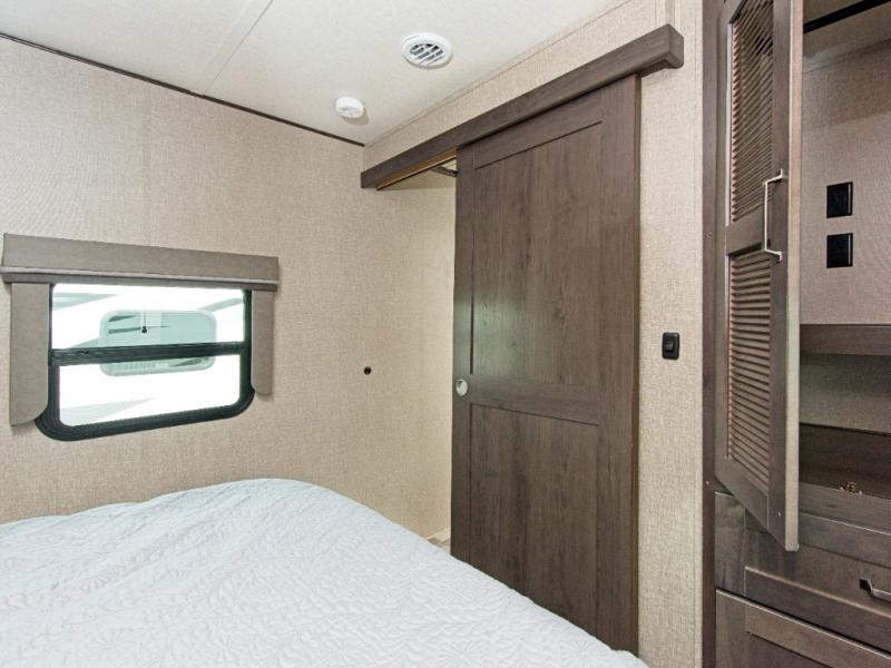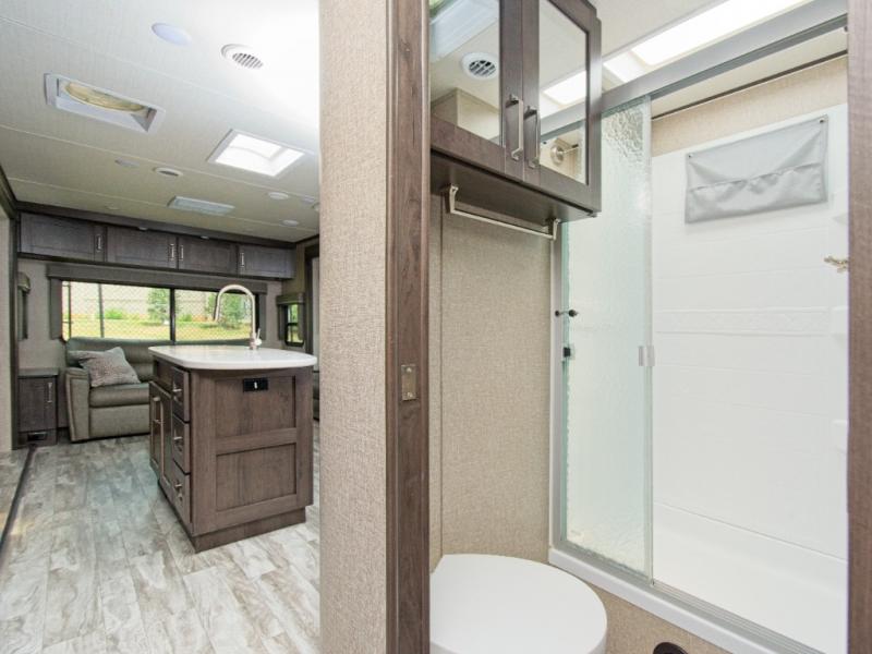 Enjoy 7-foot maximum headroom, residential 5" truss rafters, and walk-on roof decking. Inside, you'll find premium Congoleum flooring, LED lighting, and a space-saving sliding bathroom door with linen storage.