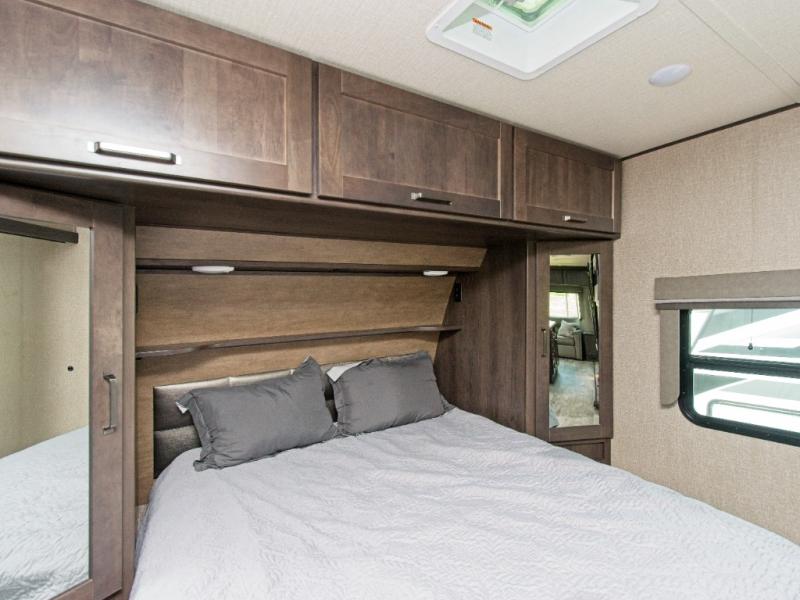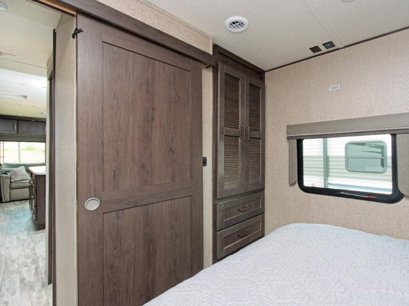 The front private bedroom includes a walk-around queen bed, dual wardrobes, and an additional wardrobe with drawers. Plus, it's washer/dryer prepped, making long-term stays even more convenient.
