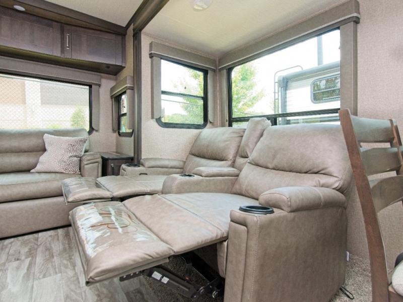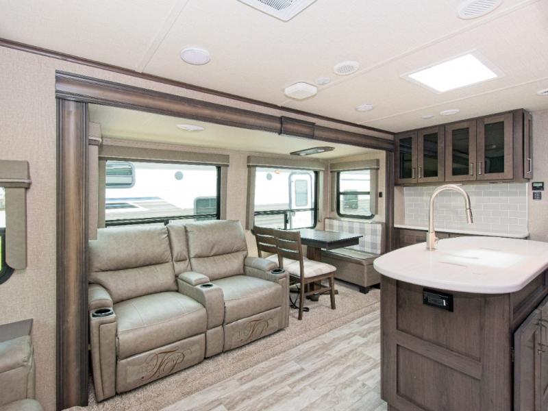 Unwind in the rear living area featuring a tri-fold sofa, theater seating with cupholders, and a booth or optional free-standing dinette—perfect for movie nights by the fireplace and 40" LED HDTV. The hutch with overhead cabinets adds extra storage and style to your kitchen space.