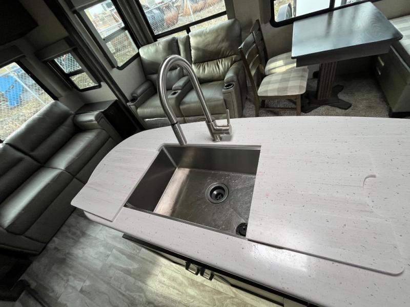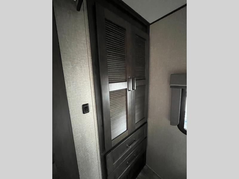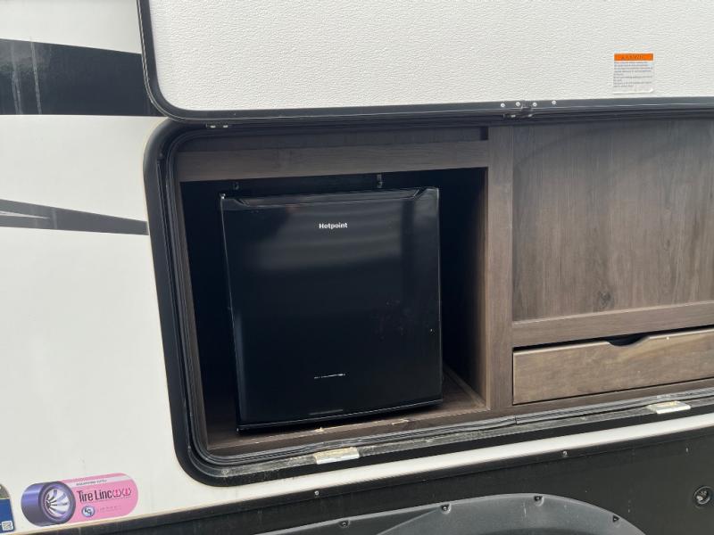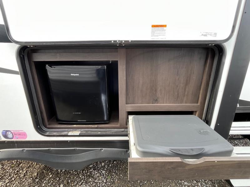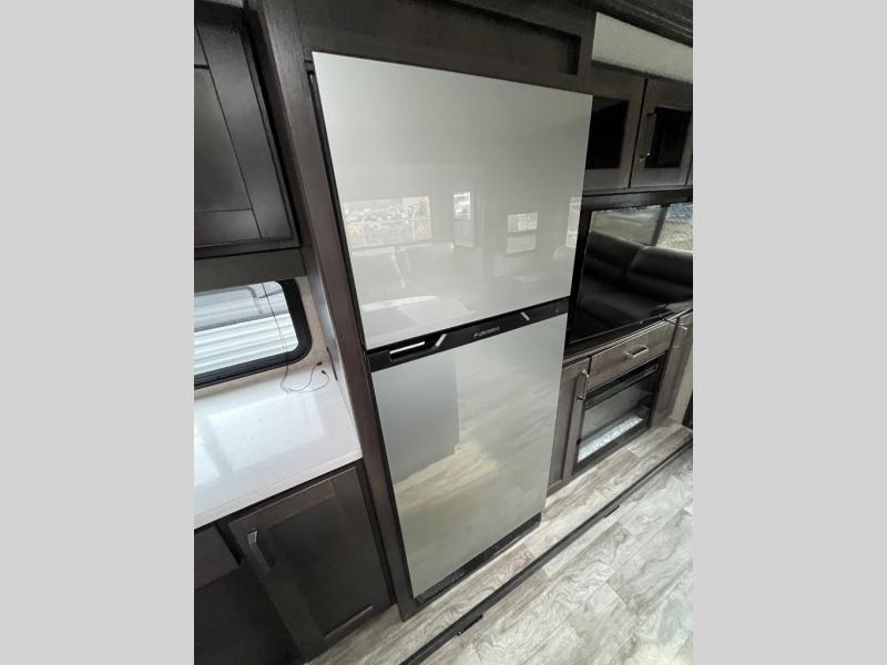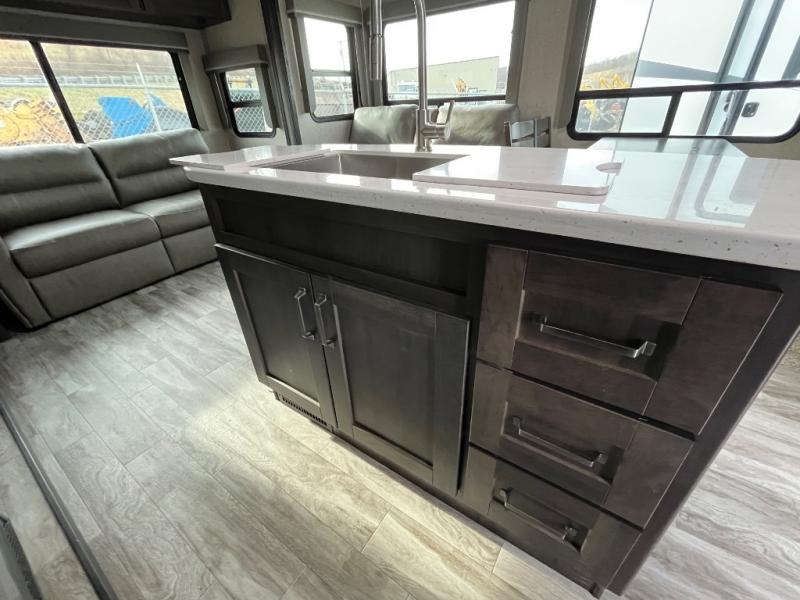 Whether you travel to explore or relax, this trailer will give you the choice depending where you park it! The outside kitchen provides another place to make meals when you want to be in the outdoors, and the inside kitchen amenities offer a gourmet kitchen including a 10 cu. ft. refrigerator, an island, and a hutch. You and your guests will find theatre seating with cupholders, a booth dinette or choose a free standing dinette option, and a tri-fold sofa to sit on and visit while you watch the 40" LED HDTV with fireplace below. The full bathroom includes a space savings sliding door and linen storage, and the bedroom gives you a front walk-around queen bed with storage for your clothes on each side, plus there is an additional wardrobe with drawers and the option to add a washer/dryer to the prepped space.