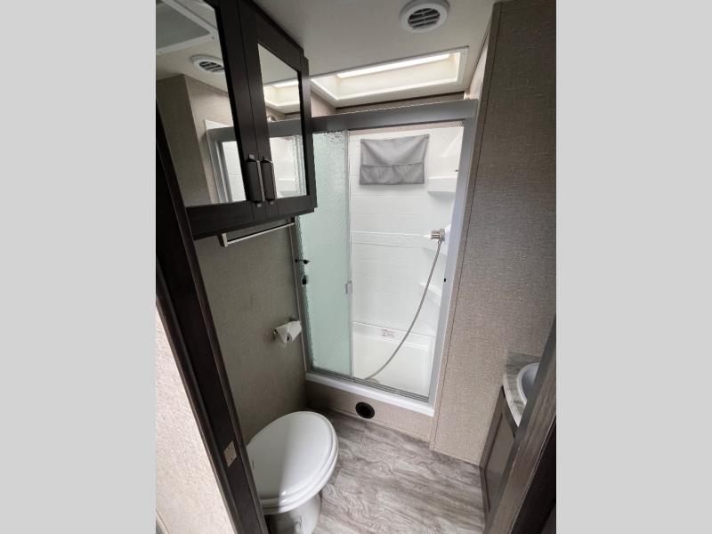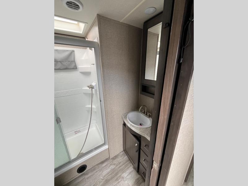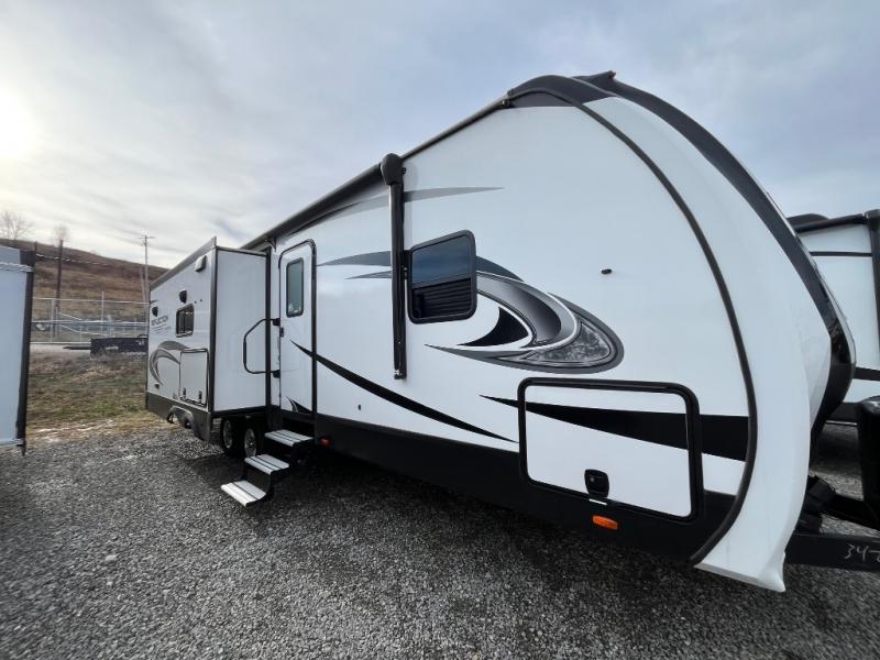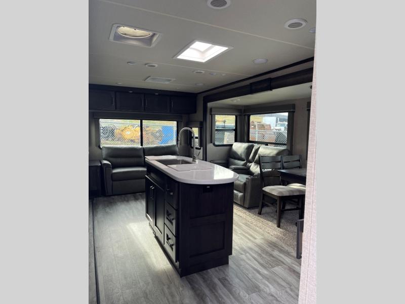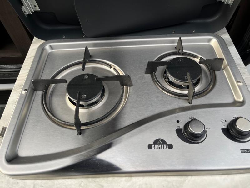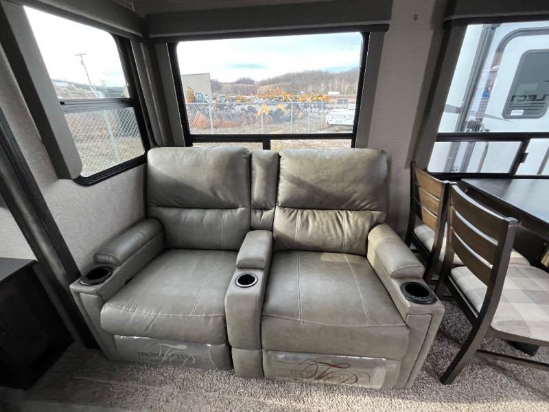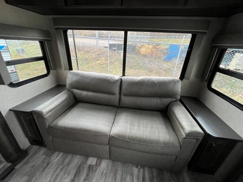 Whether you travel to explore or relax, this trailer will give you the choice depending where you park it! The outside kitchen provides another place to make meals when you want to be in the outdoors, and the inside kitchen amenities offer a gourmet kitchen including a 10 cu. ft. refrigerator, an island, and a hutch. You and your guests will find theatre seating with cupholders, a booth dinette or choose a free standing dinette option, and a tri-fold sofa to sit on and visit while you watch the 40" LED HDTV with fireplace below. The full bathroom includes a space savings sliding door and linen storage, and the bedroom gives you a front walk-around queen bed with storage for your clothes on each side, plus there is an additional wardrobe with drawers and the option to add a washer/dryer to the prepped space.