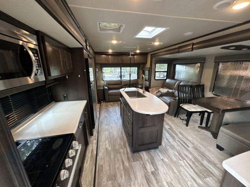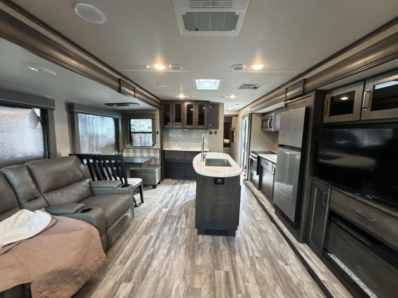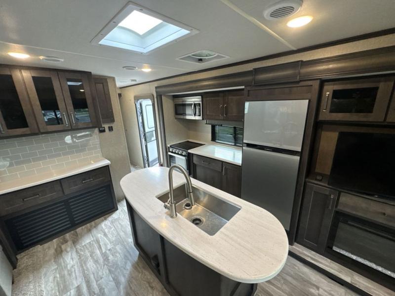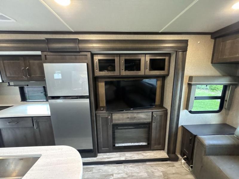Whether you travel to explore or relax, this trailer will give you the choice depending where you park it! The outside kitchen provides another place to make meals when you want to be in the outdoors, and the inside kitchen amenities offer a gourmet kitchen including a 10 cu. ft. refrigerator, an island, and a hutch. You and your guests will find theatre seating with cupholders, a booth dinette or choose a free standing dinette option, and a tri-fold sofa to sit on and visit while you watch the 40" LED HDTV with fireplace below. The full bathroom includes a space savings sliding door and linen storage, and the bedroom gives you a front walk-around queen bed with storage for your clothes on each side, plus there is an additional wardrobe with drawers and the option to add a washer/dryer to the prepped space.