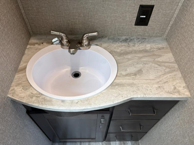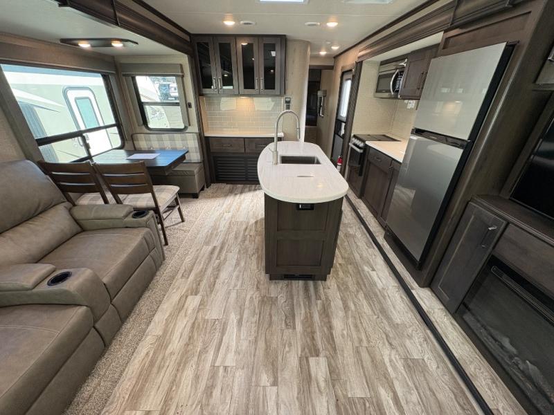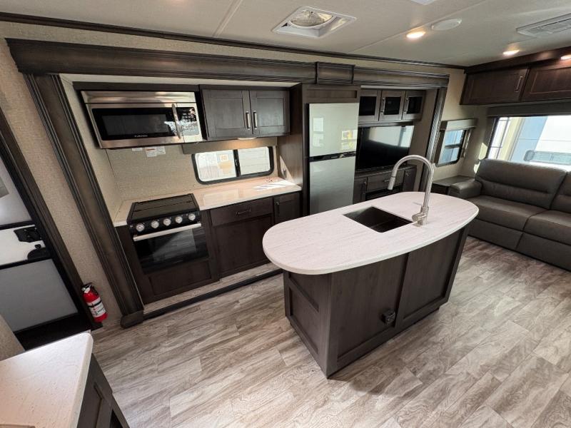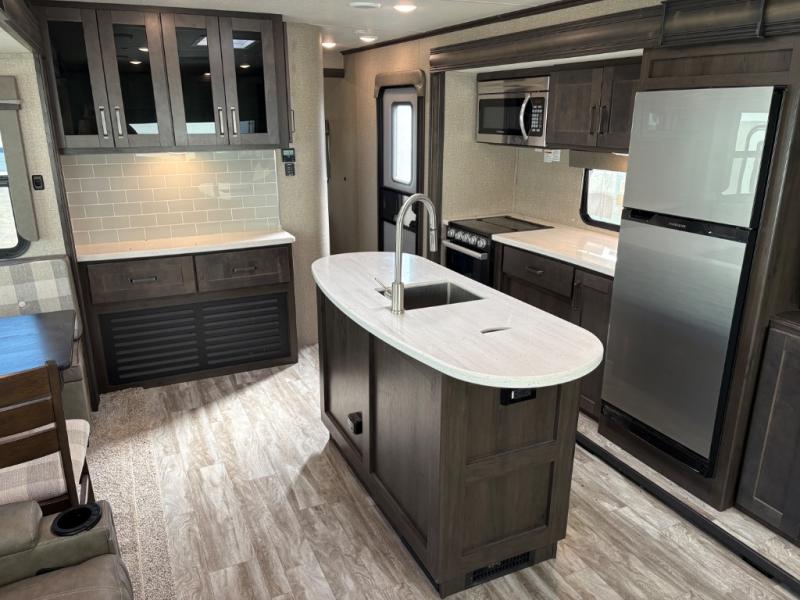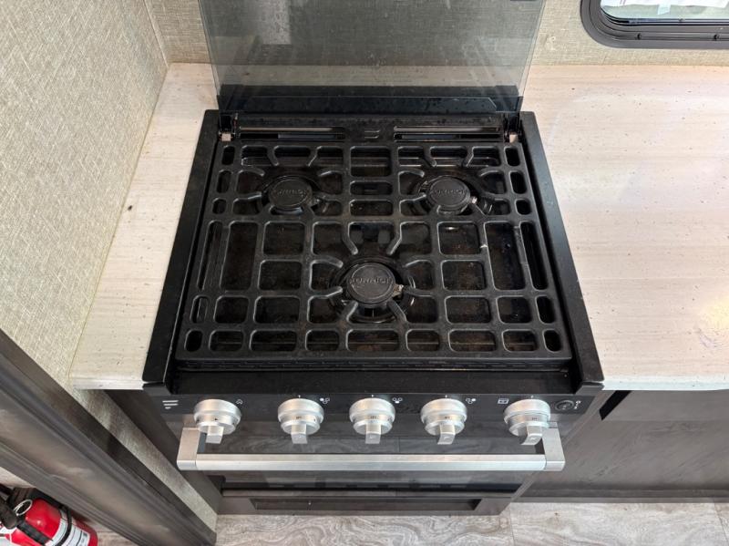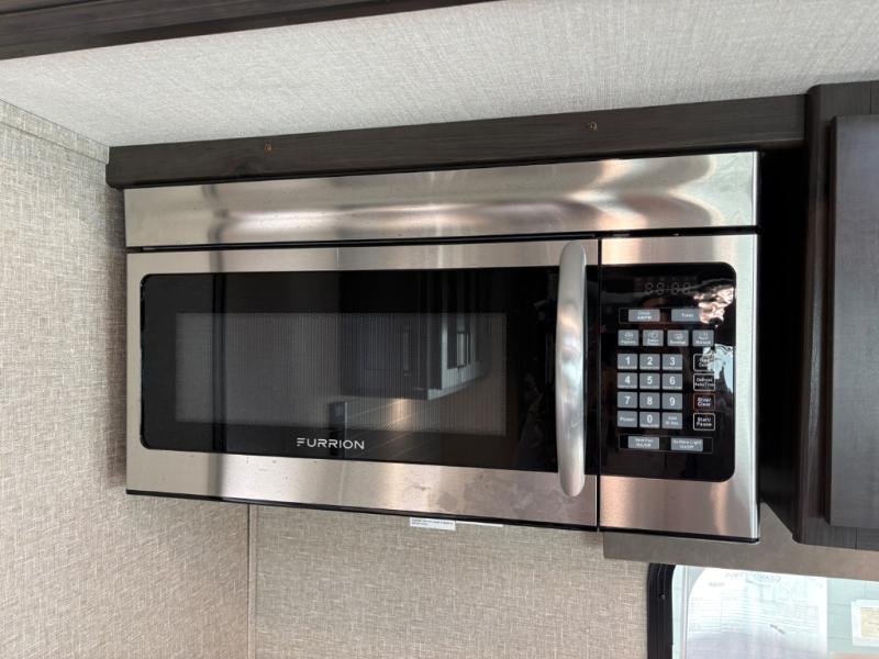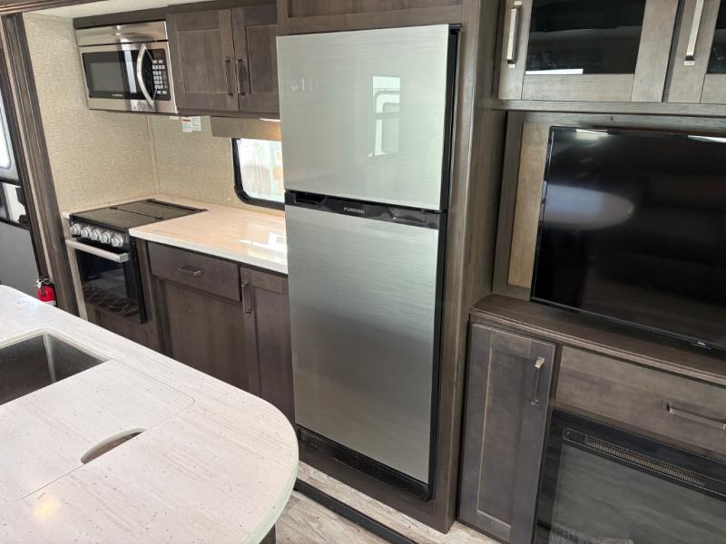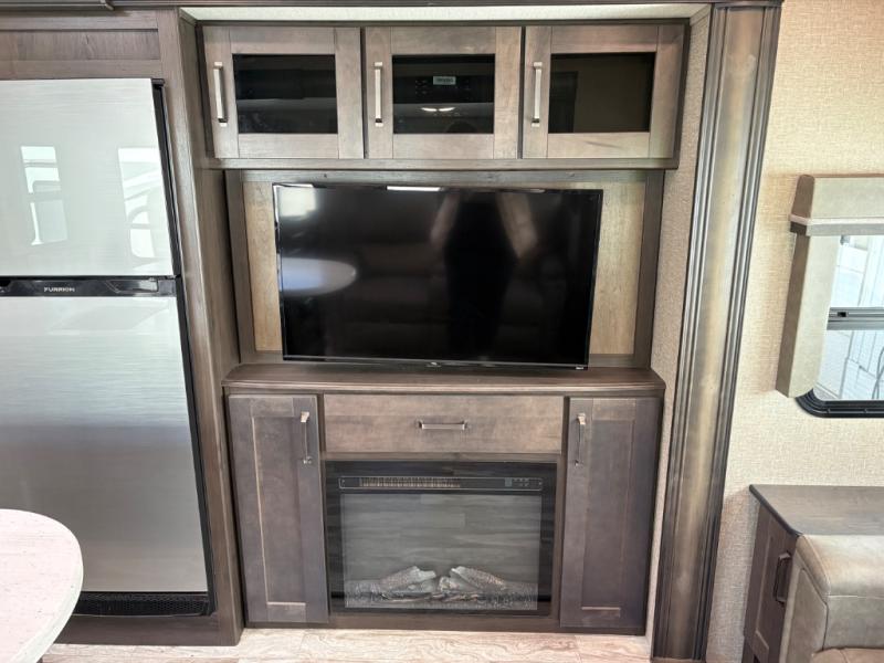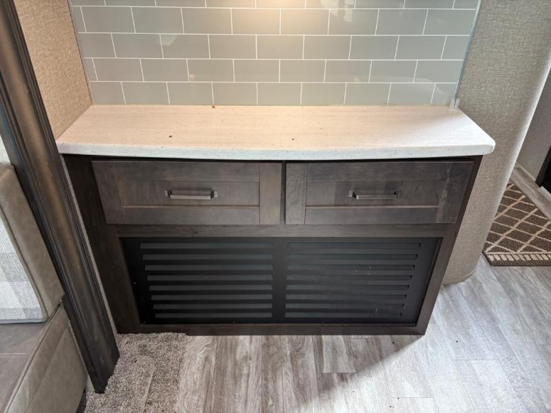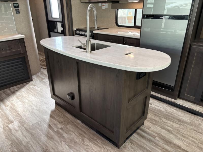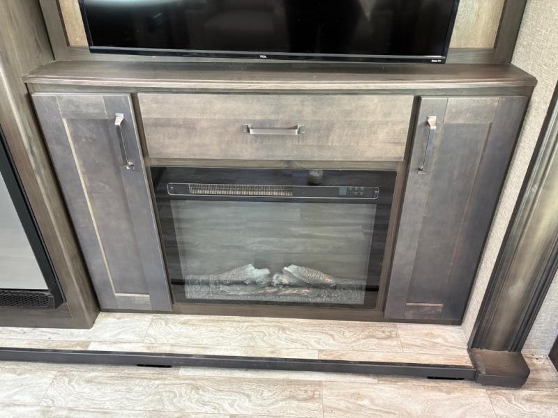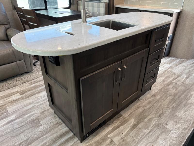 Whether you travel to explore or relax, this trailer will give you the choice depending where you park it! The outside kitchen provides another place to make meals when you want to be in the outdoors, and the inside kitchen amenities offer a gourmet kitchen including a 10 cu. ft. refrigerator, an island, and a hutch. You and your guests will find theatre seating with cupholders, a booth dinette or choose a free standing dinette option, and a tri-fold sofa to sit on and visit while you watch the 40" LED HDTV with fireplace below. The full bathroom includes a space savings sliding door and linen storage, and the bedroom gives you a front walk-around queen bed with storage for your clothes on each side, plus there is an additional wardrobe with drawers and the option to add a washer/dryer to the prepped space.