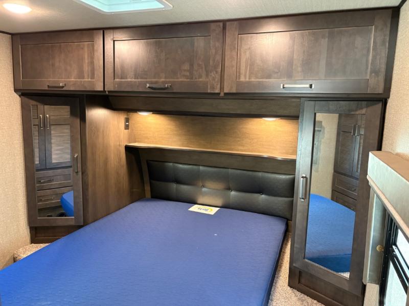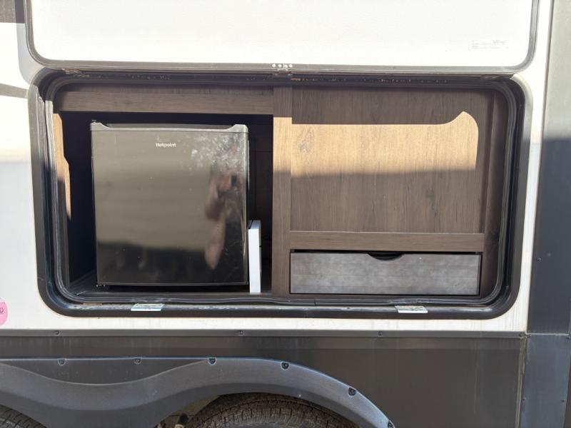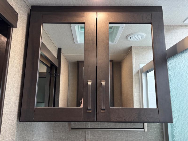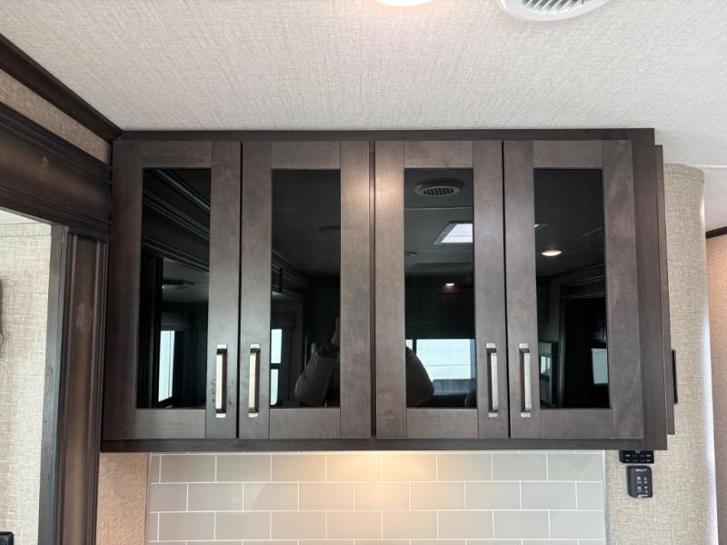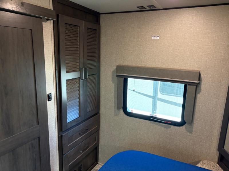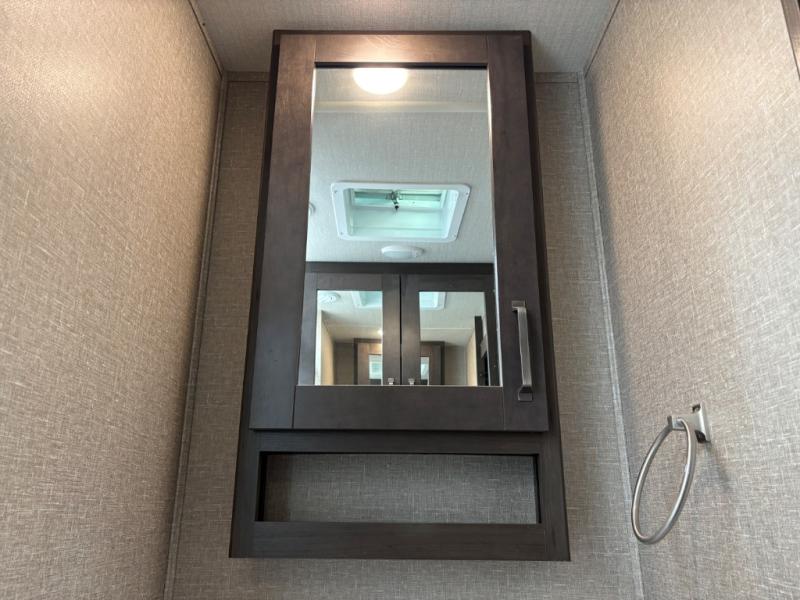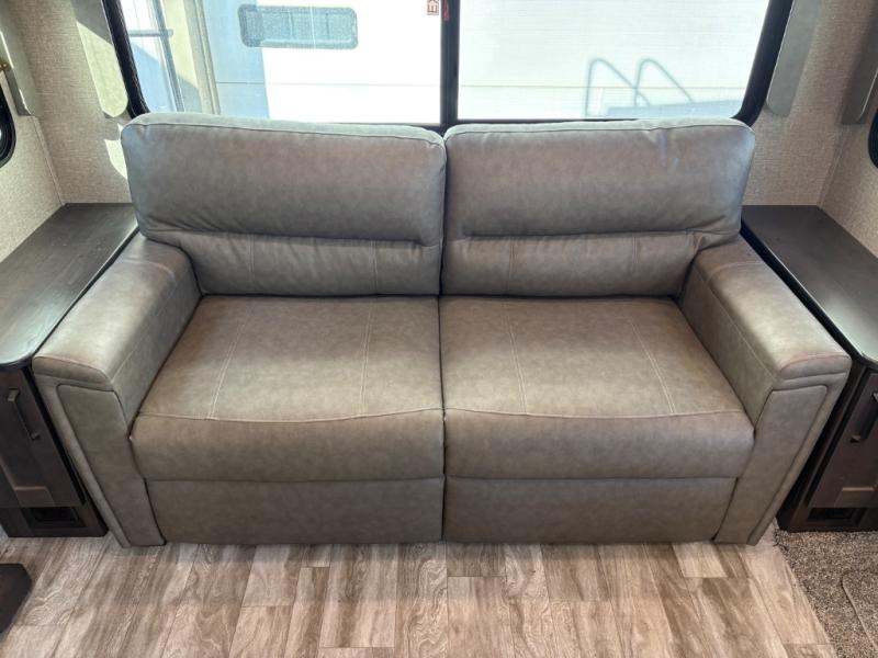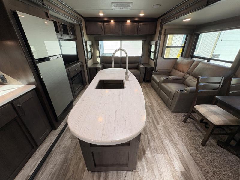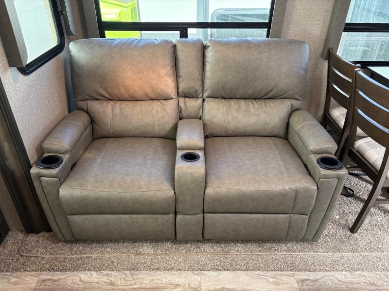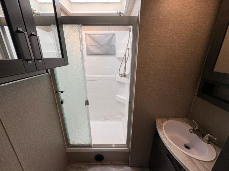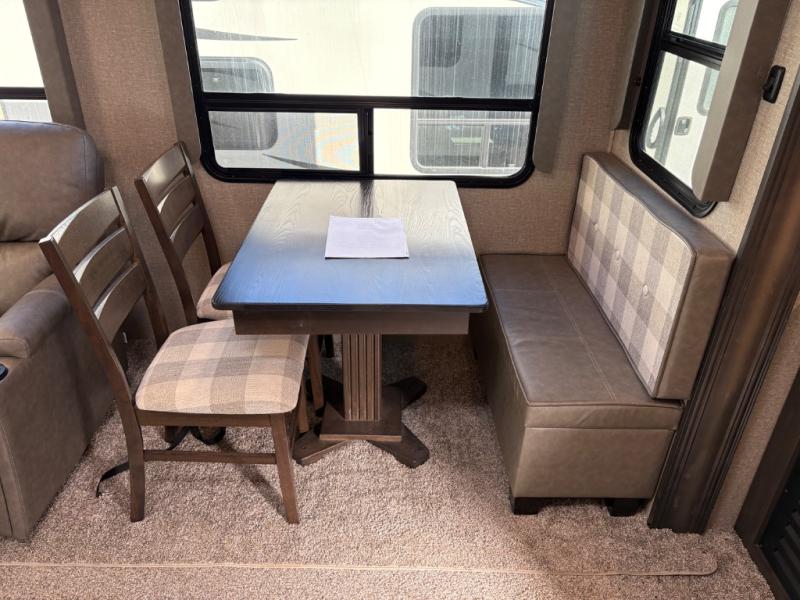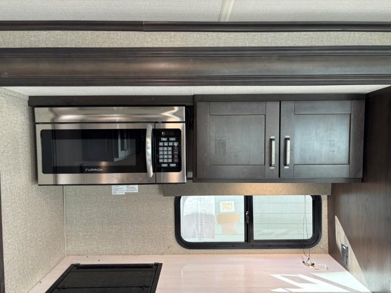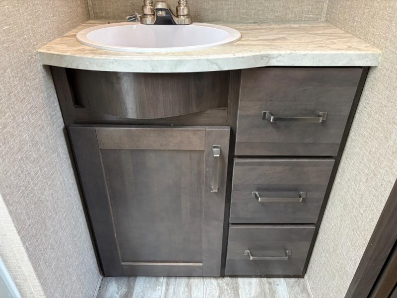 Whether you travel to explore or relax, this trailer will give you the choice depending where you park it! The outside kitchen provides another place to make meals when you want to be in the outdoors, and the inside kitchen amenities offer a gourmet kitchen including a 10 cu. ft. refrigerator, an island, and a hutch. You and your guests will find theatre seating with cupholders, a booth dinette or choose a free standing dinette option, and a tri-fold sofa to sit on and visit while you watch the 40" LED HDTV with fireplace below. The full bathroom includes a space savings sliding door and linen storage, and the bedroom gives you a front walk-around queen bed with storage for your clothes on each side, plus there is an additional wardrobe with drawers and the option to add a washer/dryer to the prepped space.