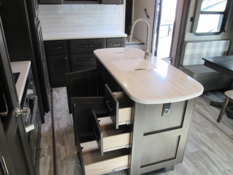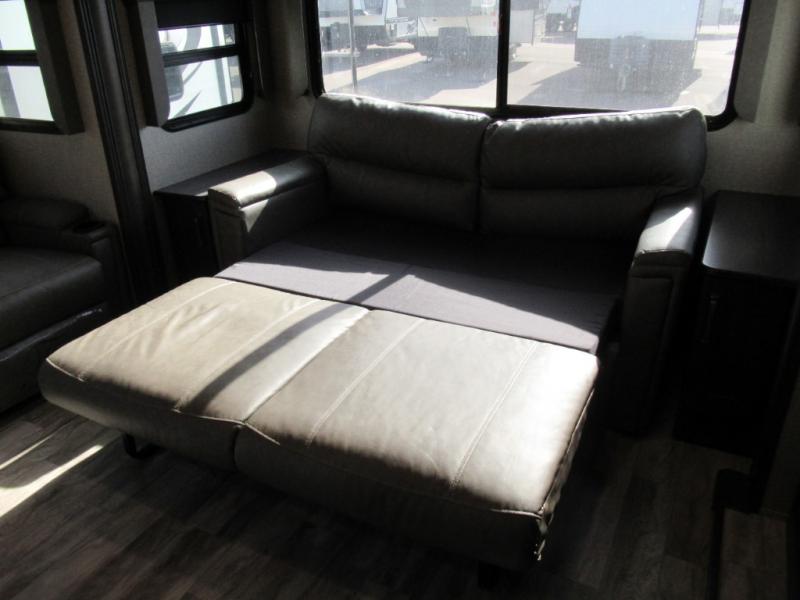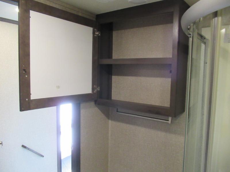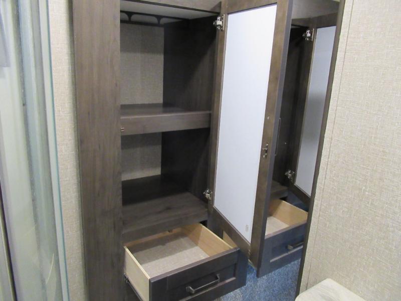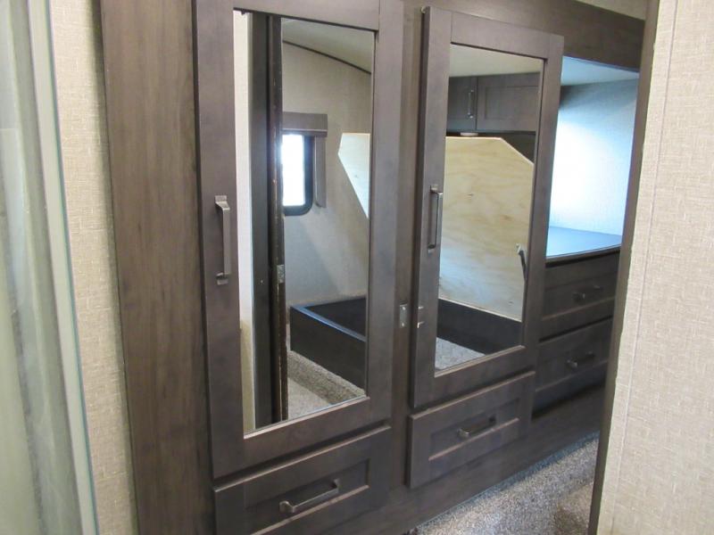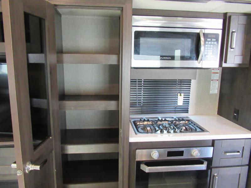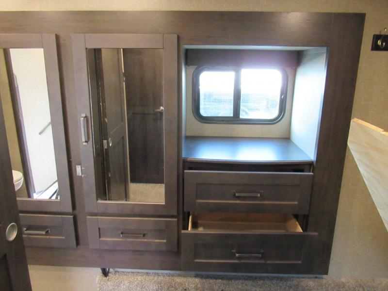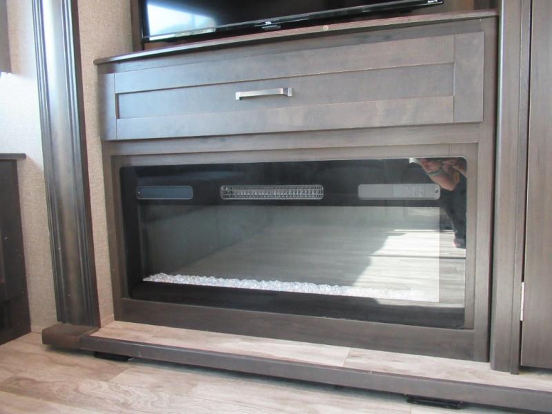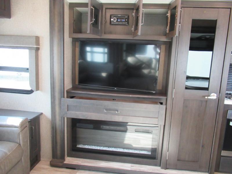 Whether you travel for pleasure or work, you will love the spacious main living and kitchen area with a rear tri-fold sofa that doubles as extra sleeping space, and the theatre seating directly across from the entertainment center with a 40" LED HDTV and a fireplace below. The kitchen island will make meal prepping and drying the dishes easier and the hutch is the perfect place to place your picture frames, nice dishes, and extra cooking items, plus the pantry is big enough to store all of your favorite snacks, dry ingredients and such. Outside you can enjoy two electric awnings that provide protection from the elements as you relax and visit with other RVers, and your camping chairs can easily be stored in the pass-through compartment. The double entry bathroom is convenient especially at night when you can slide the door to enter from the front master bedroom. You will find plenty of storage for your clothing and things, plus the bedroom slide out gives you drawers and linen storage that stretches into the full bathroom.