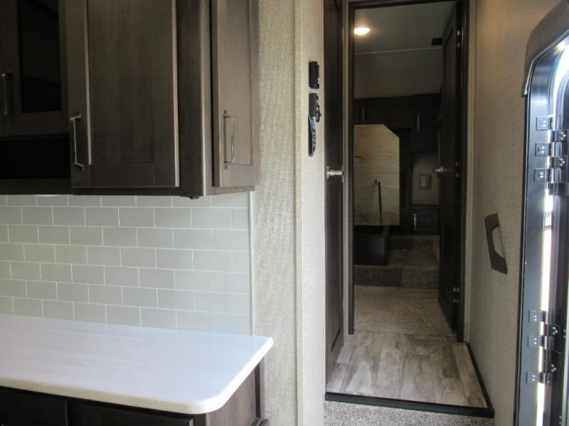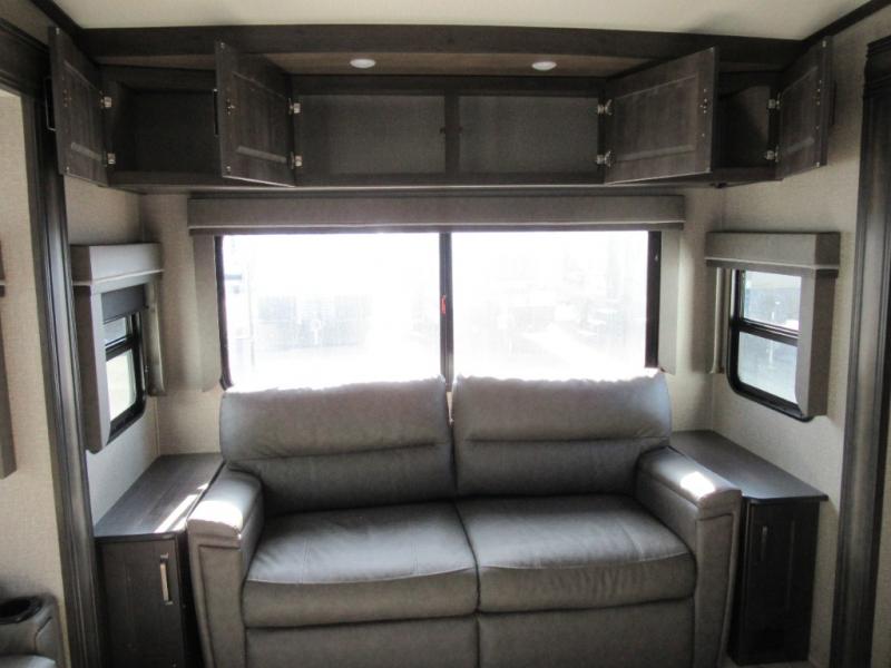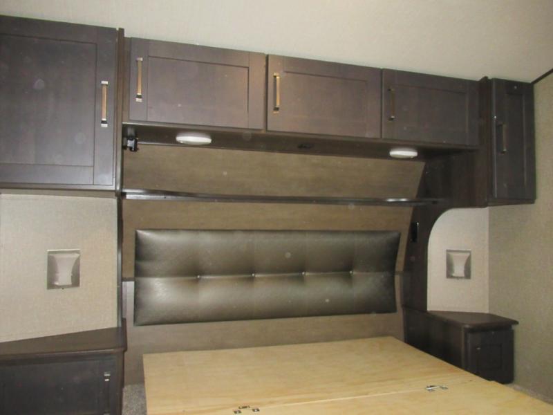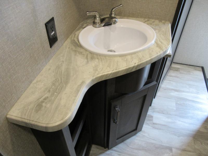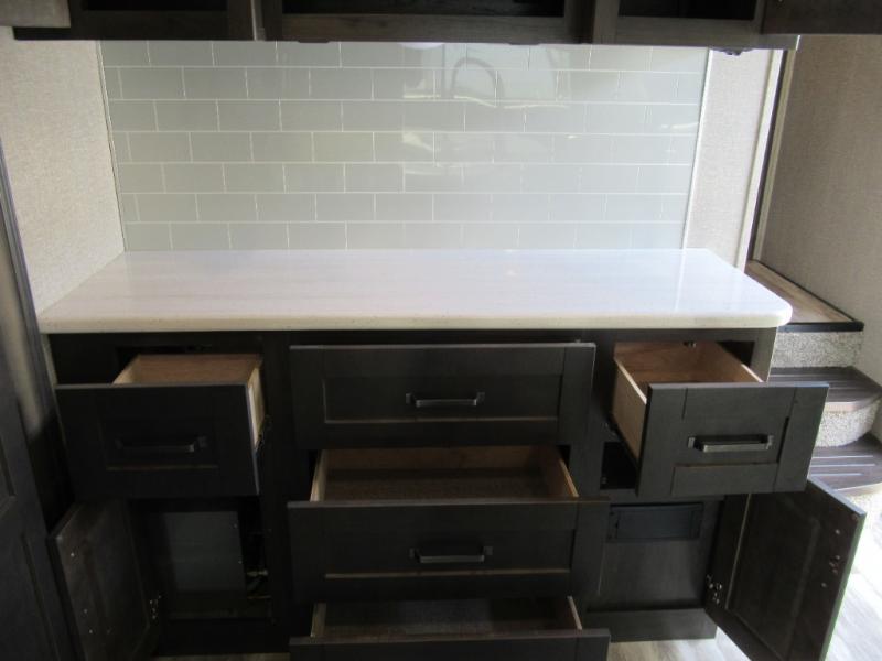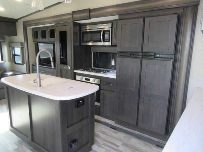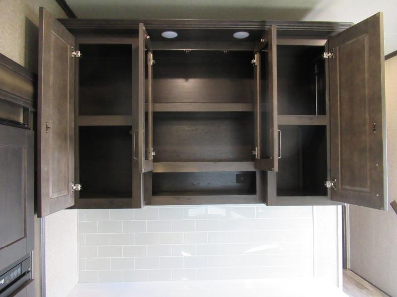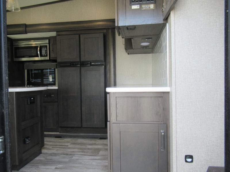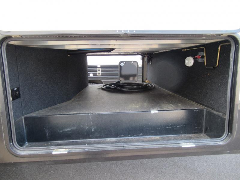 Whether you travel for pleasure or work, you will love the spacious main living and kitchen area with a rear tri-fold sofa that doubles as extra sleeping space, and the theatre seating directly across from the entertainment center with a 40" LED HDTV and a fireplace below. The kitchen island will make meal prepping and drying the dishes easier and the hutch is the perfect place to place your picture frames, nice dishes, and extra cooking items, plus the pantry is big enough to store all of your favorite snacks, dry ingredients and such. Outside you can enjoy two electric awnings that provide protection from the elements as you relax and visit with other RVers, and your camping chairs can easily be stored in the pass-through compartment. The double entry bathroom is convenient especially at night when you can slide the door to enter from the front master bedroom. You will find plenty of storage for your clothing and things, plus the bedroom slide out gives you drawers and linen storage that stretches into the full bathroom.