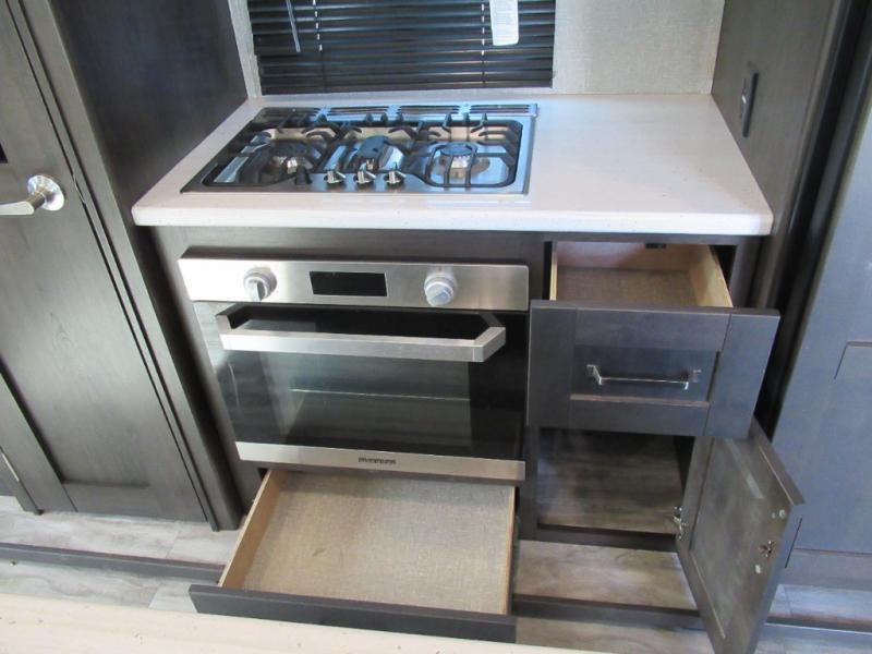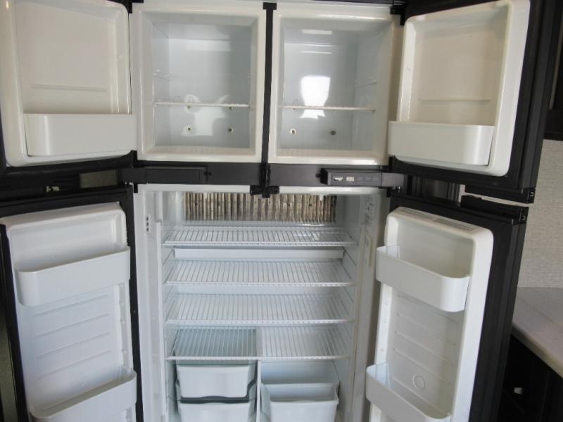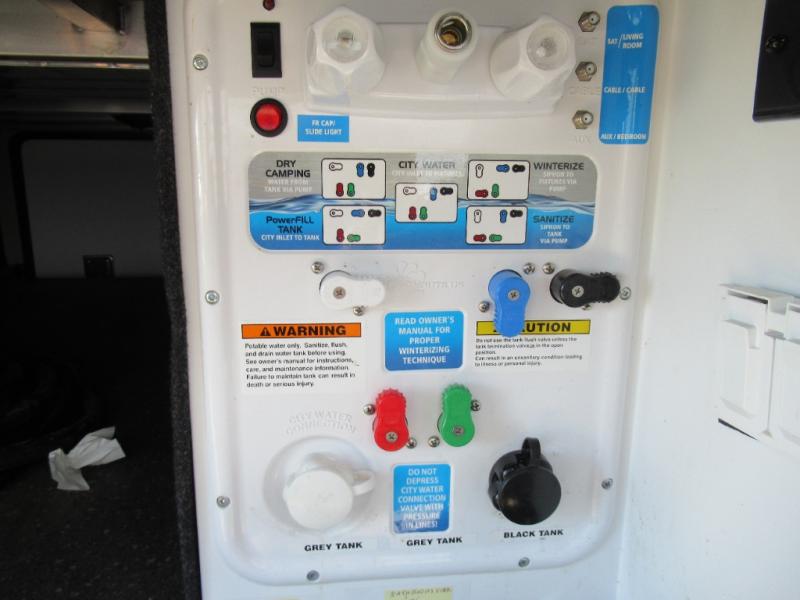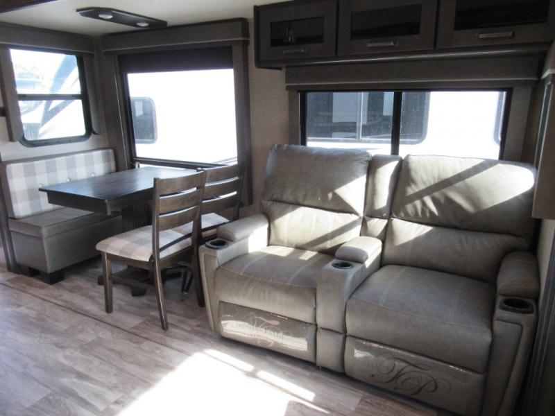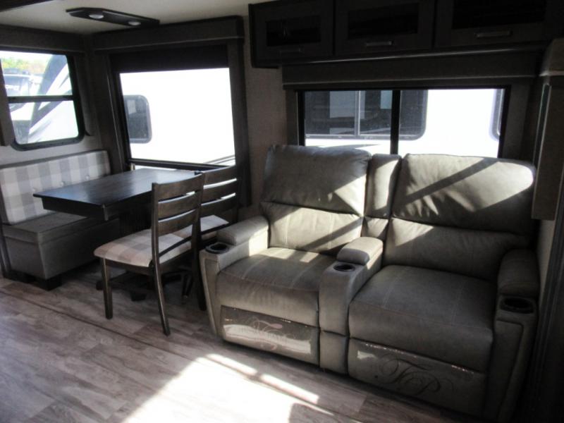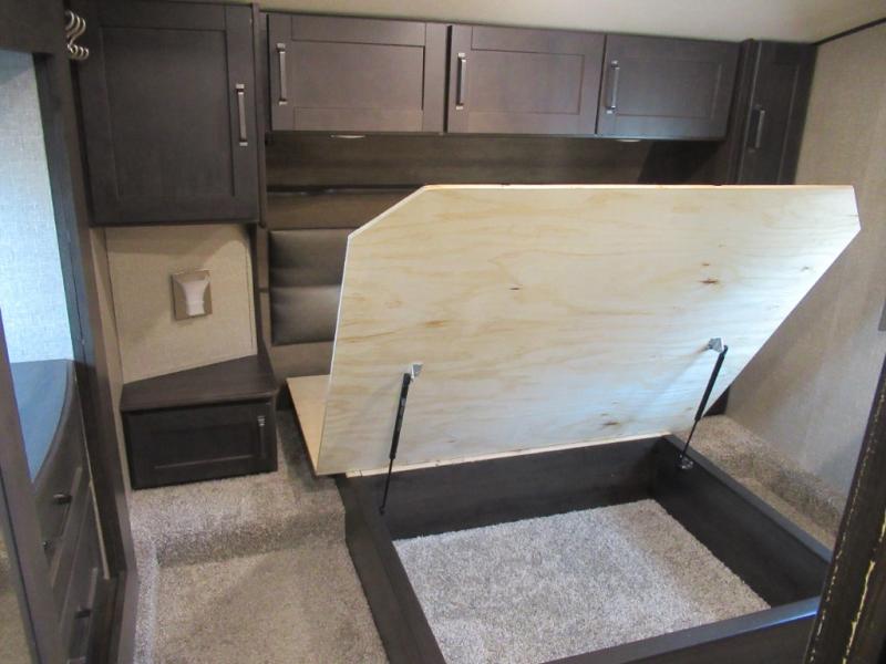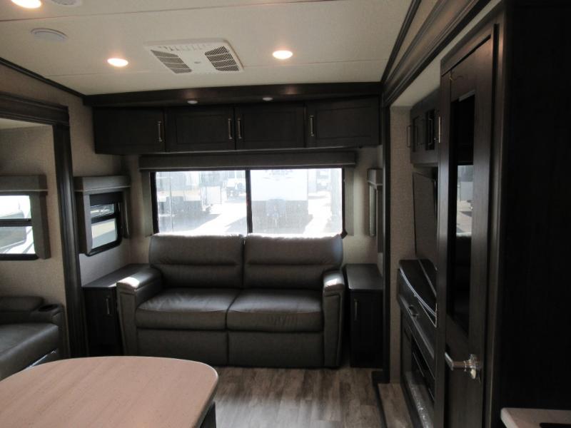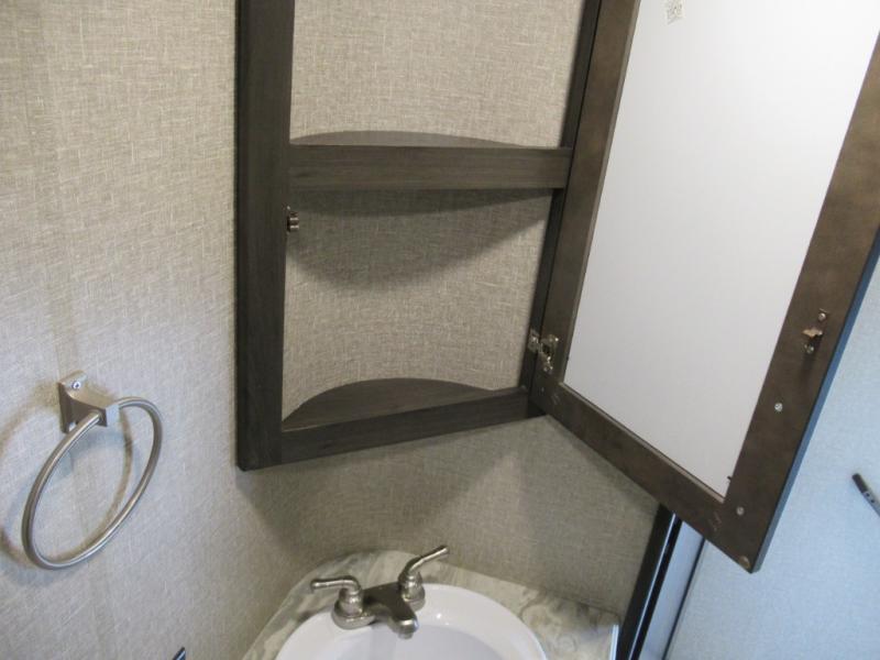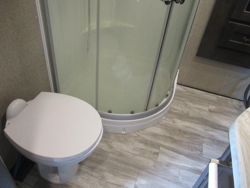Whether you travel for pleasure or work, you will love the spacious main living and kitchen area with a rear tri-fold sofa that doubles as extra sleeping space, and the theatre seating directly across from the entertainment center with a 40" LED HDTV and a fireplace below. The kitchen island will make meal prepping and drying the dishes easier and the hutch is the perfect place to place your picture frames, nice dishes, and extra cooking items, plus the pantry is big enough to store all of your favorite snacks, dry ingredients and such. Outside you can enjoy two electric awnings that provide protection from the elements as you relax and visit with other RVers, and your camping chairs can easily be stored in the pass-through compartment. The double entry bathroom is convenient especially at night when you can slide the door to enter from the front master bedroom. You will find plenty of storage for your clothing and things, plus the bedroom slide out gives you drawers and linen storage that stretches into the full bathroom.