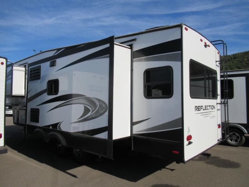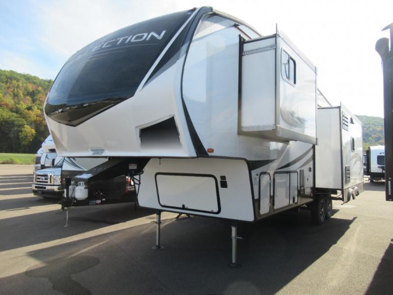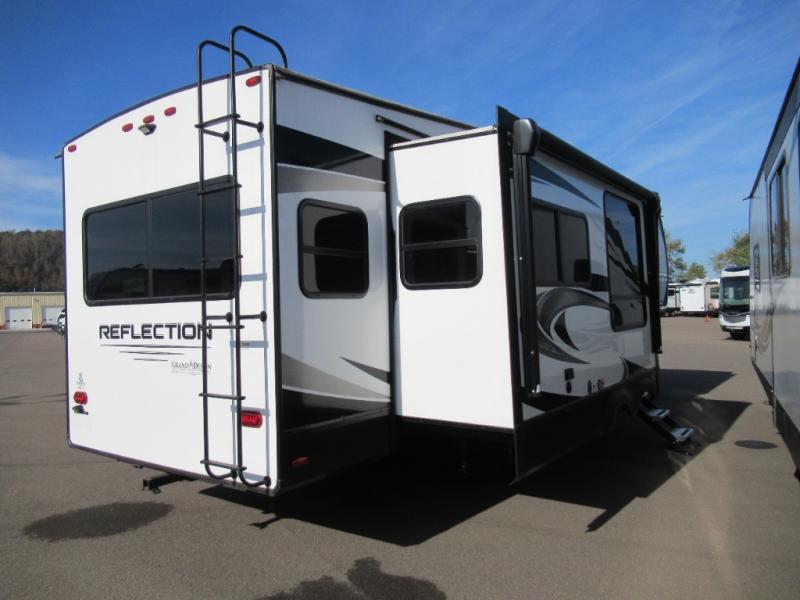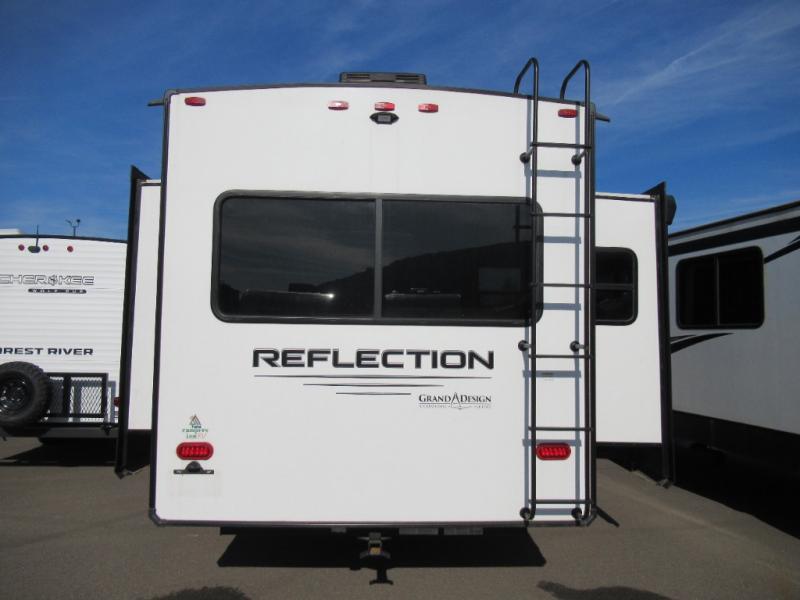 With any Reflection fifth wheels by Grand Design, you will have a 165W solar panel for off-grid camping and a 50 Amp charge controller and inverter prep, a Max Turn radius front cap for easy towing around town and into your campsite, a Universal All-In-One Docking Station, unobstructed pass-through storage, and Goodyear E-rated tires. Some other top features include a chef's kitchen with a 30" stainless steel microwave and residential cooktop, a USB charging station, and the ductless "Evenflow" heating system with no vents in the floor to collect debris. Each is constructed of high gloss gel coat exterior sidewalls, residential 5" truss rafters, walk-on roof decking, a fiberglass and radiant foil roof and front cap insulation plus laminated aluminum framed side walls, rear wall, roof and end walls in slide rooms. Choose luxury, value and towability over all the others, take home a Reflection of your good taste!