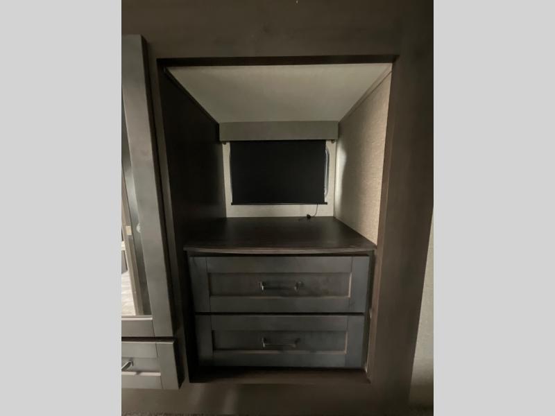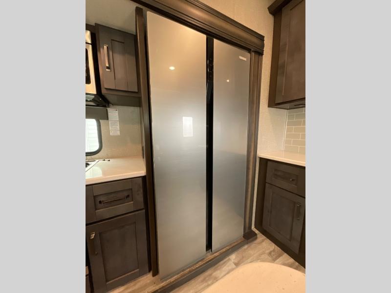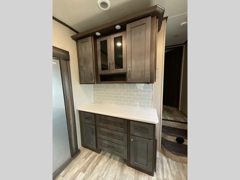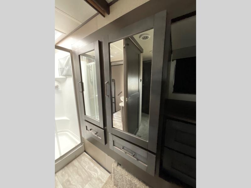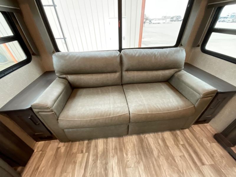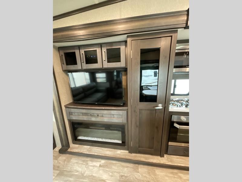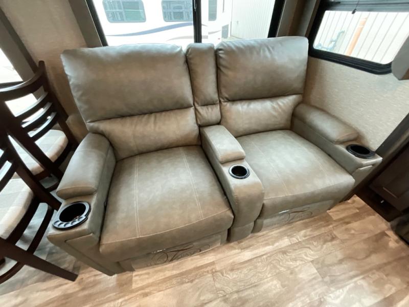 Whether you travel for pleasure or work, you will love the spacious main living and kitchen area with a rear tri-fold sofa that doubles as extra sleeping space, and the theatre seating directly across from the entertainment center with a 40" LED HDTV and a fireplace below. The kitchen island will make meal prepping and drying the dishes easier and the hutch is the perfect place to place your picture frames, nice dishes, and extra cooking items, plus the pantry is big enough to store all of your favorite snacks, dry ingredients and such. Outside you can enjoy two electric awnings that provide protection from the elements as you relax and visit with other RVers, and your camping chairs can easily be stored in the pass-through compartment. The double entry bathroom is convenient especially at night when you can slide the door to enter from the front master bedroom. You will find plenty of storage for your clothing and things, plus the bedroom slide out gives you drawers and linen storage that stretches into the full bathroom.