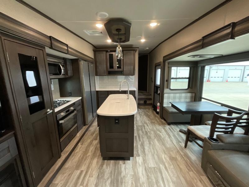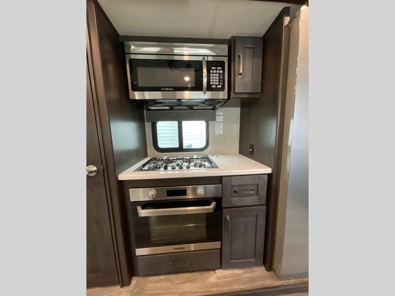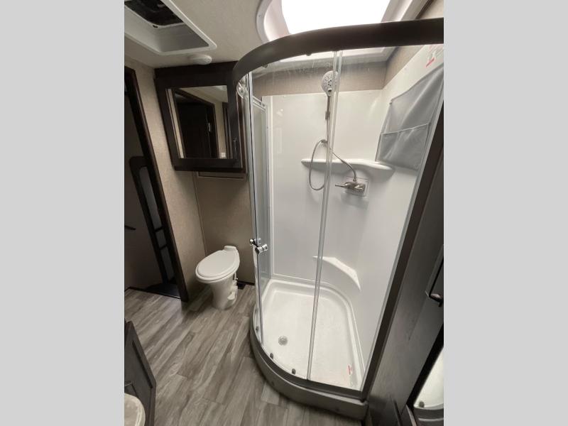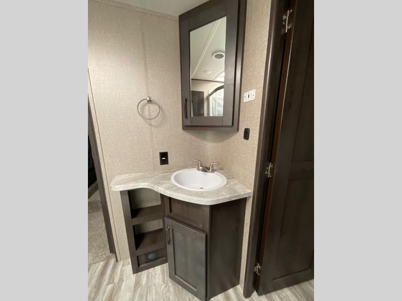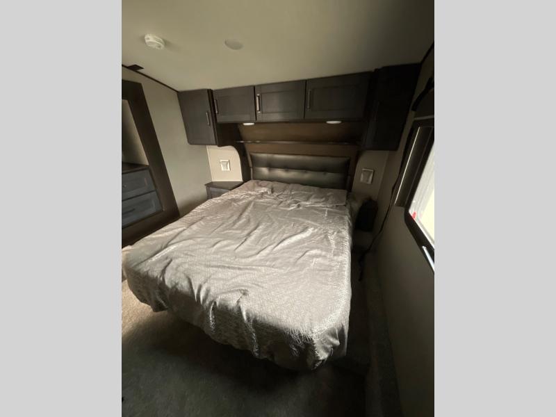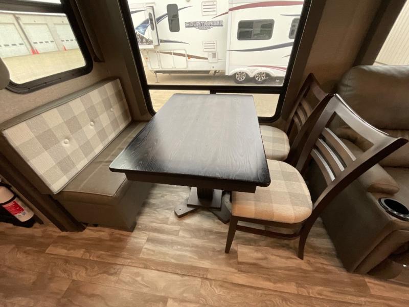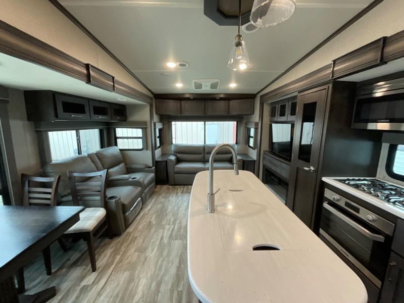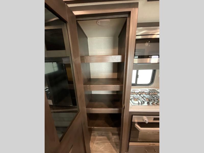 Whether you travel for pleasure or work, you will love the spacious main living and kitchen area with a rear tri-fold sofa that doubles as extra sleeping space, and the theatre seating directly across from the entertainment center with a 40" LED HDTV and a fireplace below. The kitchen island will make meal prepping and drying the dishes easier and the hutch is the perfect place to place your picture frames, nice dishes, and extra cooking items, plus the pantry is big enough to store all of your favorite snacks, dry ingredients and such. Outside you can enjoy two electric awnings that provide protection from the elements as you relax and visit with other RVers, and your camping chairs can easily be stored in the pass-through compartment. The double entry bathroom is convenient especially at night when you can slide the door to enter from the front master bedroom. You will find plenty of storage for your clothing and things, plus the bedroom slide out gives you drawers and linen storage that stretches into the full bathroom.