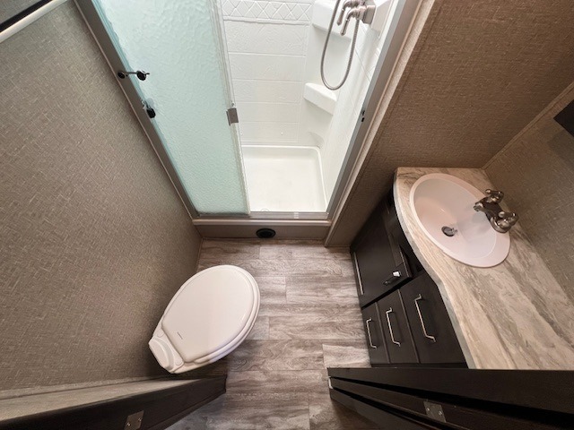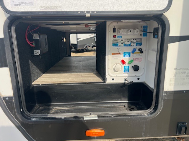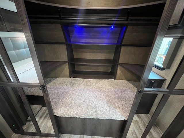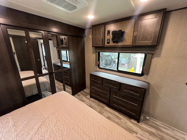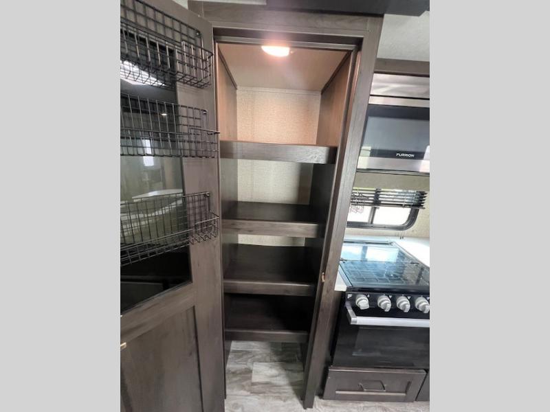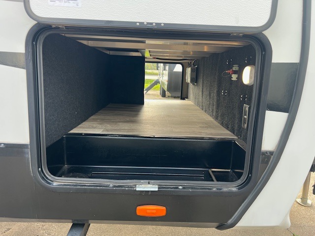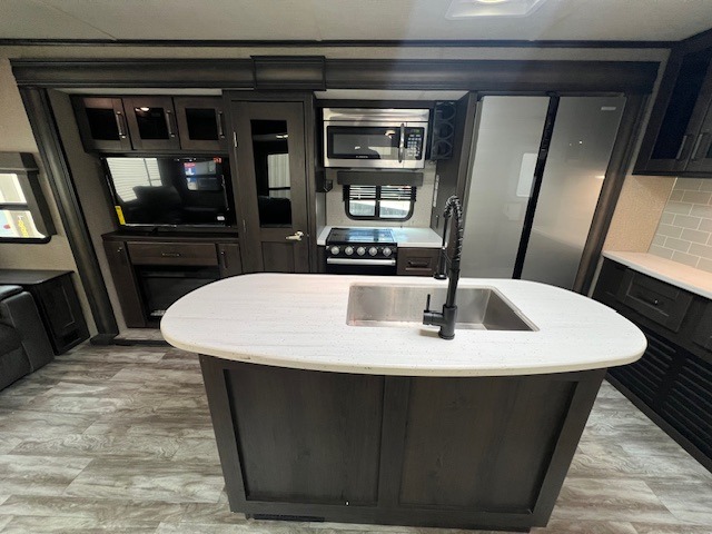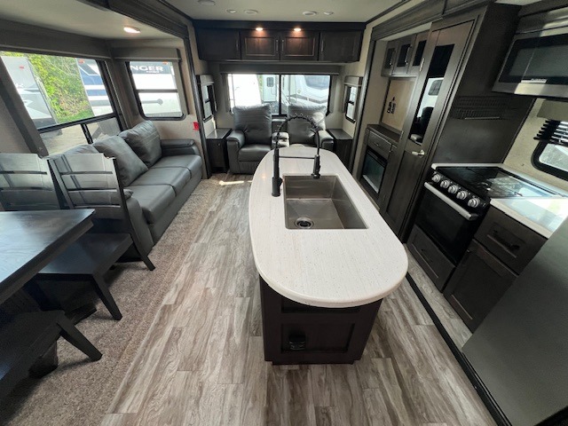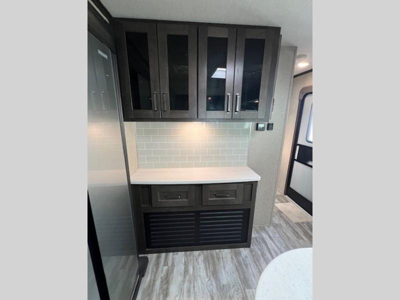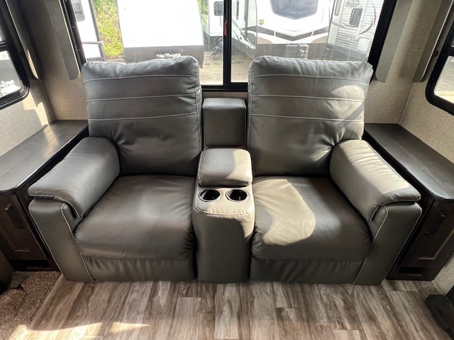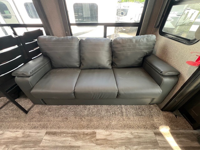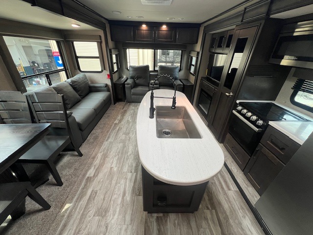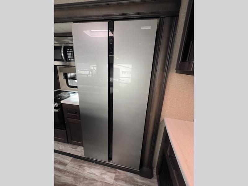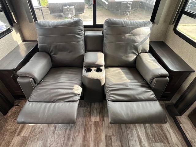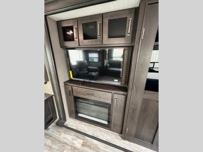 The chef of the group will love the gourmet kitchen including the 16 cu. ft. refrigerator that will hold lots of cold ingredients, beverages and leftovers, the center island when preparing and serving meals, and the hutch with overhead cabinets to display decor and store dishes and such. This area also includes two slide outs for more floor space and furniture to relax on including theatre seating with cupholders for your drinks, a booth dinette to dine at and work from or choose a free standing dinette option, and a rear tri-fold sofa that offers sleeping space for two at night. There is a 40" LED HDTV with fireplace below to enjoy while inside, plus there are two awnings outdoors to relax under. When you are ready to call it a night, get cleaned up in the full bathroom, and retire to your front bedroom with a slide out queen bed or choose a king option, a front full-wall wardrobe with washer/dryer prep, a dresser and an additional wardrobe with drawers.