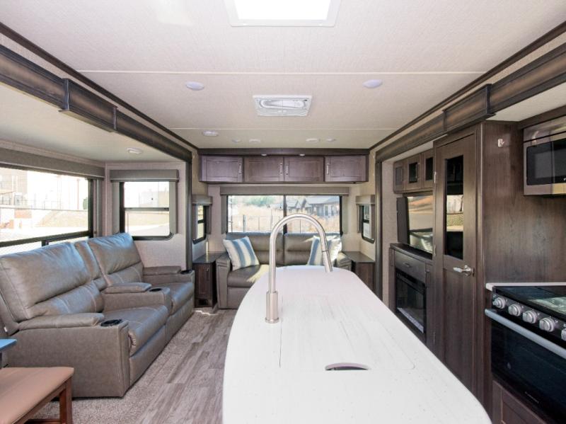 Experience luxury camping with the Grand Design Reflection 315RLTS—featuring a gourmet kitchen with a spacious island and a cozy fireplace for ultimate comfort.