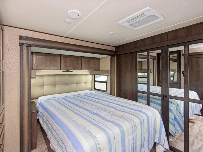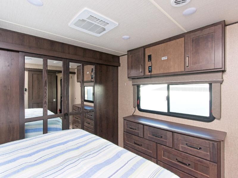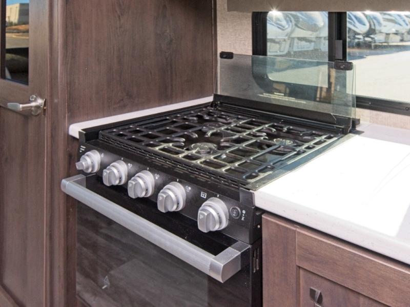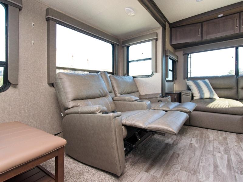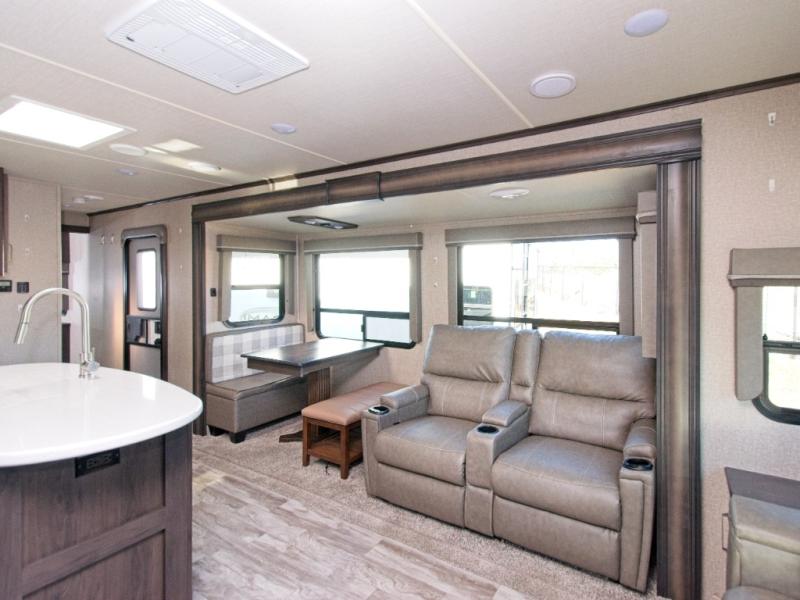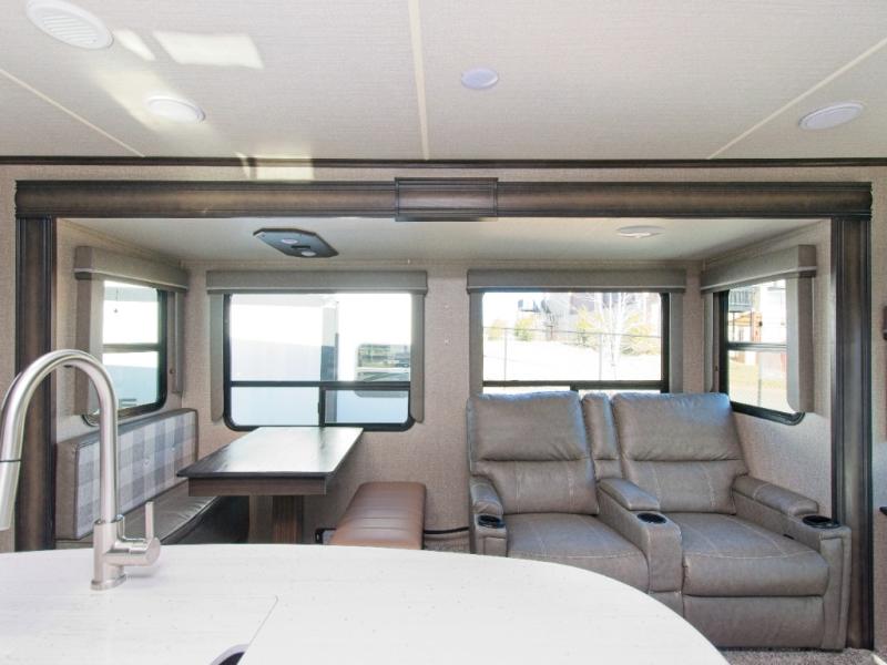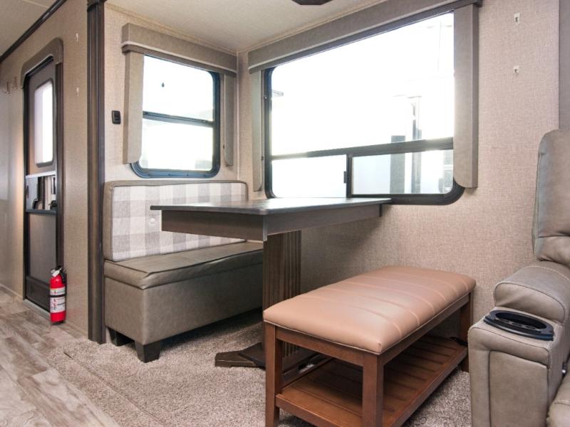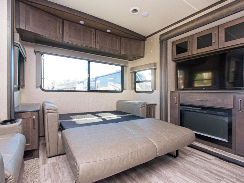 Relax in theatre seating with cupholders, dine at the booth dinette (or upgrade to a free-standing option), and enjoy the rear tri-fold sofa that converts into a bed for guests. Entertainment is top-notch with a 40" LED HDTV and a fireplace for cozy evenings. Outdoors, dual awnings provide shade for your campsite.