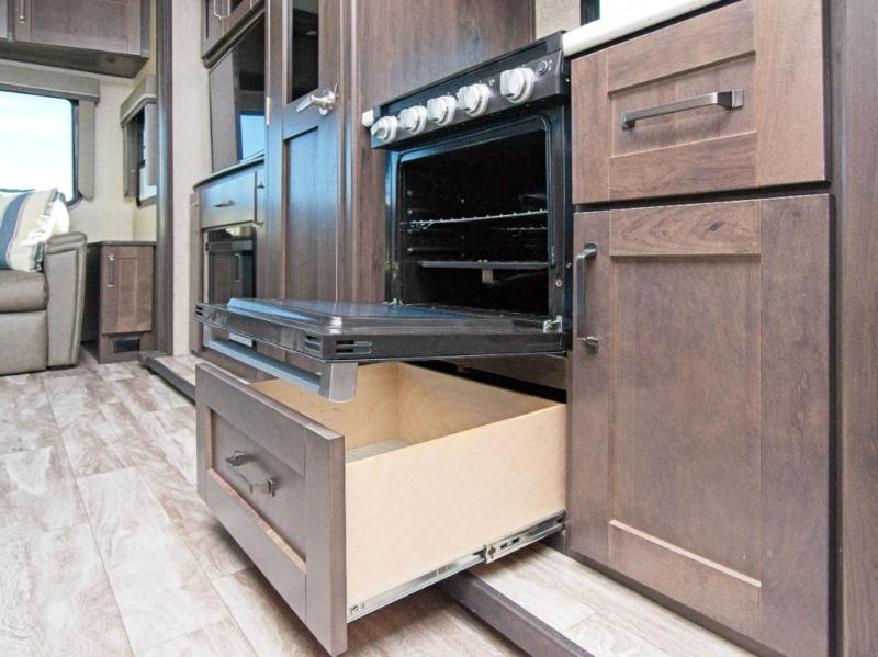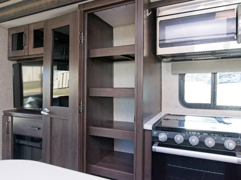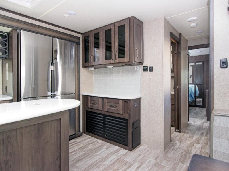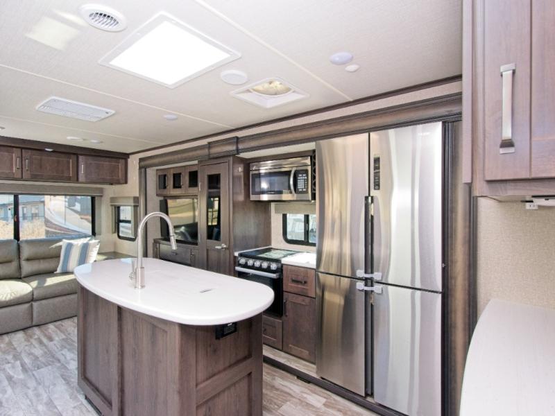 Step inside and experience a chef-inspired kitchen featuring a 16 cu. ft. refrigerator, 30" stainless steel microwave, and a center island for effortless meal prep. The hutch with overhead cabinets adds elegance and storage, while two large slide-outs create an open living space.