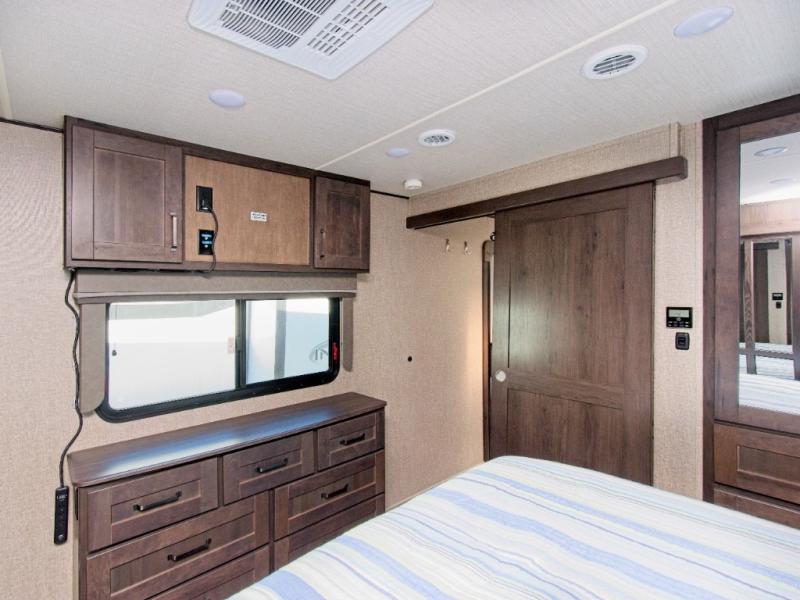 When it’s time to unwind, retreat to the private front bedroom with a queen bed (king option available), a full-wall wardrobe with washer/dryer prep, and additional storage. The spacious bathroom ensures comfort with a large shower and premium fixtures.