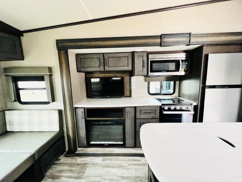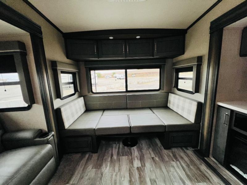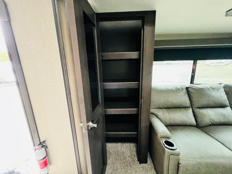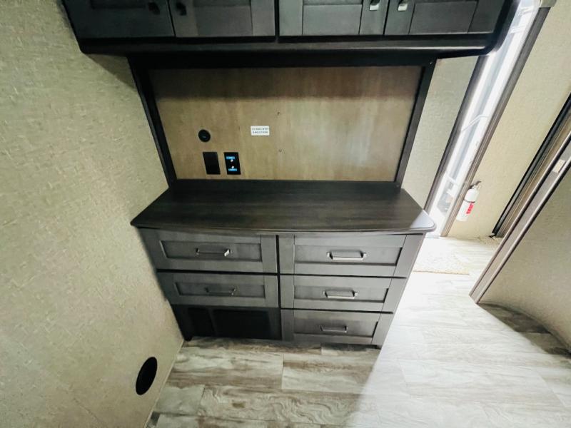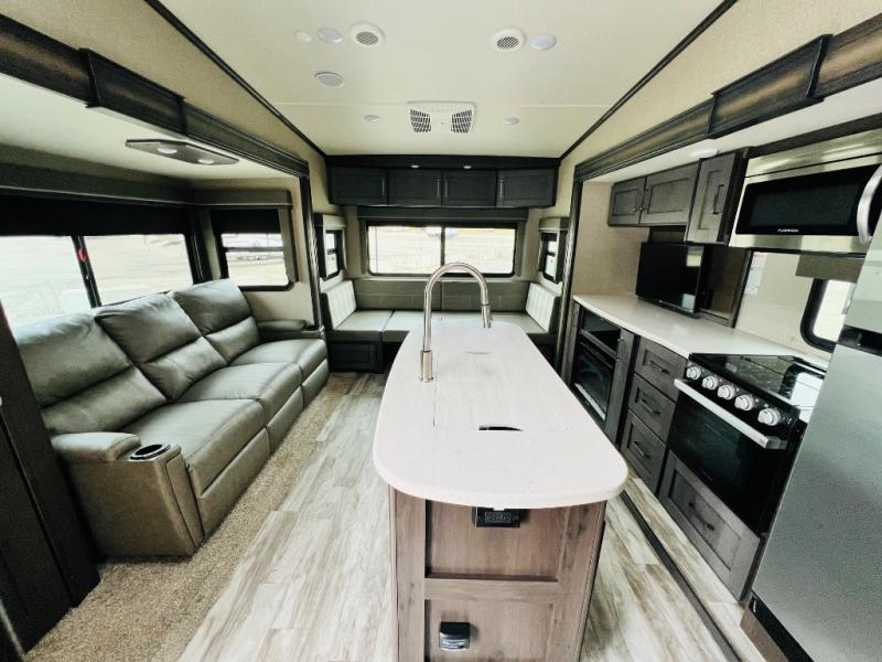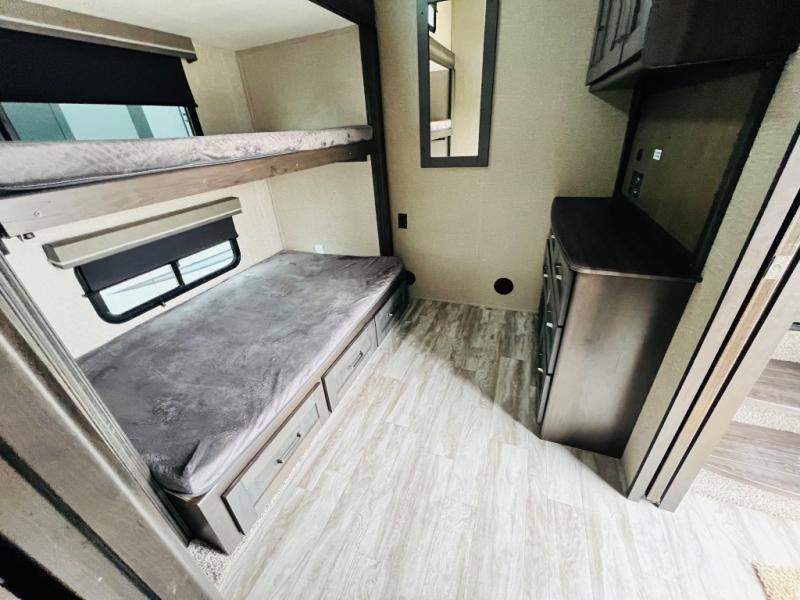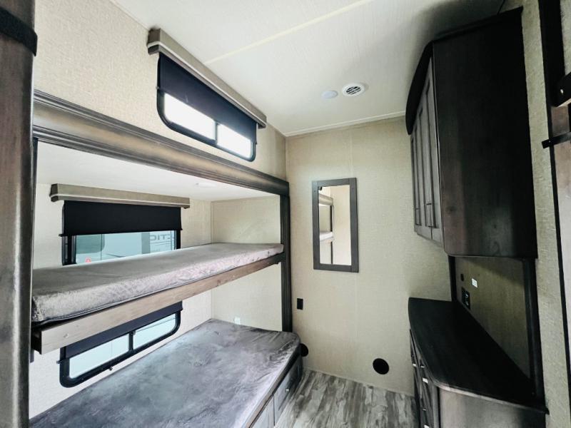 Get ready to enjoy the great outdoors with your family and friends with this fifth wheel at your favorite campsite! The middle bunkhouse with two bunk beds and drawer storage below within a slide and the dresser make this a popular space for guests. Everyone can share the full bathroom which offers linen storage and a space savings door, and you will have your own front bedroom with a queen bed and clothing storage. The main living and kitchen area offers dual slides for maximum floor space, a three person theatre seating, a U-shaped lounge with table to dine at, and an island that the cook will love. You will also find a gourmet kitchen and a 10 cu. ft. refrigerator, plus a pantry for all the goodies. And outside you can stow some beverages in the 1.6 cu. ft. refrigerator and relax under the 18' electric awning.