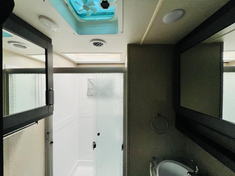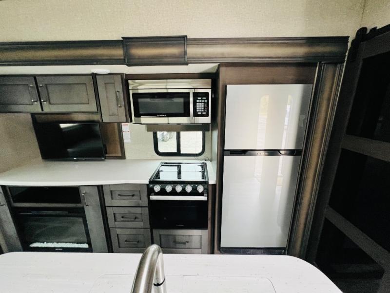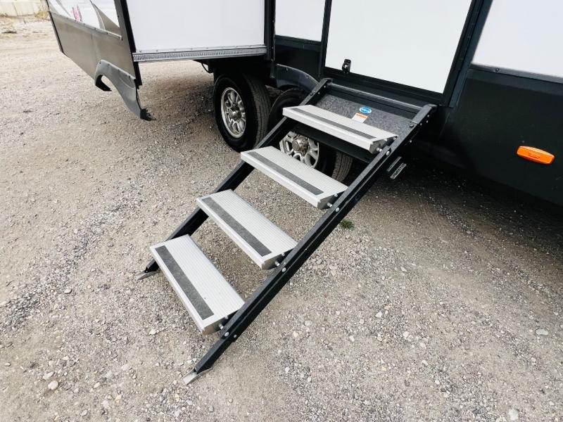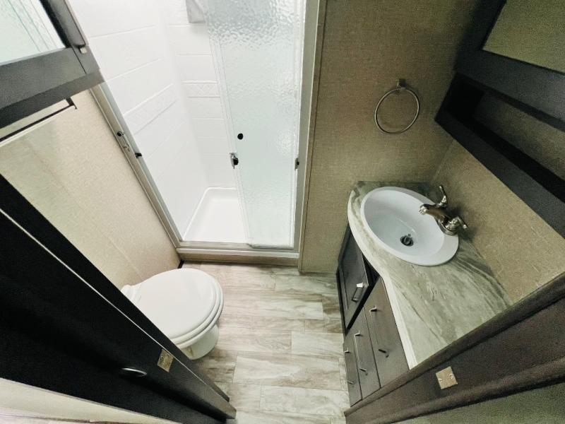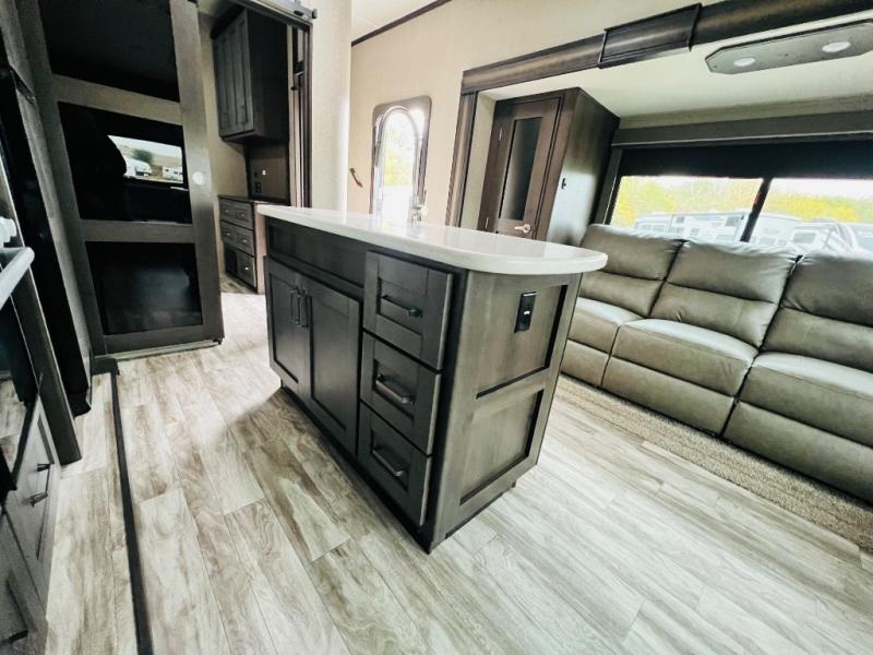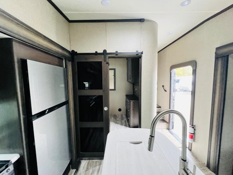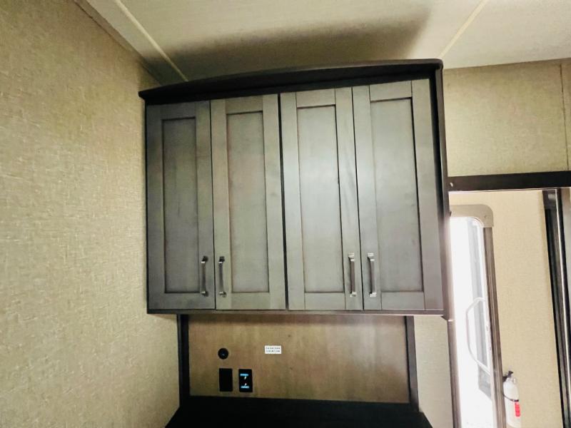 Get ready to enjoy the great outdoors with your family and friends with this fifth wheel at your favorite campsite! The middle bunkhouse with two bunk beds and drawer storage below within a slide and the dresser make this a popular space for guests. Everyone can share the full bathroom which offers linen storage and a space savings door, and you will have your own front bedroom with a queen bed and clothing storage. The main living and kitchen area offers dual slides for maximum floor space, a three person theatre seating, a U-shaped lounge with table to dine at, and an island that the cook will love. You will also find a gourmet kitchen and a 10 cu. ft. refrigerator, plus a pantry for all the goodies. And outside you can stow some beverages in the 1.6 cu. ft. refrigerator and relax under the 18' electric awning.