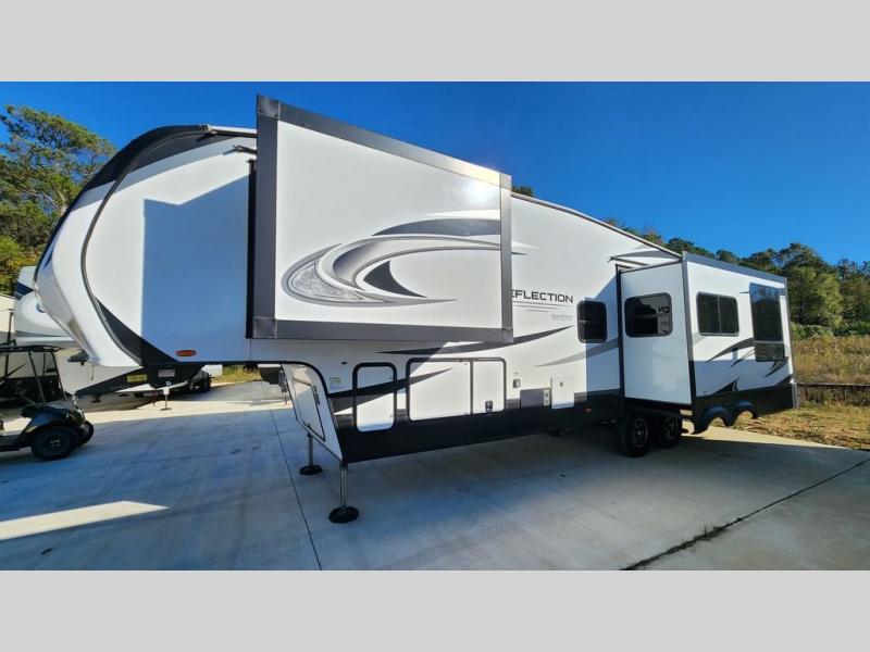 With any Reflection fifth wheels by Grand Design, you will have a 165W solar panel for off-grid camping and a 50 Amp charge controller and inverter prep, a Max Turn radius front cap for easy towing around town and into your campsite, a Universal All-In-One Docking Station, unobstructed pass-through storage, and Goodyear E-rated tires. Some other top features include a chef's kitchen with a 30" stainless steel microwave and residential cooktop, a USB charging station, and the ductless "Evenflow" heating system with no vents in the floor to collect debris. Each is constructed of high gloss gel coat exterior sidewalls, residential 5" truss rafters, walk-on roof decking, a fiberglass and radiant foil roof and front cap insulation plus laminated aluminum framed side walls, rear wall, roof and end walls in slide rooms. Choose luxury, value and towability over all the others, take home a Reflection of your good taste!
