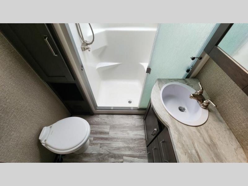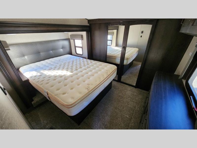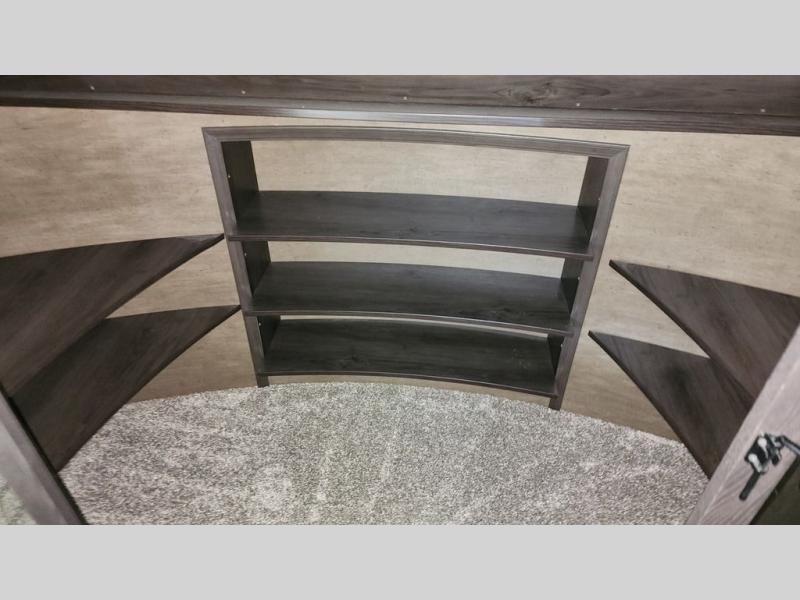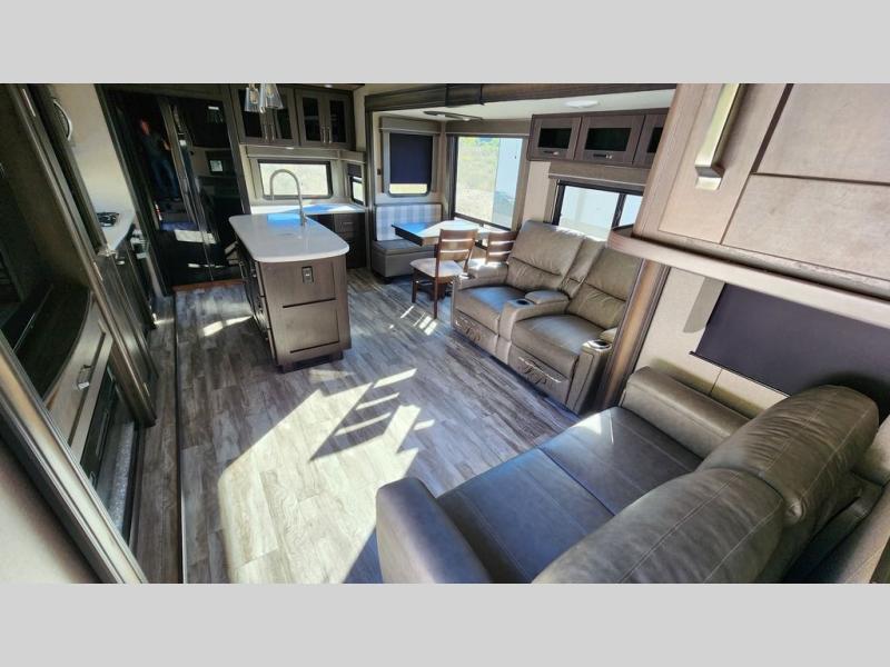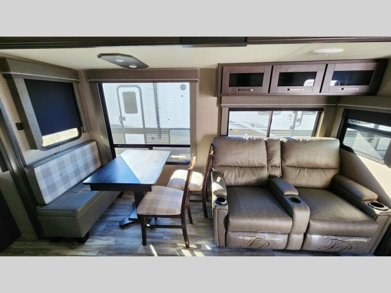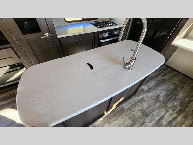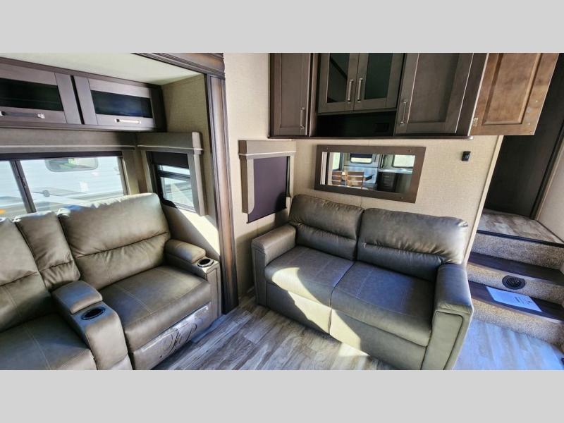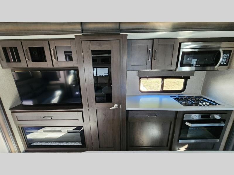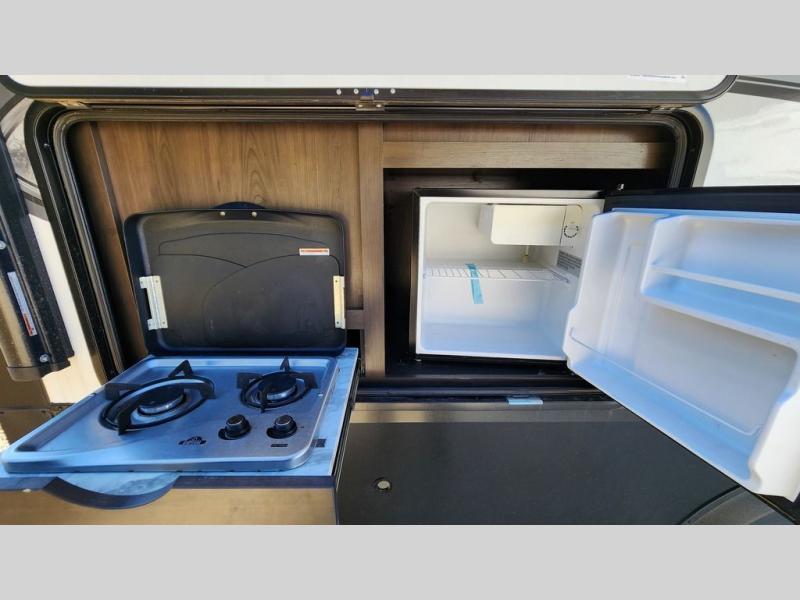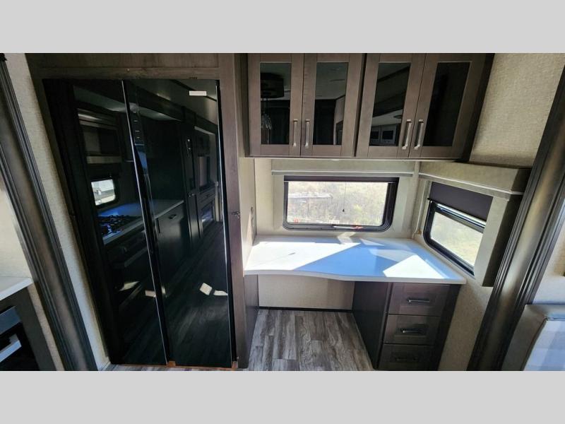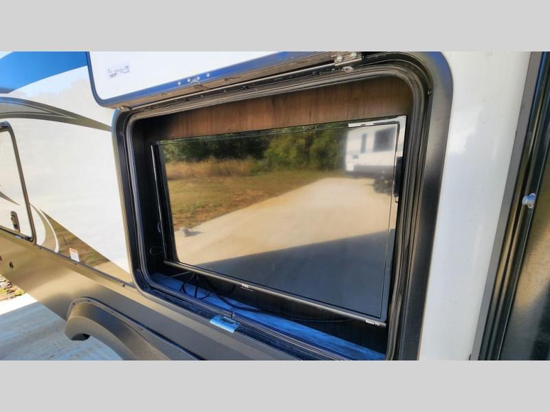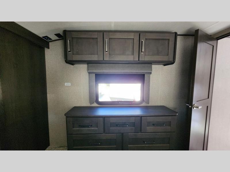 Comfortable accommodations are found throughout this fifth wheel so you can relax, unwind and enjoy your vacation be it for a weekend or a month and even when you have to work! Thanks to the rear desk with a chair and the bedroom washer/dryer prepped space, you could stay in this RV as long as you like and keep all your clothes and linens clean when you add the washer/dryer option. The front bedroom also provides a front wall wardrobe, a slide out queen bed and a dresser. The fiberglass shower offers a skylight for natural lighting during the day, and there is linen storage in the full bathroom. The spacious main living and kitchen area has two slide outs with full kitchen amenities and seating with theatre seats including cupholders, a booth dinette, plus there is a tri-fold sofa. And the exterior offers an outside kitchen with exterior stovetop, a 1.6 cu ft. refrigerator, and there is an outside entertainment center with an LED TV to enjoy while relaxing under the two electric awnings.