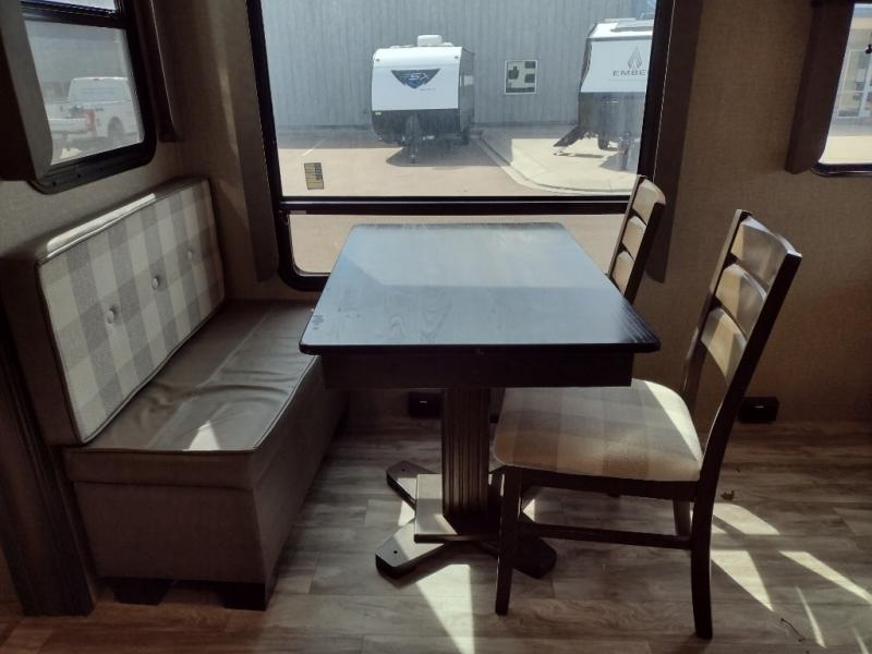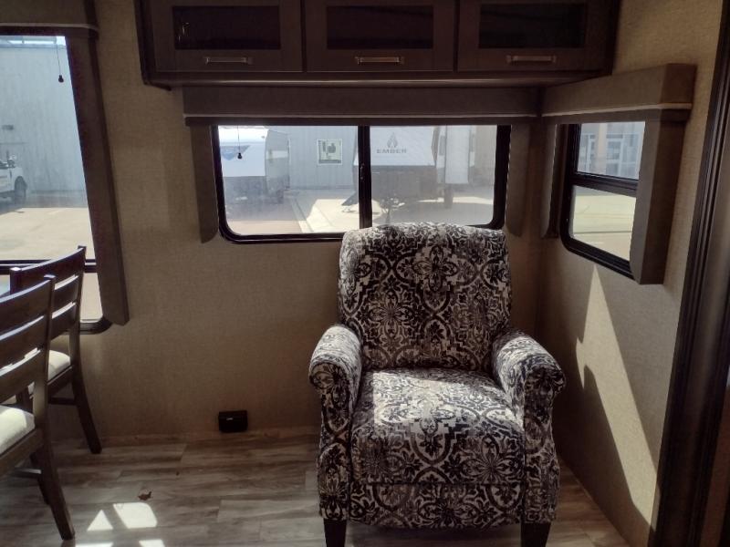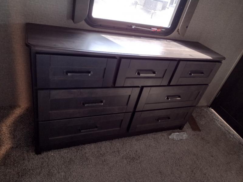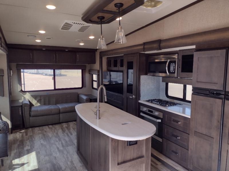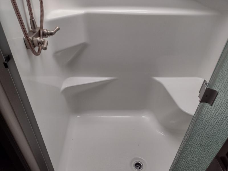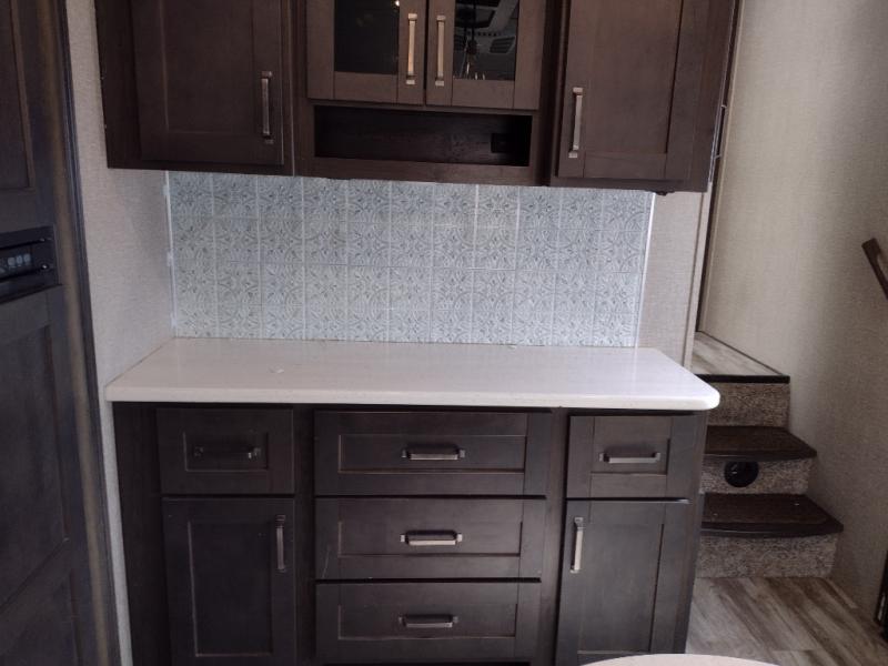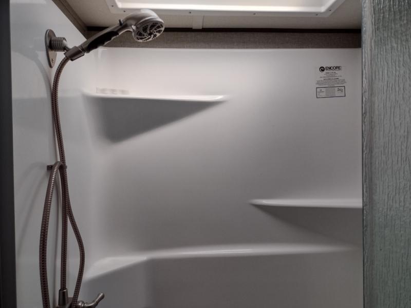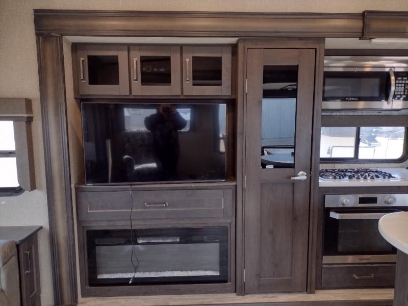 You can enjoy a spacious rear living area in this RV with dual opposing slides offering you entertainment, kitchen amenities, seating and windows for great views! The rear tri-fold sofa also converts into extra sleeping space for an extra guest or two, just like the booth dinette does. Yet you might like to add the free standing dinette option. There are theatre seats to enjoy while you place your drinks in the cupholders and watch the entertainment center with a 40" LED HDTV and fireplace. The pantry is big enough to store your favorite snacks, and the kitchen island will make meal prepping easier, plus there is a 16 cu. ft. refrigerator to store any leftovers. The full bathroom has a 30" x 48" fiberglass shower with a skylight above for natural lighting as you get ready and a linen closet to store your towels. The front private bedroom has a comfortable queen bed slide that can be switched out for the optional king bed, a dresser with overhead cabinets, and a full wall wardrobe that is prepped to add the optional washer and dryer so that you can extend your camping trip with clean clothes!