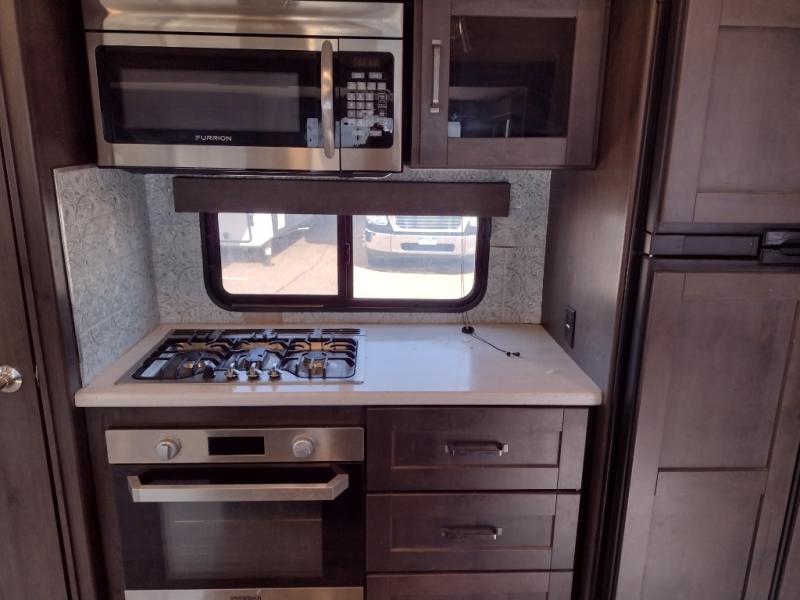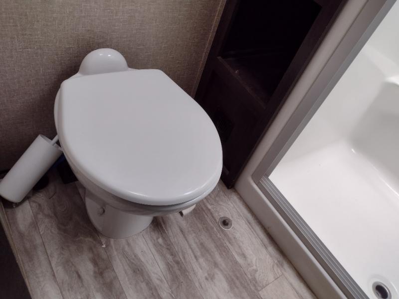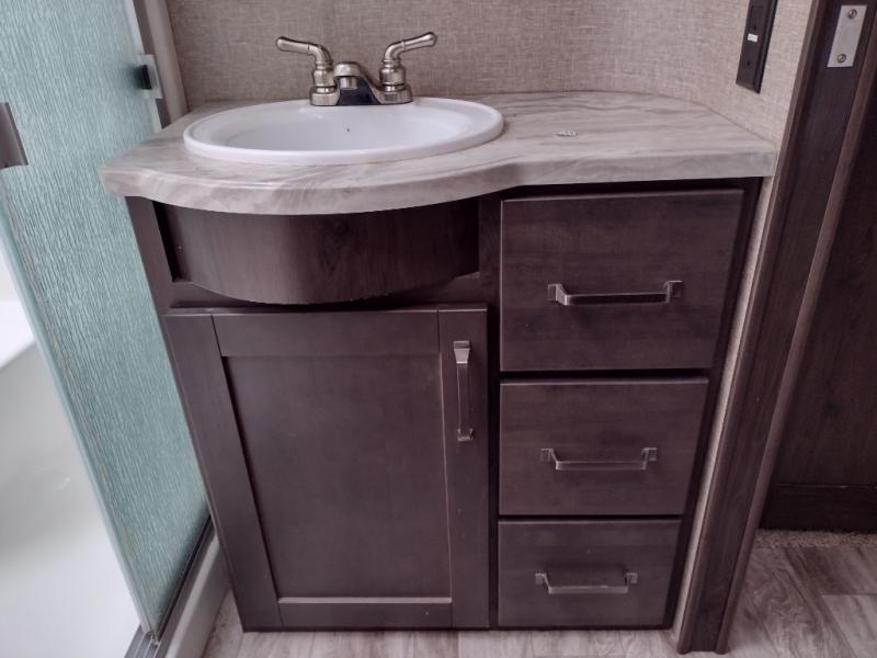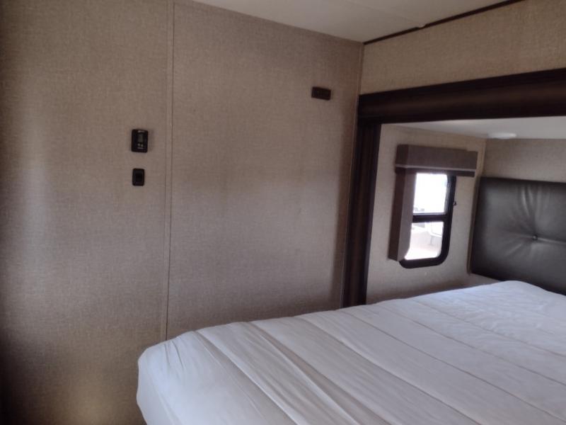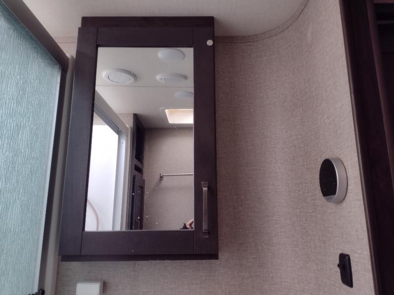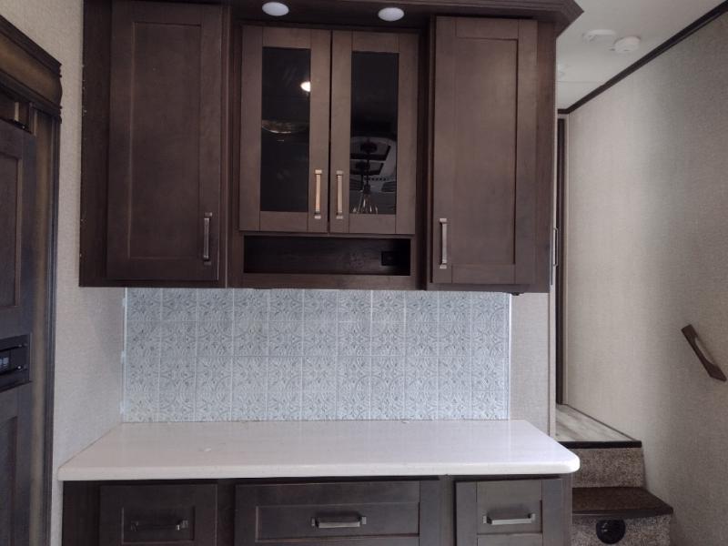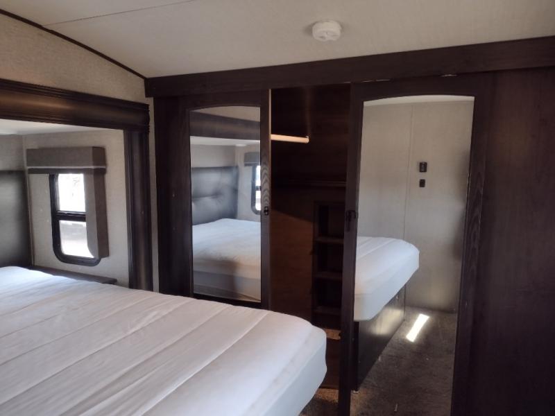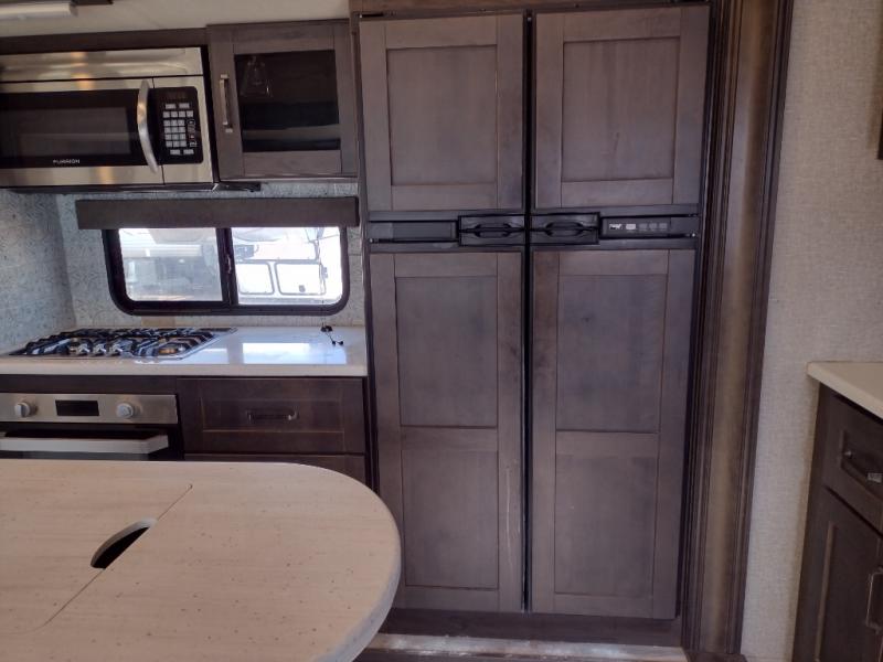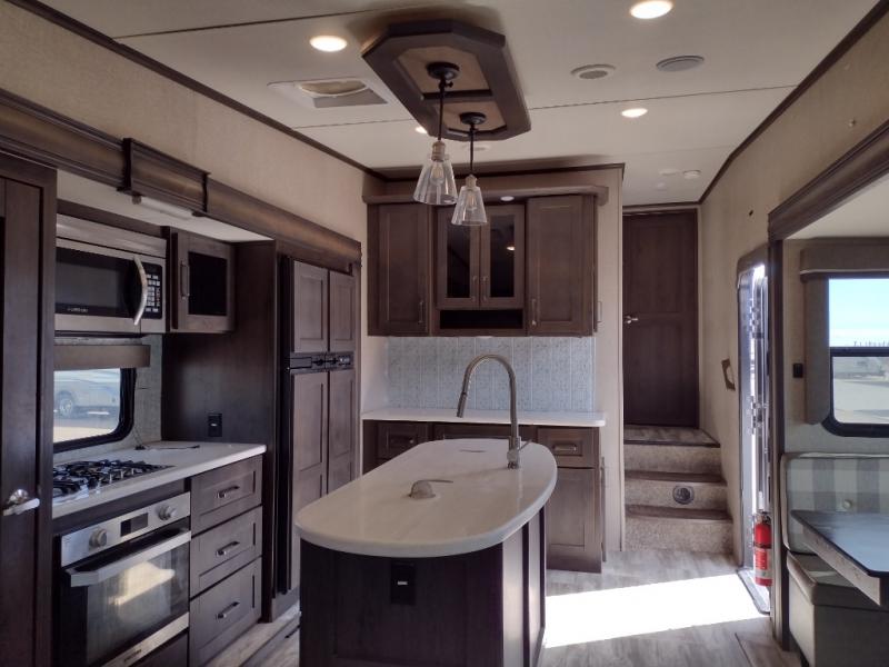 You can enjoy a spacious rear living area in this RV with dual opposing slides offering you entertainment, kitchen amenities, seating and windows for great views! The rear tri-fold sofa also converts into extra sleeping space for an extra guest or two, just like the booth dinette does. Yet you might like to add the free standing dinette option. There are theatre seats to enjoy while you place your drinks in the cupholders and watch the entertainment center with a 40" LED HDTV and fireplace. The pantry is big enough to store your favorite snacks, and the kitchen island will make meal prepping easier, plus there is a 16 cu. ft. refrigerator to store any leftovers. The full bathroom has a 30" x 48" fiberglass shower with a skylight above for natural lighting as you get ready and a linen closet to store your towels. The front private bedroom has a comfortable queen bed slide that can be switched out for the optional king bed, a dresser with overhead cabinets, and a full wall wardrobe that is prepped to add the optional washer and dryer so that you can extend your camping trip with clean clothes!