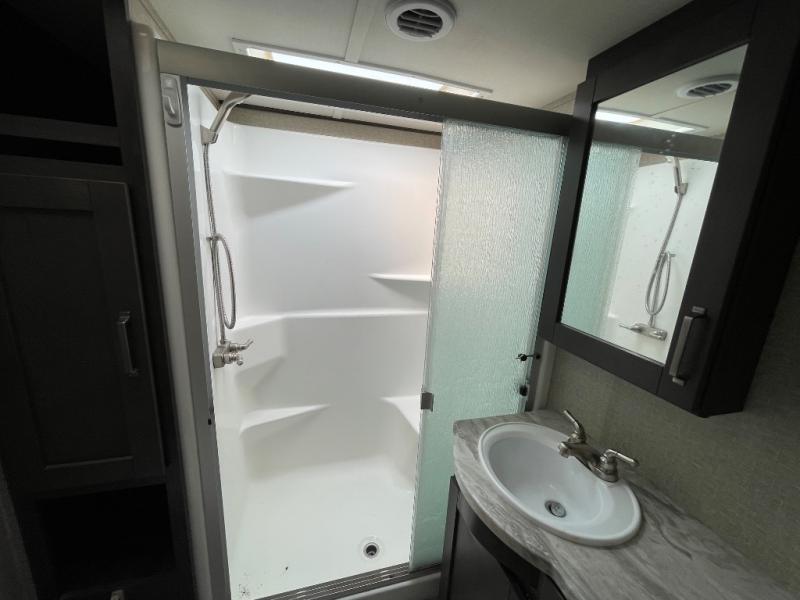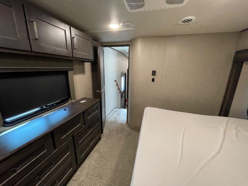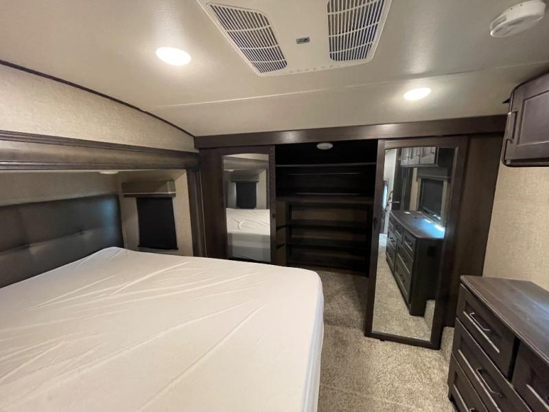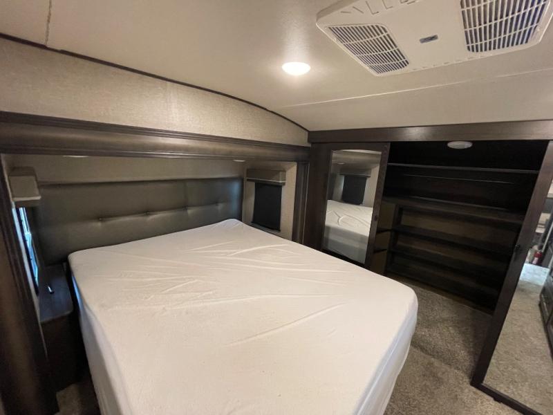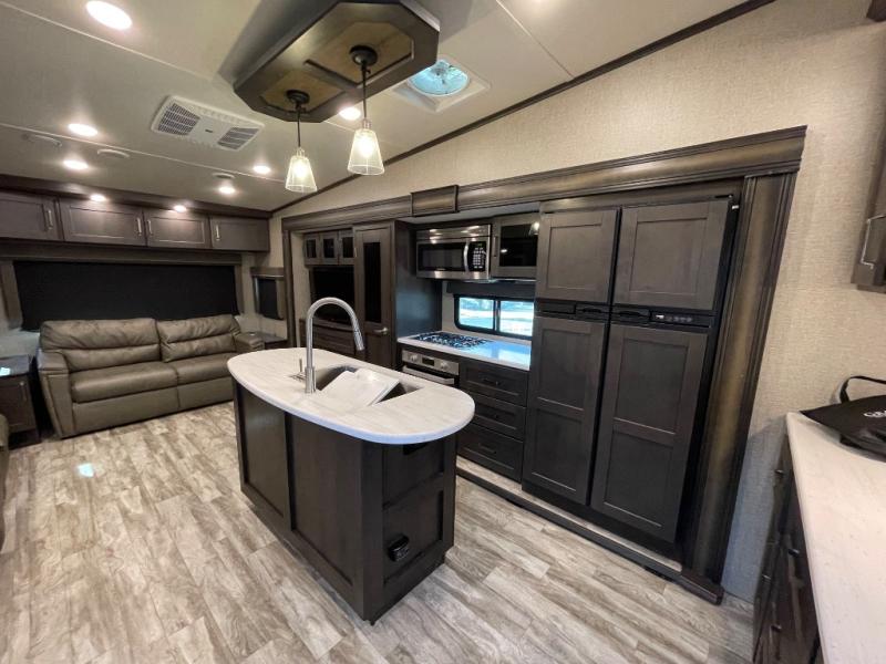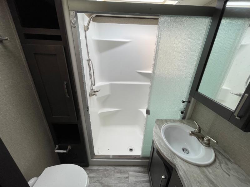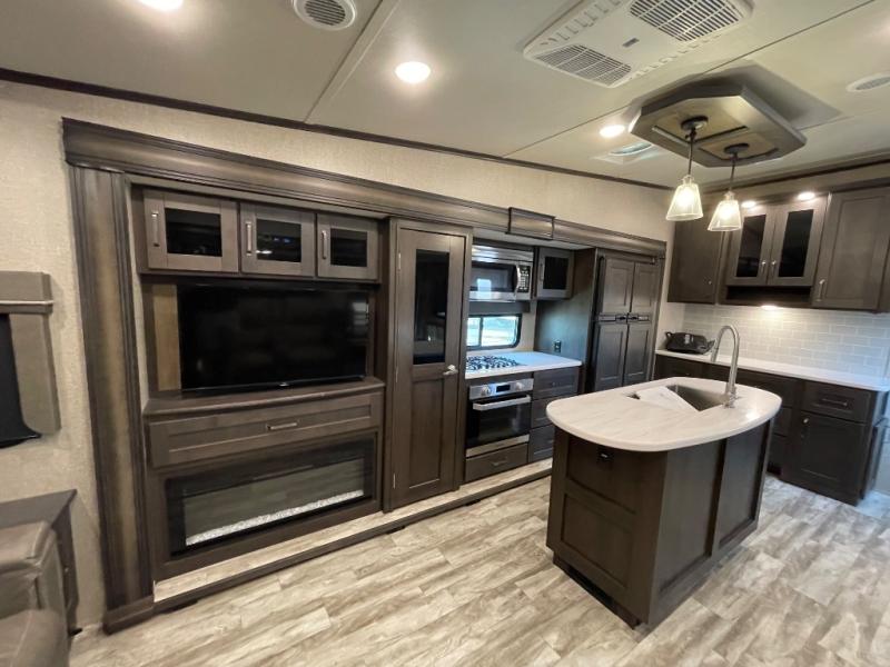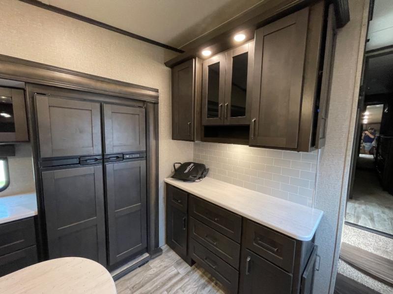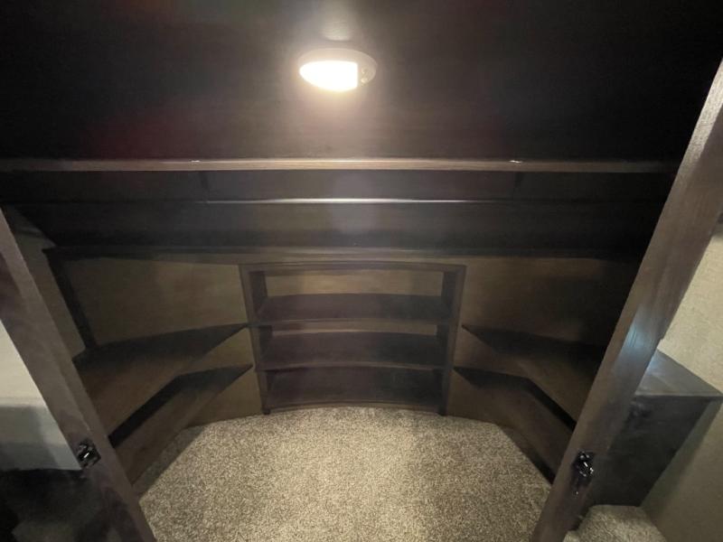 You can enjoy a spacious rear living area in this RV with dual opposing slides offering you entertainment, kitchen amenities, seating and windows for great views! The rear tri-fold sofa also converts into extra sleeping space for an extra guest or two, just like the booth dinette does. Yet you might like to add the free standing dinette option. There are theatre seats to enjoy while you place your drinks in the cupholders and watch the entertainment center with a 40" LED HDTV and fireplace. The pantry is big enough to store your favorite snacks, and the kitchen island will make meal prepping easier, plus there is a 16 cu. ft. refrigerator to store any leftovers. The full bathroom has a 30" x 48" fiberglass shower with a skylight above for natural lighting as you get ready and a linen closet to store your towels. The front private bedroom has a comfortable queen bed slide that can be switched out for the optional king bed, a dresser with overhead cabinets, and a full wall wardrobe that is prepped to add the optional washer and dryer so that you can extend your camping trip with clean clothes!