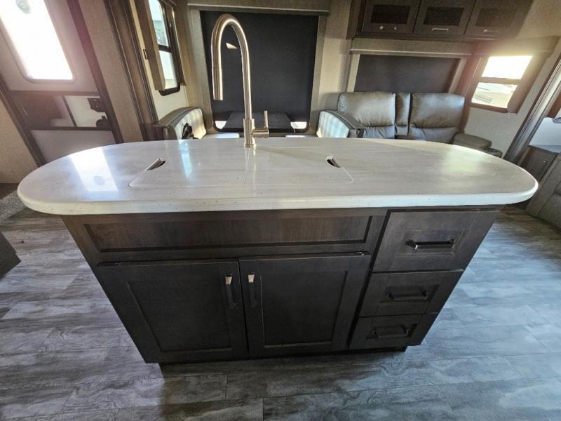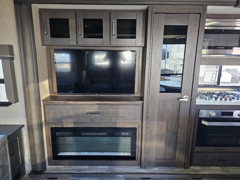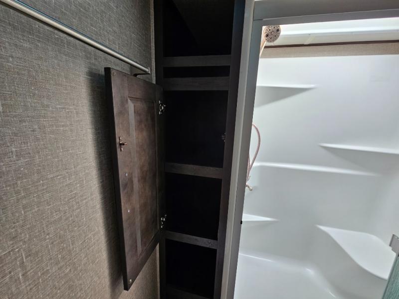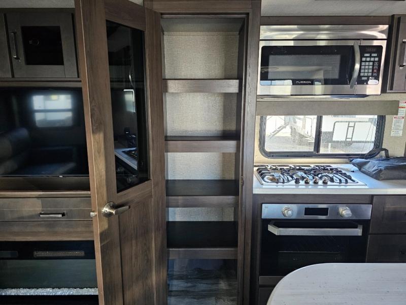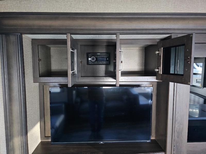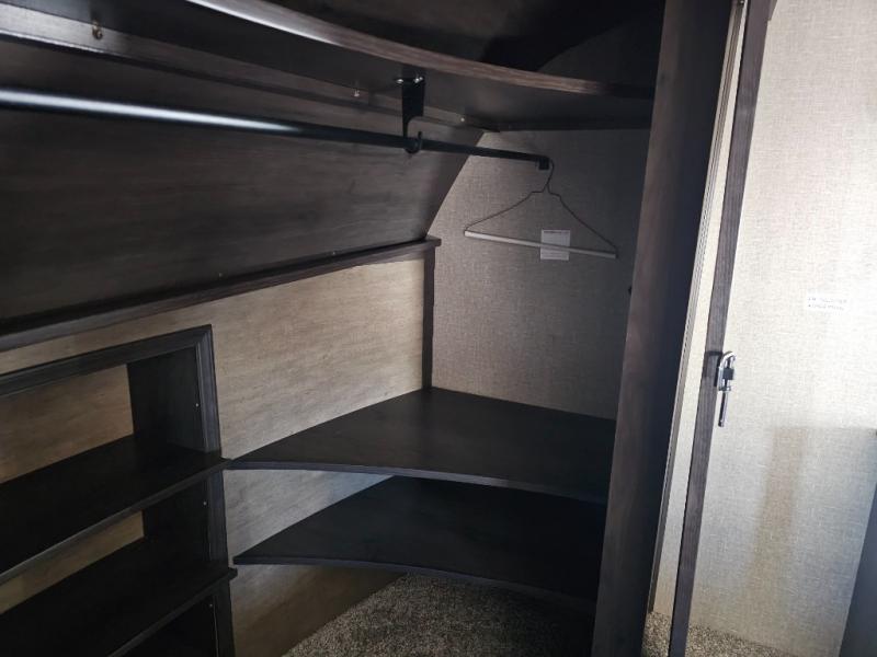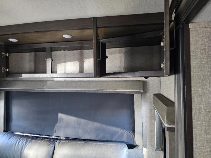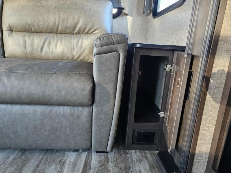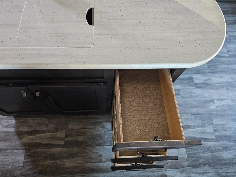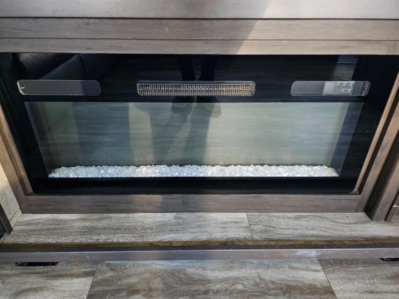 You can enjoy a spacious rear living area in this RV with dual opposing slides offering you entertainment, kitchen amenities, seating and windows for great views! The rear tri-fold sofa also converts into extra sleeping space for an extra guest or two, just like the booth dinette does. Yet you might like to add the free standing dinette option. There are theatre seats to enjoy while you place your drinks in the cupholders and watch the entertainment center with a 40" LED HDTV and fireplace. The pantry is big enough to store your favorite snacks, and the kitchen island will make meal prepping easier, plus there is a 16 cu. ft. refrigerator to store any leftovers. The full bathroom has a 30" x 48" fiberglass shower with a skylight above for natural lighting as you get ready and a linen closet to store your towels. The front private bedroom has a comfortable queen bed slide that can be switched out for the optional king bed, a dresser with overhead cabinets, and a full wall wardrobe that is prepped to add the optional washer and dryer so that you can extend your camping trip with clean clothes!