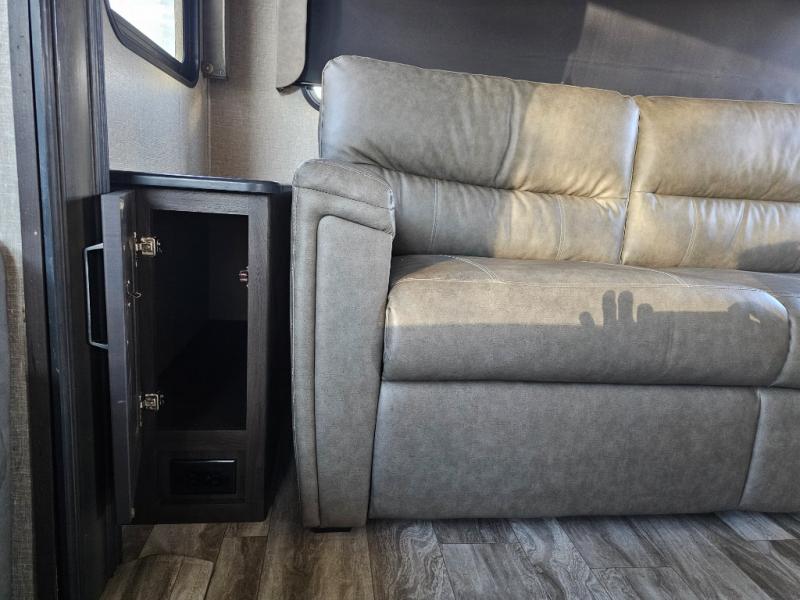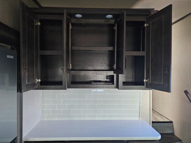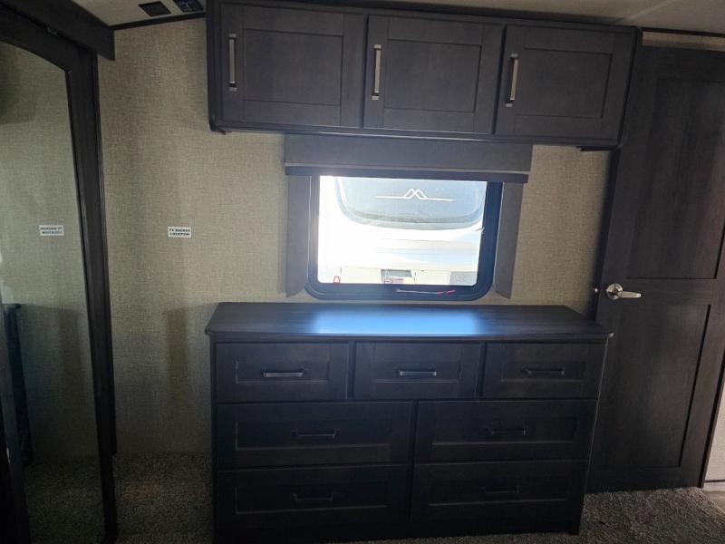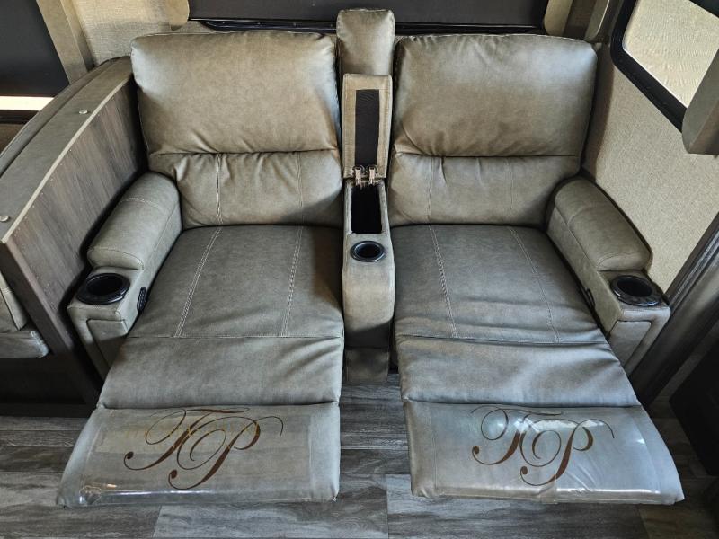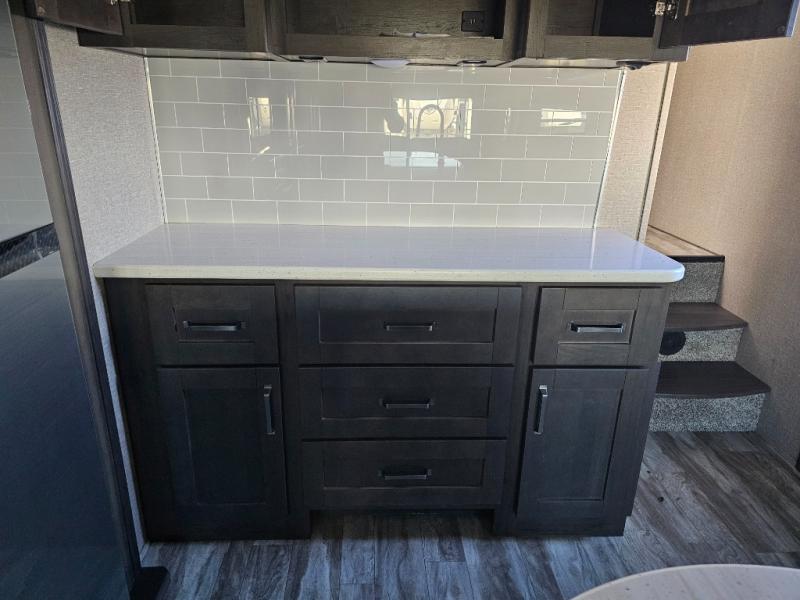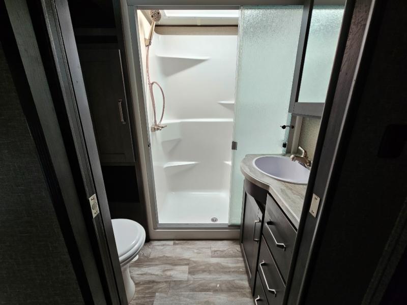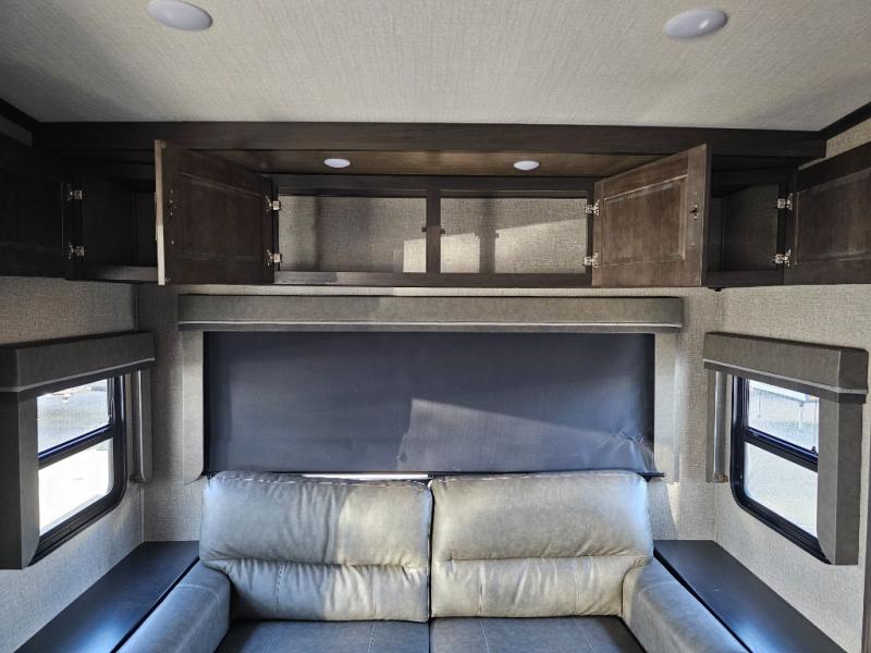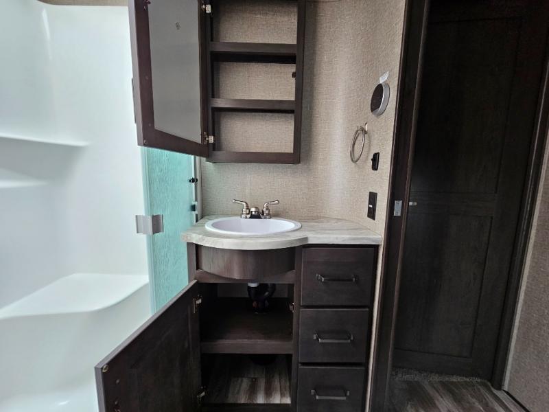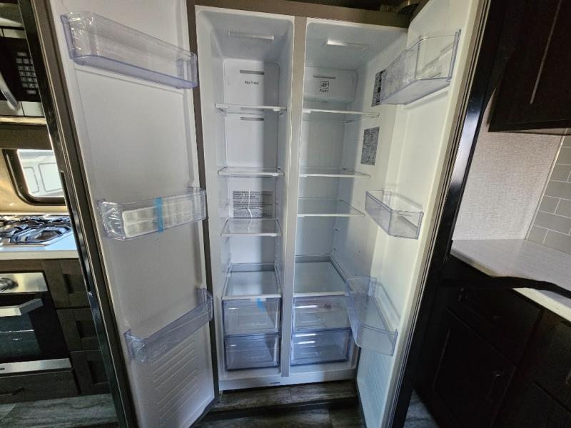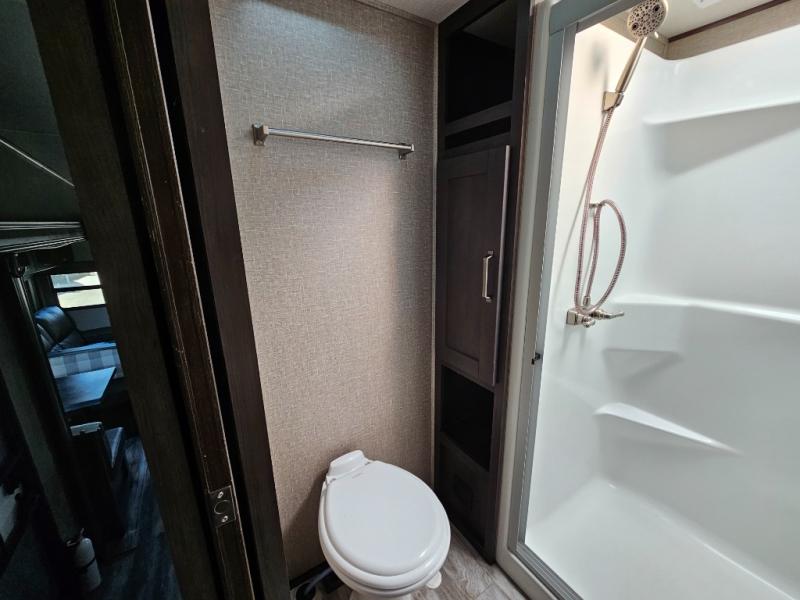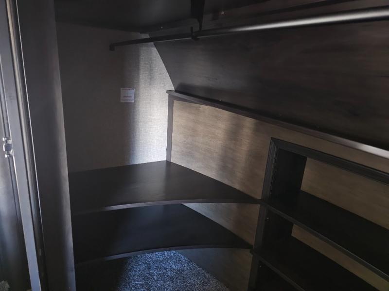 You can enjoy a spacious rear living area in this RV with dual opposing slides offering you entertainment, kitchen amenities, seating and windows for great views! The rear tri-fold sofa also converts into extra sleeping space for an extra guest or two, just like the booth dinette does. Yet you might like to add the free standing dinette option. There are theatre seats to enjoy while you place your drinks in the cupholders and watch the entertainment center with a 40" LED HDTV and fireplace. The pantry is big enough to store your favorite snacks, and the kitchen island will make meal prepping easier, plus there is a 16 cu. ft. refrigerator to store any leftovers. The full bathroom has a 30" x 48" fiberglass shower with a skylight above for natural lighting as you get ready and a linen closet to store your towels. The front private bedroom has a comfortable queen bed slide that can be switched out for the optional king bed, a dresser with overhead cabinets, and a full wall wardrobe that is prepped to add the optional washer and dryer so that you can extend your camping trip with clean clothes!
