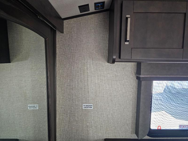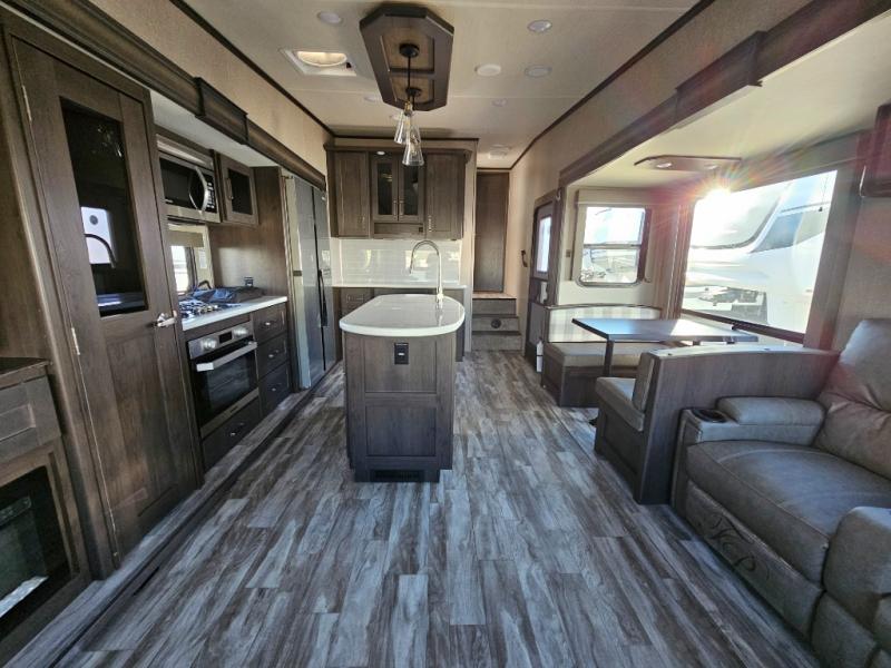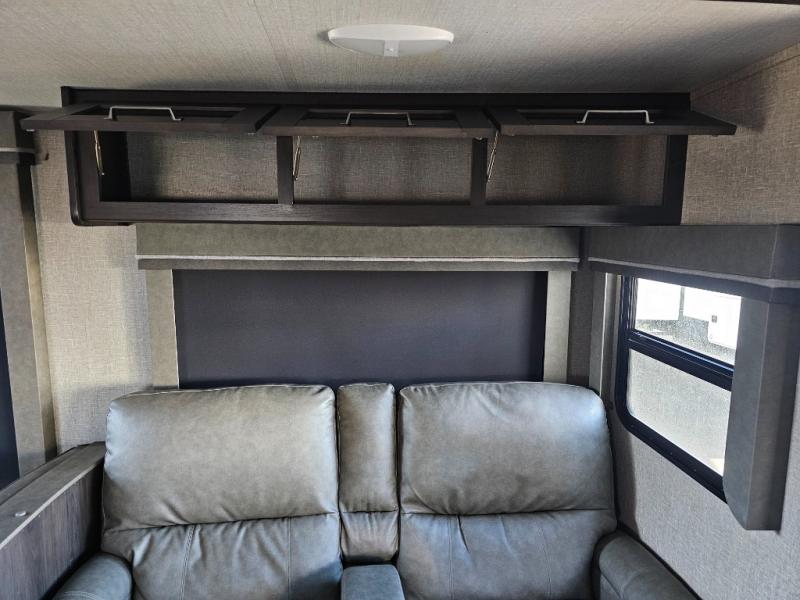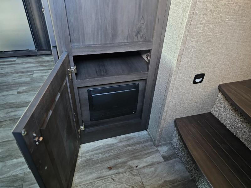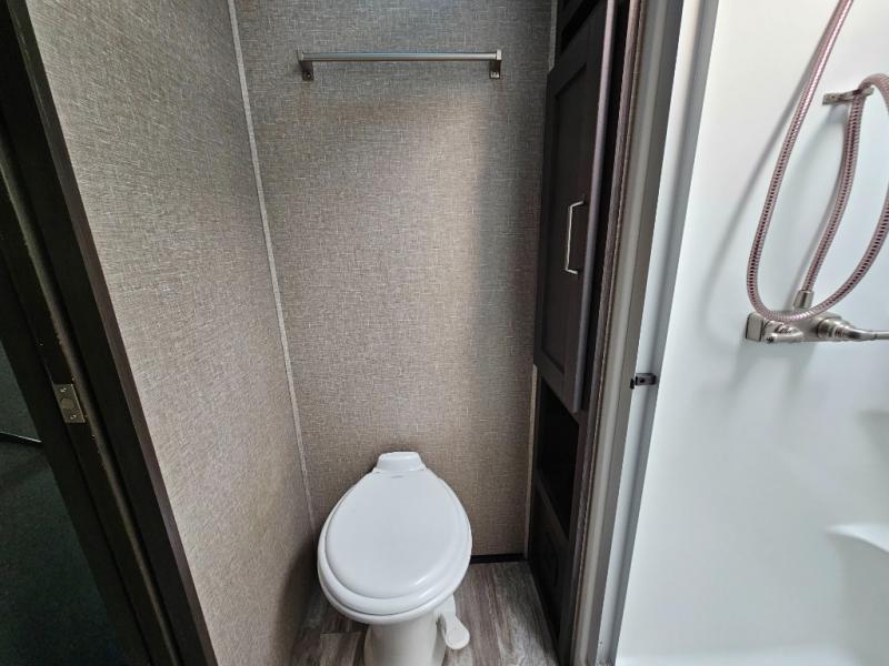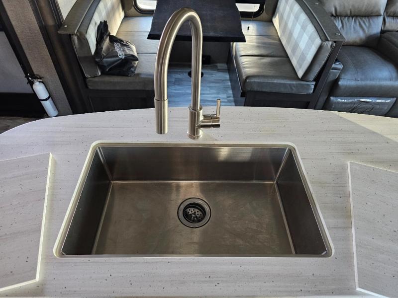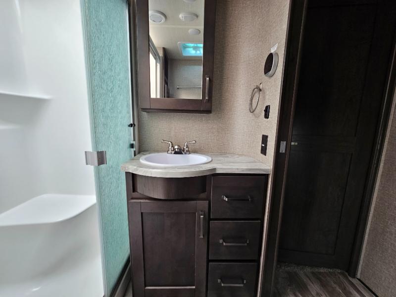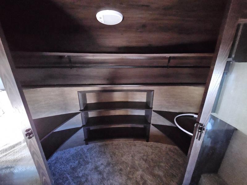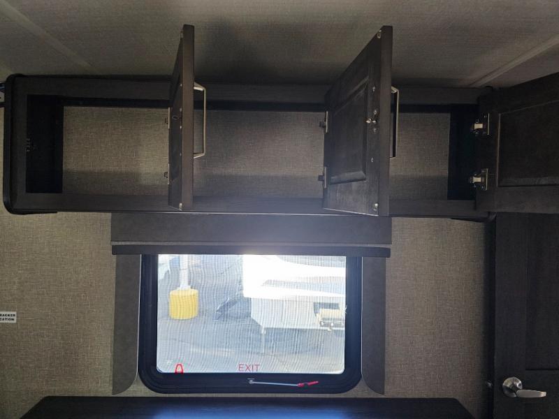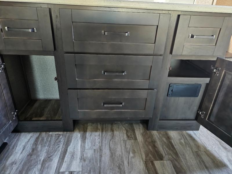 You can enjoy a spacious rear living area in this RV with dual opposing slides offering you entertainment, kitchen amenities, seating and windows for great views! The rear tri-fold sofa also converts into extra sleeping space for an extra guest or two, just like the booth dinette does. Yet you might like to add the free standing dinette option. There are theatre seats to enjoy while you place your drinks in the cupholders and watch the entertainment center with a 40" LED HDTV and fireplace. The pantry is big enough to store your favorite snacks, and the kitchen island will make meal prepping easier, plus there is a 16 cu. ft. refrigerator to store any leftovers. The full bathroom has a 30" x 48" fiberglass shower with a skylight above for natural lighting as you get ready and a linen closet to store your towels. The front private bedroom has a comfortable queen bed slide that can be switched out for the optional king bed, a dresser with overhead cabinets, and a full wall wardrobe that is prepped to add the optional washer and dryer so that you can extend your camping trip with clean clothes!