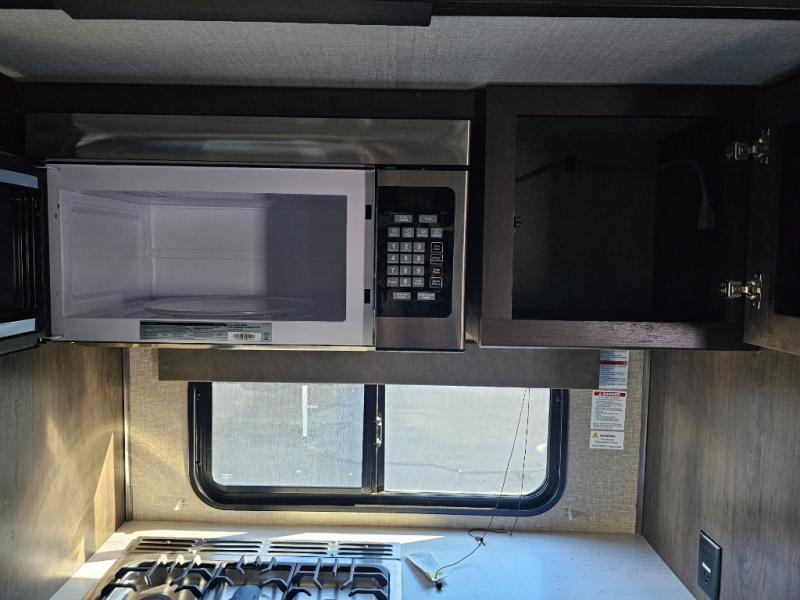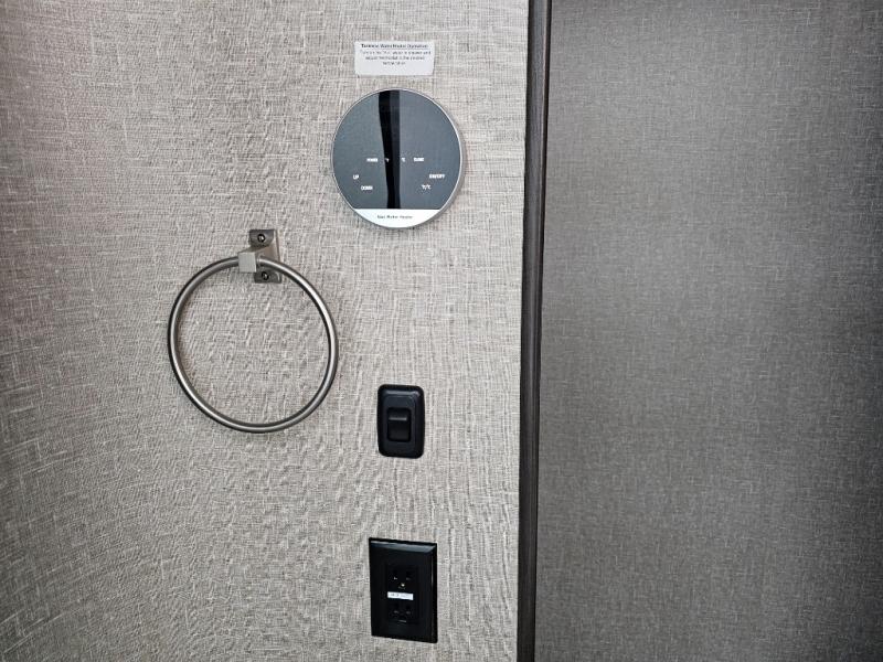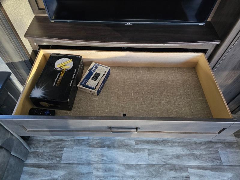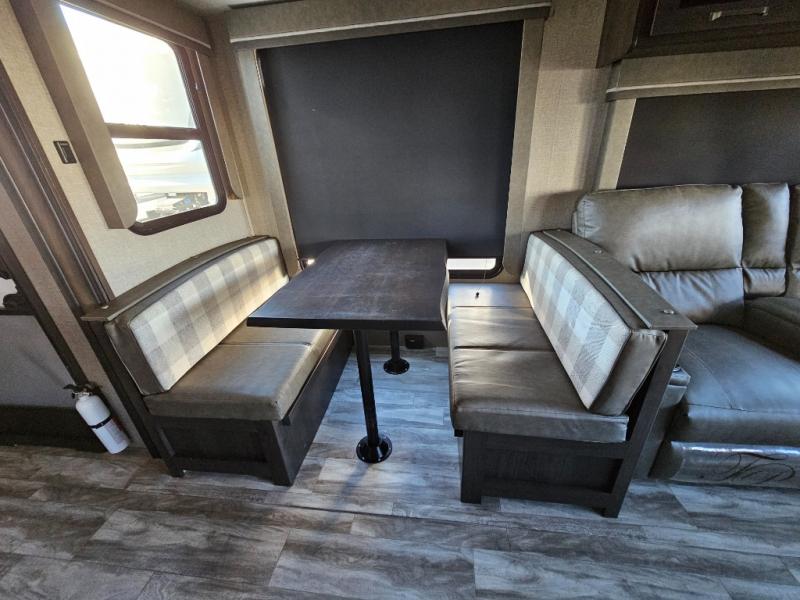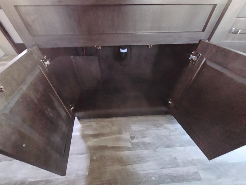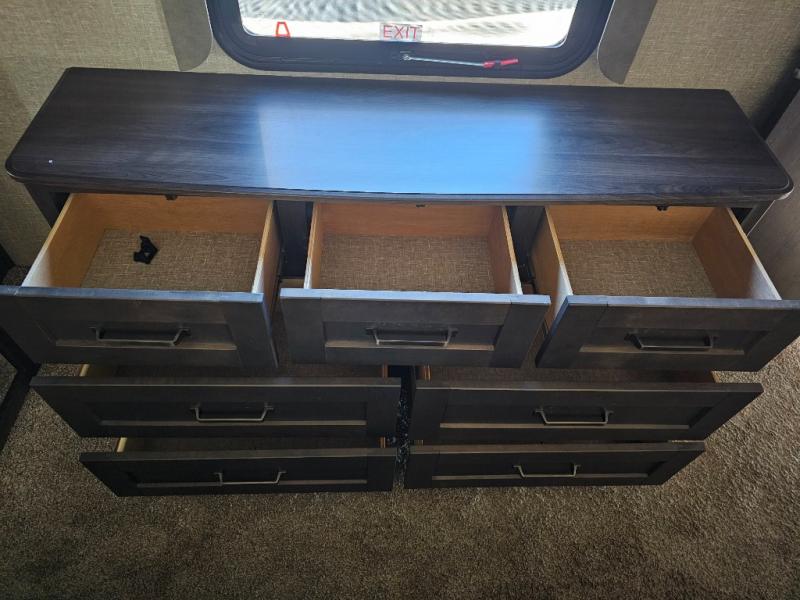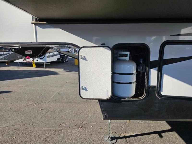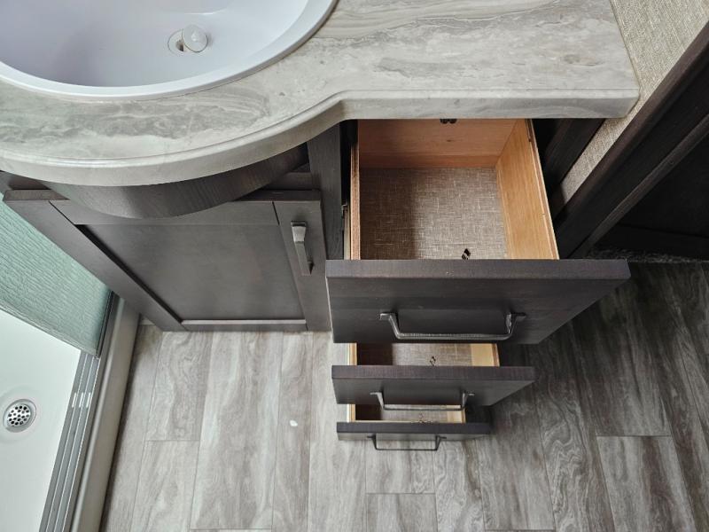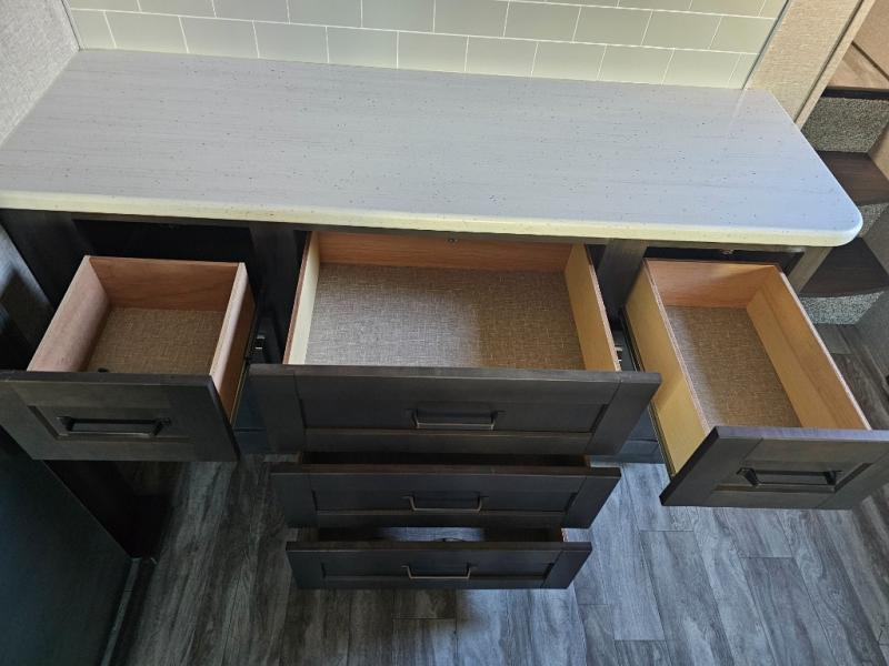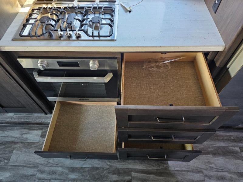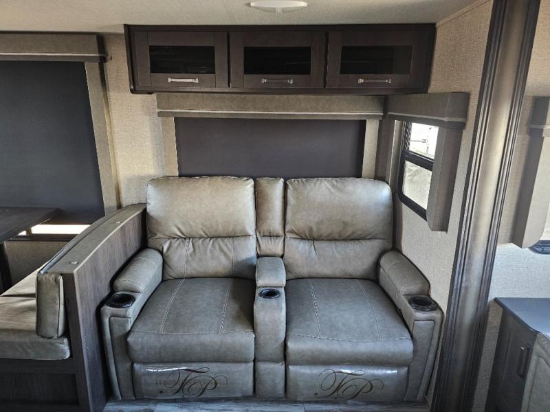 You can enjoy a spacious rear living area in this RV with dual opposing slides offering you entertainment, kitchen amenities, seating and windows for great views! The rear tri-fold sofa also converts into extra sleeping space for an extra guest or two, just like the booth dinette does. Yet you might like to add the free standing dinette option. There are theatre seats to enjoy while you place your drinks in the cupholders and watch the entertainment center with a 40" LED HDTV and fireplace. The pantry is big enough to store your favorite snacks, and the kitchen island will make meal prepping easier, plus there is a 16 cu. ft. refrigerator to store any leftovers. The full bathroom has a 30" x 48" fiberglass shower with a skylight above for natural lighting as you get ready and a linen closet to store your towels. The front private bedroom has a comfortable queen bed slide that can be switched out for the optional king bed, a dresser with overhead cabinets, and a full wall wardrobe that is prepped to add the optional washer and dryer so that you can extend your camping trip with clean clothes!