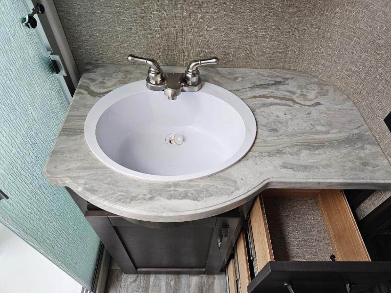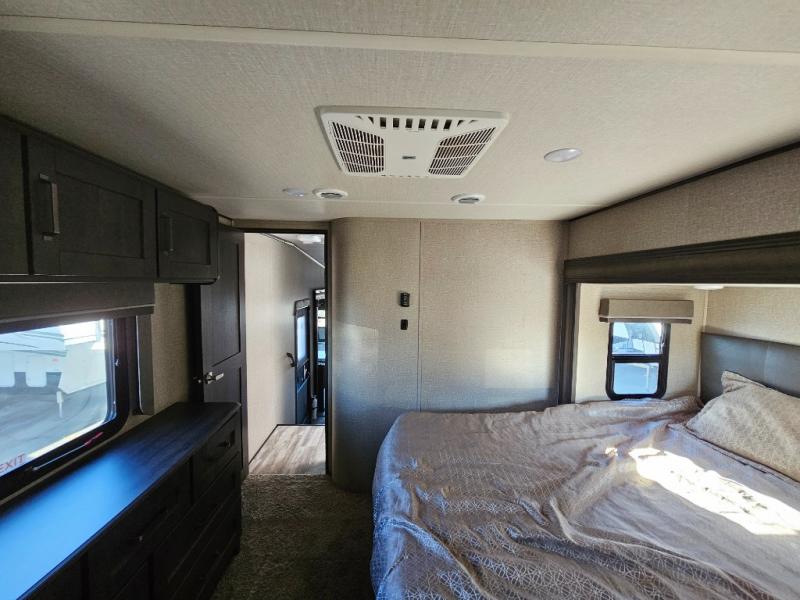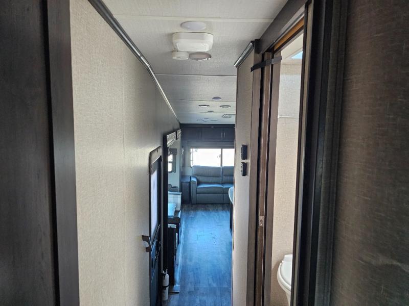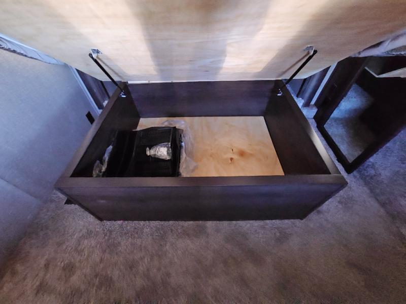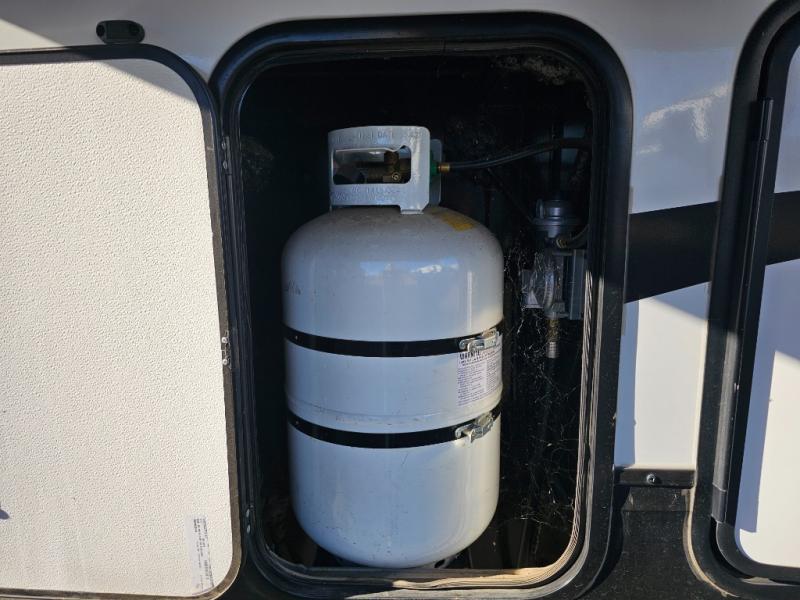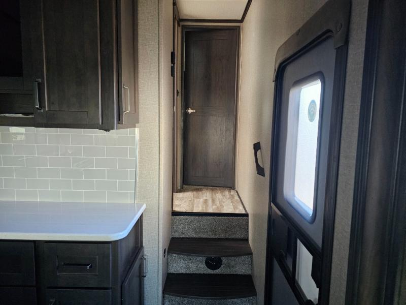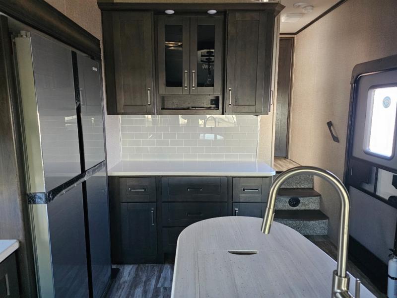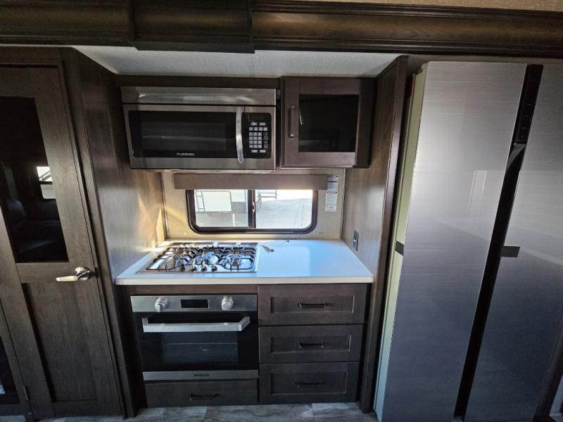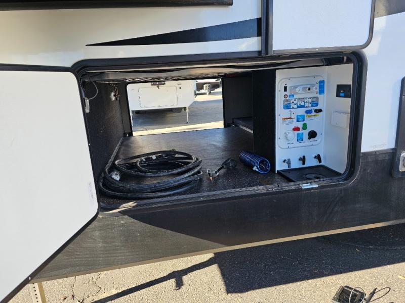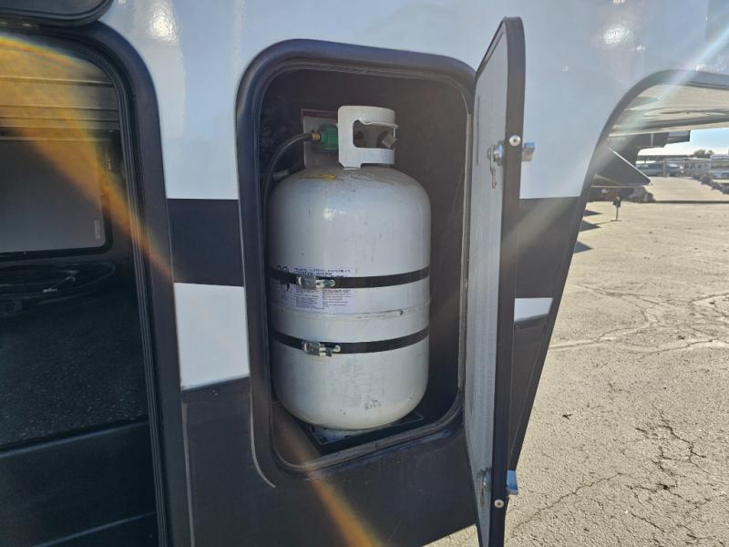 You can enjoy a spacious rear living area in this RV with dual opposing slides offering you entertainment, kitchen amenities, seating and windows for great views! The rear tri-fold sofa also converts into extra sleeping space for an extra guest or two, just like the booth dinette does. Yet you might like to add the free standing dinette option. There are theatre seats to enjoy while you place your drinks in the cupholders and watch the entertainment center with a 40" LED HDTV and fireplace. The pantry is big enough to store your favorite snacks, and the kitchen island will make meal prepping easier, plus there is a 16 cu. ft. refrigerator to store any leftovers. The full bathroom has a 30" x 48" fiberglass shower with a skylight above for natural lighting as you get ready and a linen closet to store your towels. The front private bedroom has a comfortable queen bed slide that can be switched out for the optional king bed, a dresser with overhead cabinets, and a full wall wardrobe that is prepped to add the optional washer and dryer so that you can extend your camping trip with clean clothes!