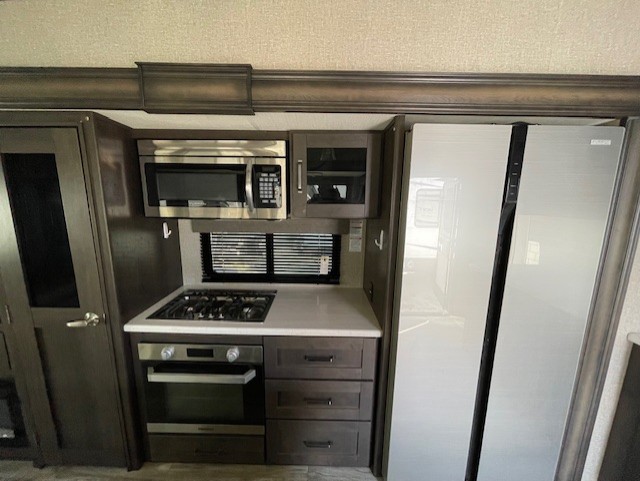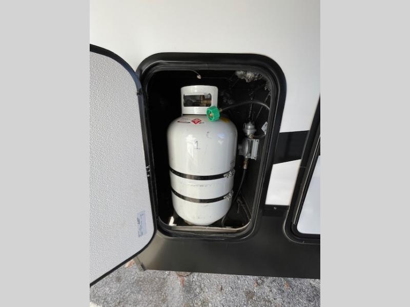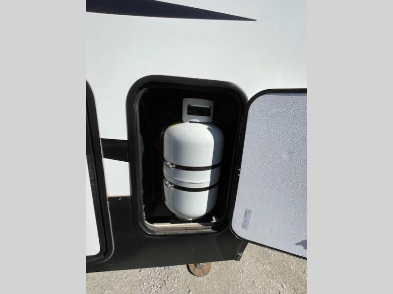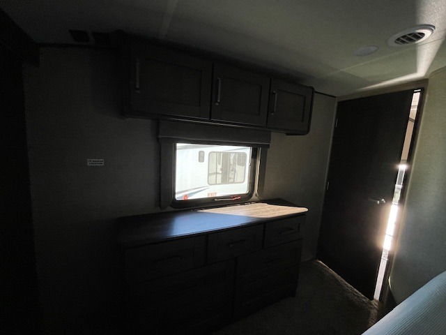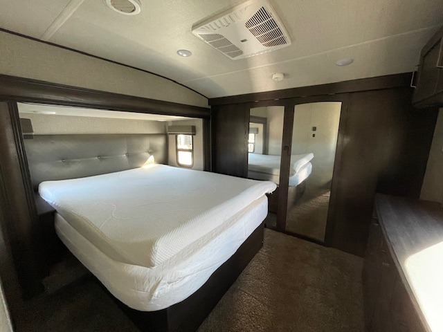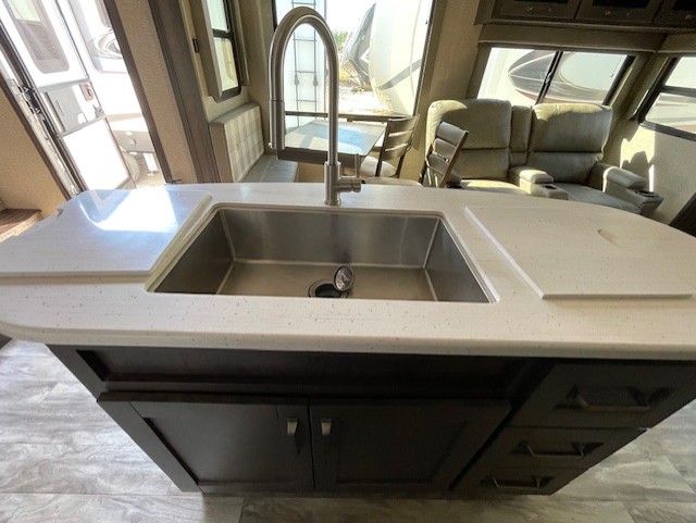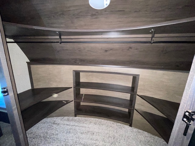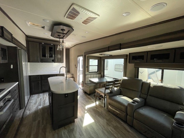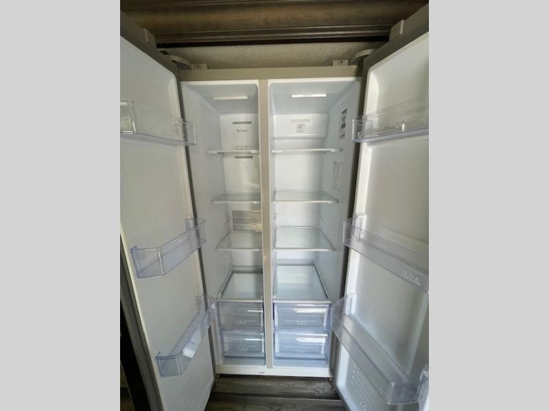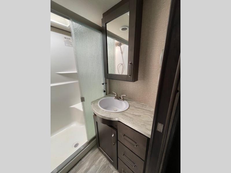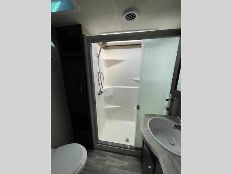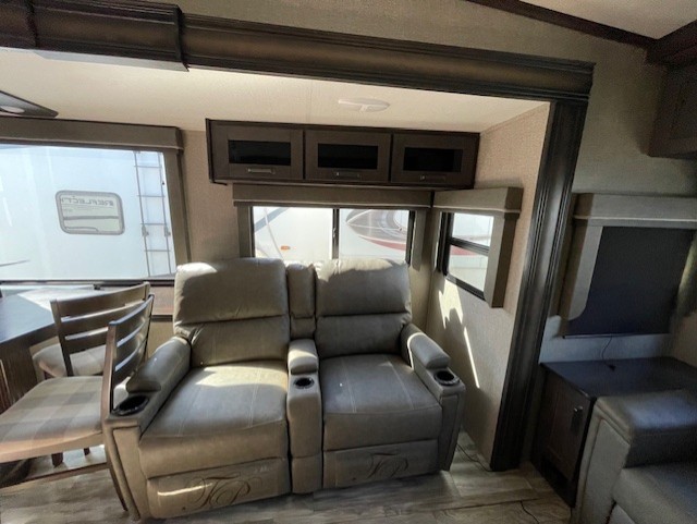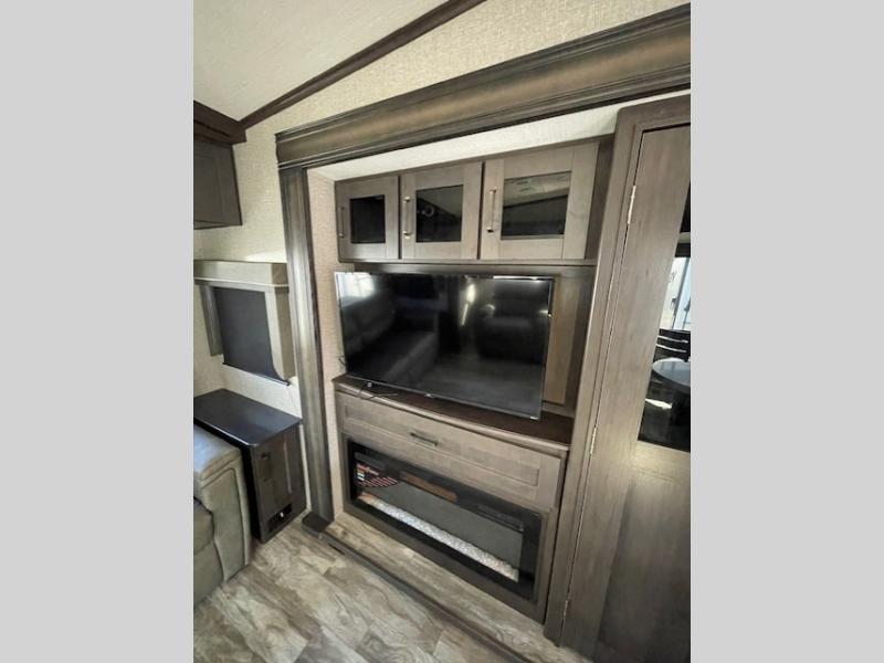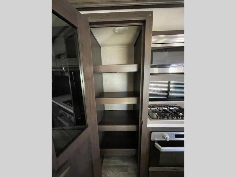You can enjoy a spacious rear living area in this RV with dual opposing slides offering you entertainment, kitchen amenities, seating and windows for great views! The rear tri-fold sofa also converts into extra sleeping space for an extra guest or two, just like the booth dinette does. Yet you might like to add the free standing dinette option. There are theatre seats to enjoy while you place your drinks in the cupholders and watch the entertainment center with a 40" LED HDTV and fireplace. The pantry is big enough to store your favorite snacks, and the kitchen island will make meal prepping easier, plus there is a 16 cu. ft. refrigerator to store any leftovers. The full bathroom has a 30" x 48" fiberglass shower with a skylight above for natural lighting as you get ready and a linen closet to store your towels. The front private bedroom has a comfortable queen bed slide that can be switched out for the optional king bed, a dresser with overhead cabinets, and a full wall wardrobe that is prepped to add the optional washer and dryer so that you can extend your camping trip with clean clothes!