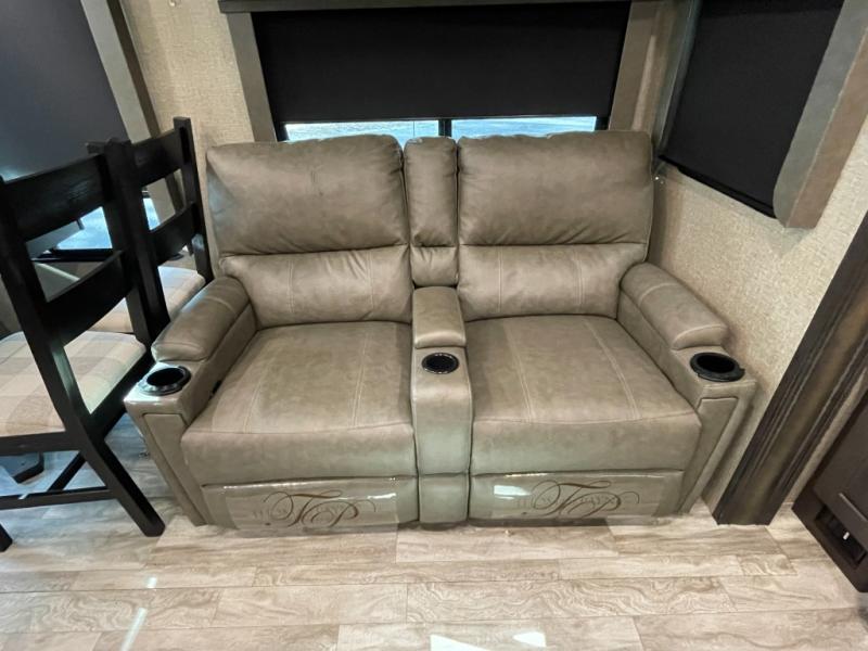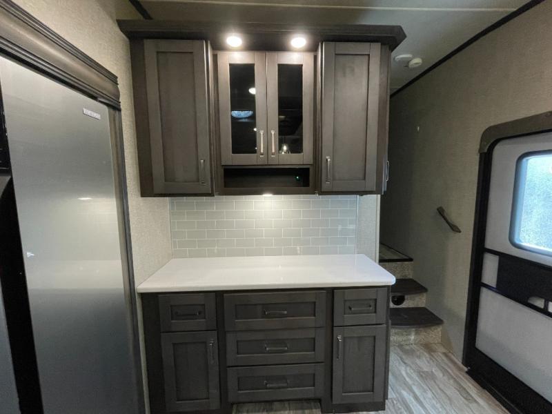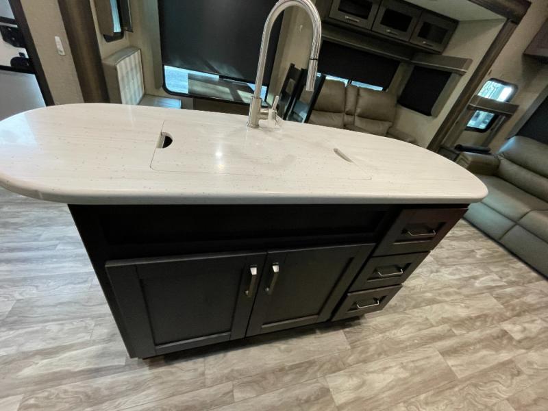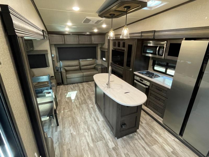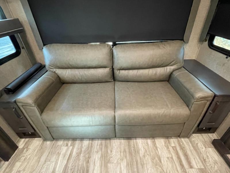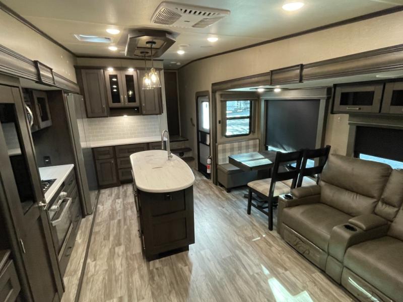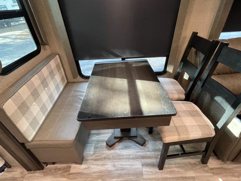 At the heart of the living space, you’ll find plush seating, a theater-style sofa, and a freestanding dinette, all arranged to maximize comfort without sacrificing room to move. The seamless flow from the living area into the kitchen makes this fifth wheel ideal for couples or full-time RVers who want both functionality and breathing room.