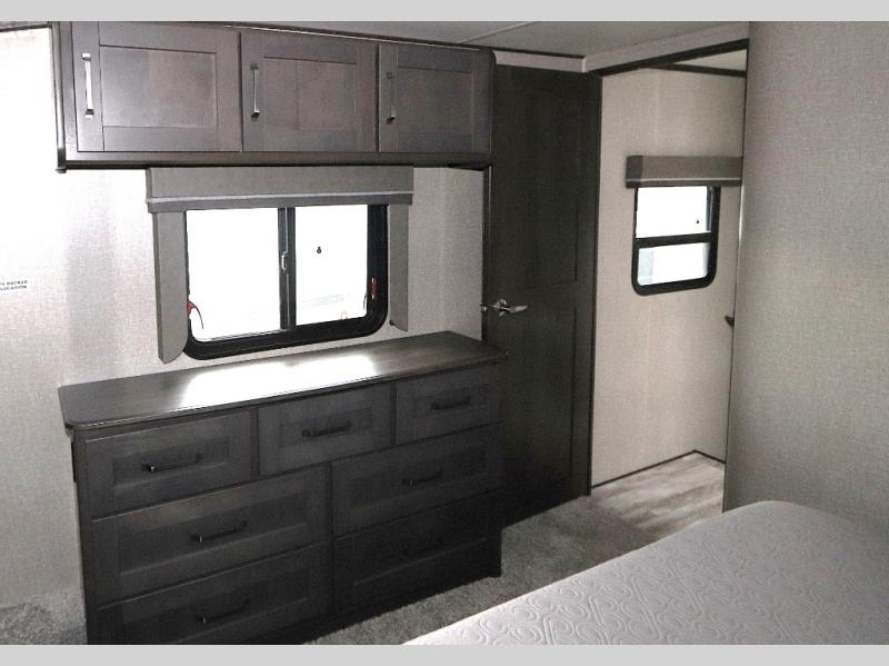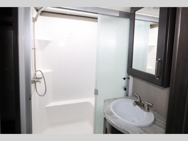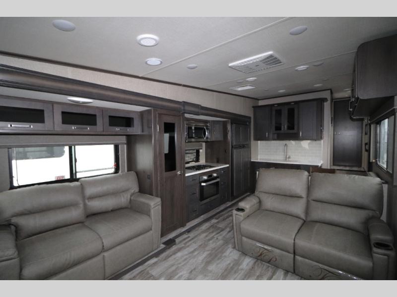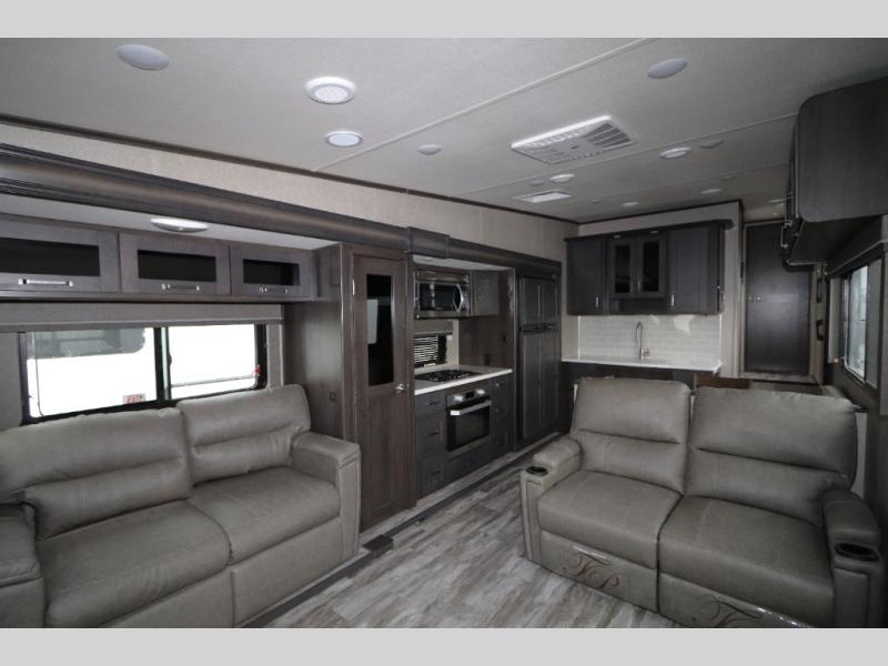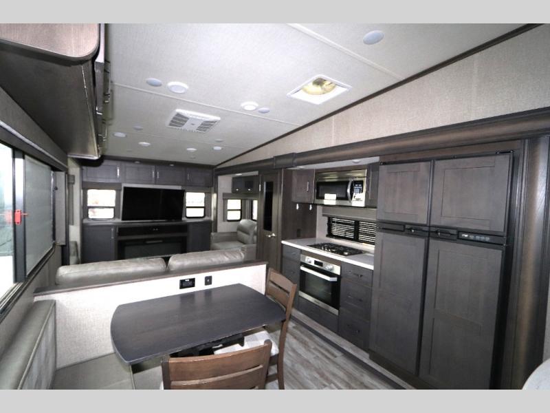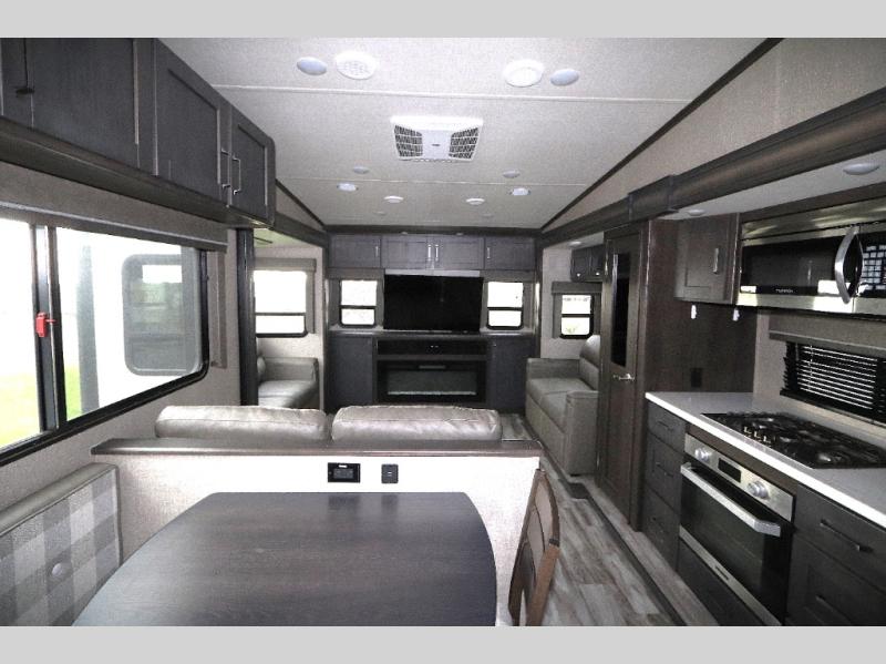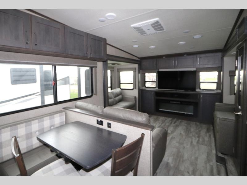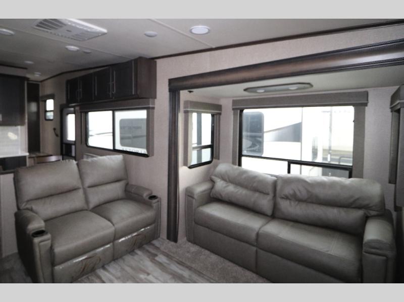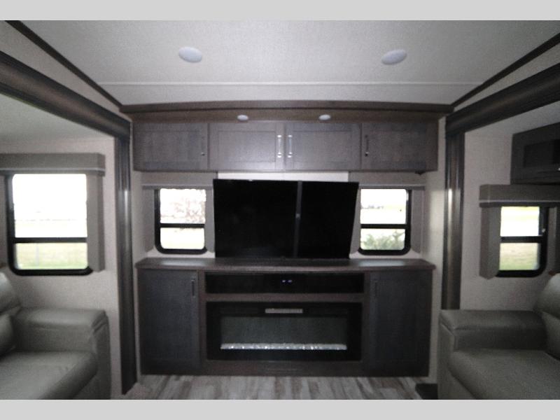Pick your favorite camping spot and load up this luxurious fifth wheel! You will feel right at home in the front private bedroom with the queen bed slide and the full wall wardrobe that has been prepped to add the optional washer and dryer. You can start each morning feeling clean and fresh after showering in the 30" x 48" fiberglass shower. Grab some eggs and bacon to fry up on the three burner cooktop then head to the free standing dinette with ottoman storage to enjoy them. The rear living area has two opposing tri-fold sofas and theater seating directly across from the entertainment center with a 50" HDTV and a 48" fireplace below it. You won't have to leave any of your camping gear behind either thanks to the unobstructed pass-through storage area!