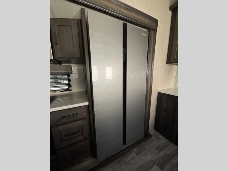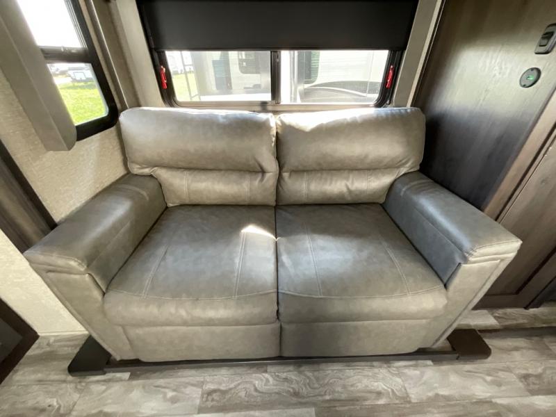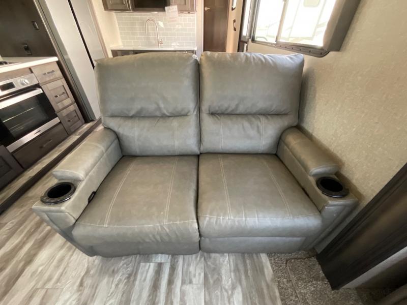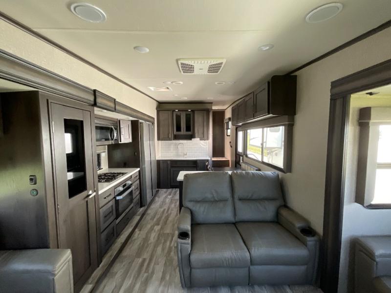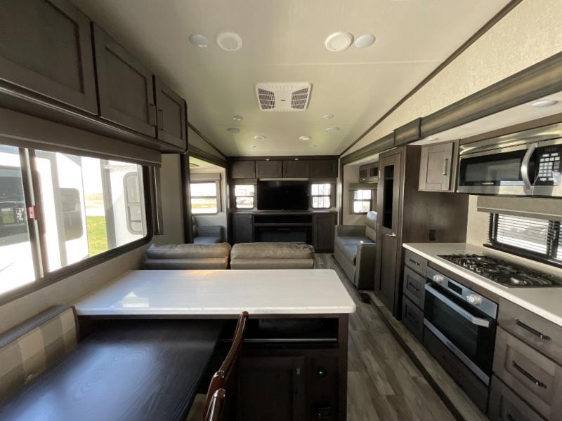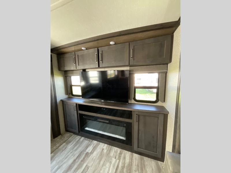 Looking for a separate living area from the kitchen in your next RV? Do you want to be able to entertain while camping? Well this fifth wheel has what you want, plus much more! The rear living area has two opposing tri-fold sofas, and theatre seating directly across from the rear entertainment center with a 50" LED HDTV and a 48" fireplace below it, plus windows and storage. The middle kitchen area offers the cook a large pantry, a 16 cu. ft. refrigerator, and extra counter space around the deep seated stainless steel sink. And there is a free standing adjustable dinette with a storage ottoman and more counter space nearby giving you a place for your things while dining, playing game or even working. The full bathroom can be accessed from the hallway that leads to the front bedroom which offers a queen bed slide or choose a king option, a dresser with window above, plus a full wall wardrobe with a place to add a washer/dryer option to keep everything clean while away.
