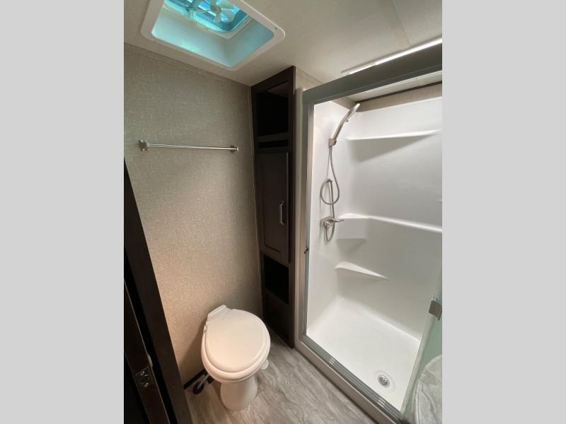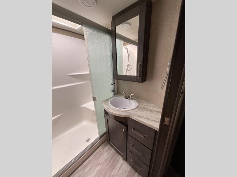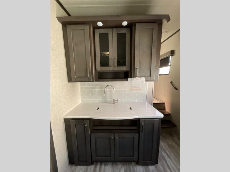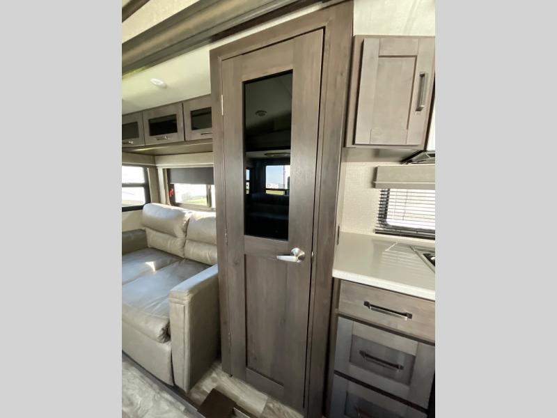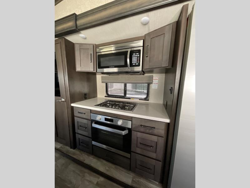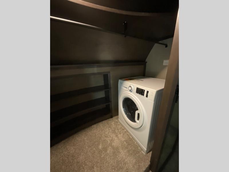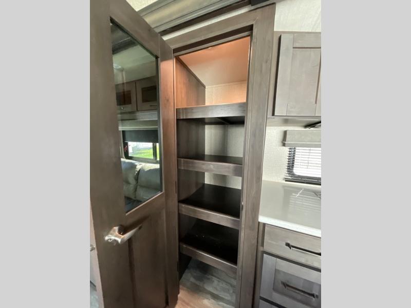 Looking for a separate living area from the kitchen in your next RV? Do you want to be able to entertain while camping? Well this fifth wheel has what you want, plus much more! The rear living area has two opposing tri-fold sofas, and theatre seating directly across from the rear entertainment center with a 50" LED HDTV and a 48" fireplace below it, plus windows and storage. The middle kitchen area offers the cook a large pantry, a 16 cu. ft. refrigerator, and extra counter space around the deep seated stainless steel sink. And there is a free standing adjustable dinette with a storage ottoman and more counter space nearby giving you a place for your things while dining, playing game or even working. The full bathroom can be accessed from the hallway that leads to the front bedroom which offers a queen bed slide or choose a king option, a dresser with window above, plus a full wall wardrobe with a place to add a washer/dryer option to keep everything clean while away.