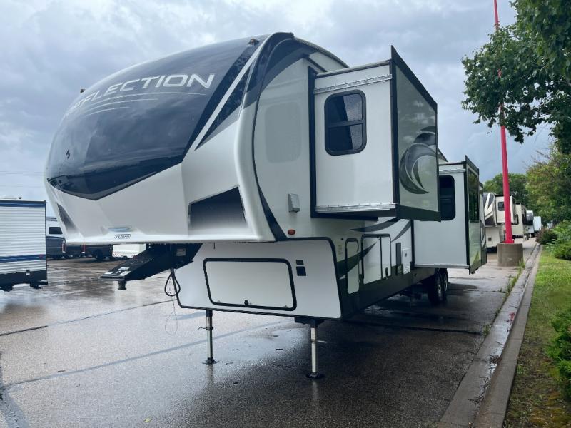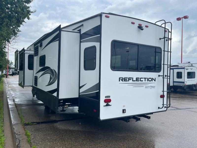 With any Reflection fifth wheels by Grand Design, you will have a 165W solar panel for off-grid camping and a 50 Amp charge controller and inverter prep, a Max Turn radius front cap for easy towing around town and into your campsite, a Universal All-In-One Docking Station, unobstructed pass-through storage, and Goodyear E-rated tires. Some other top features include a chef's kitchen with a 30" stainless steel microwave and residential cooktop, a USB charging station, and the ductless "Evenflow" heating system with no vents in the floor to collect debris. Each is constructed of high gloss gel coat exterior sidewalls, residential 5" truss rafters, walk-on roof decking, a fiberglass and radiant foil roof and front cap insulation plus laminated aluminum framed side walls, rear wall, roof and end walls in slide rooms. Choose luxury, value and towability over all the others, take home a Reflection of your good taste!
