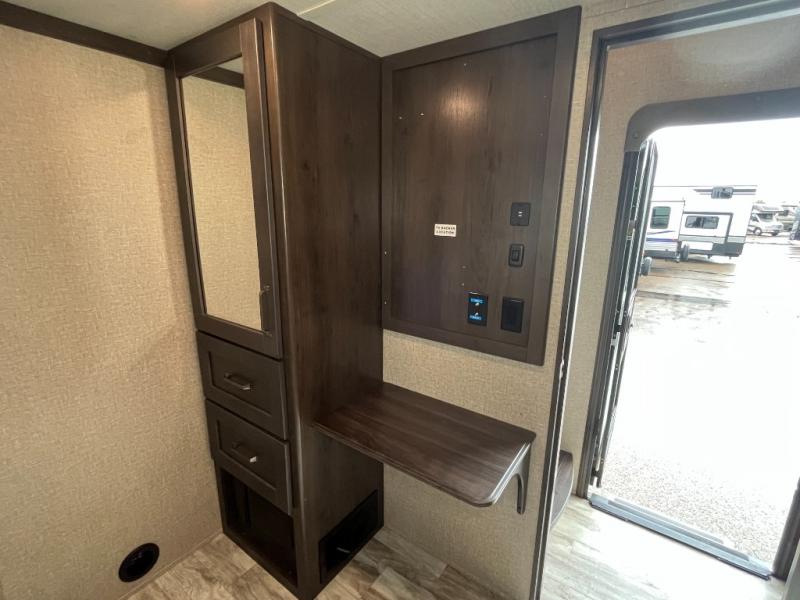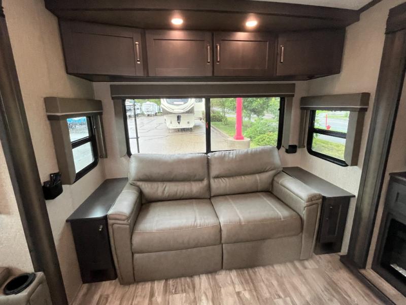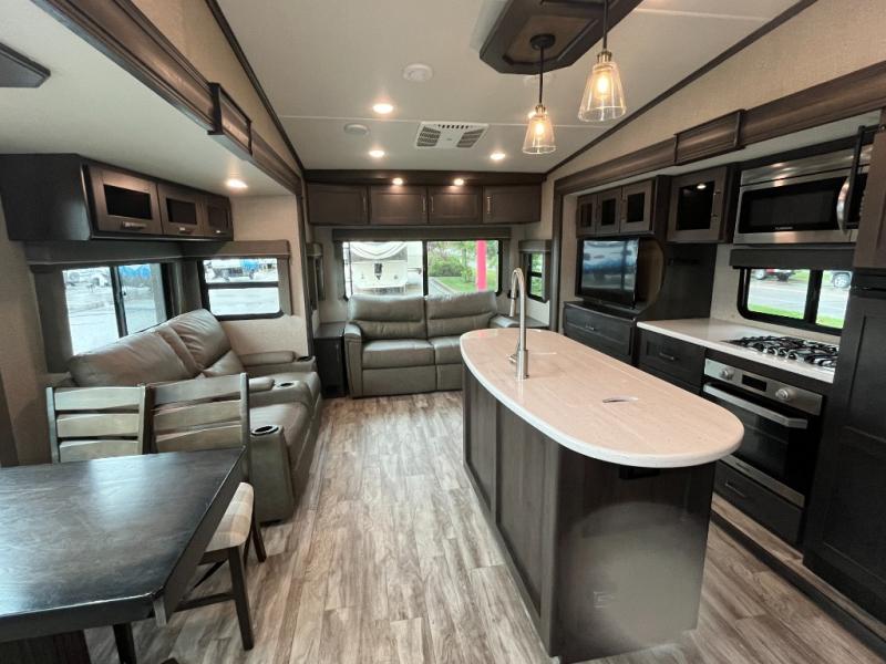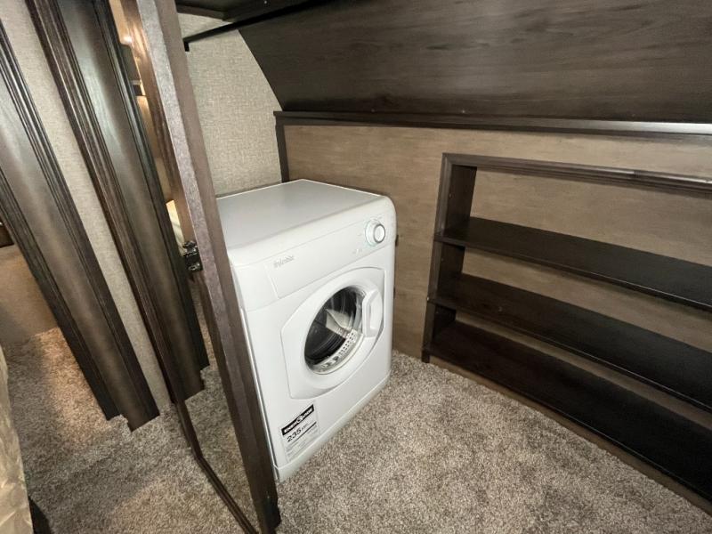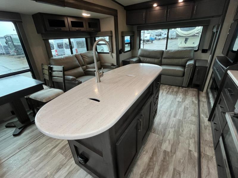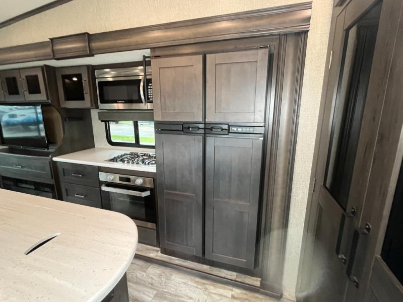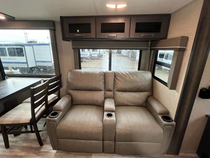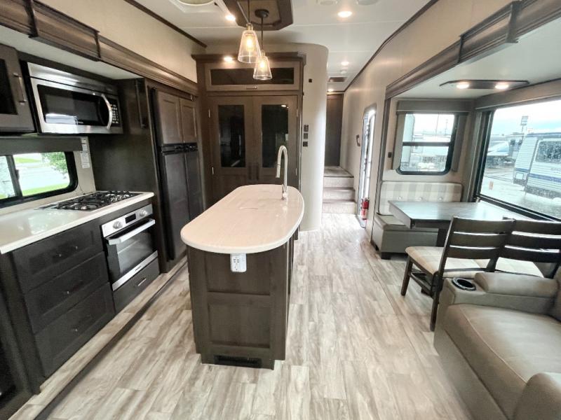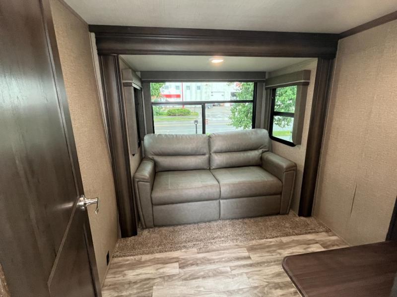Travel to see new state parks, RV resorts or your family in other states as you tow this fifth wheel to each destination to enjoy comfort and convenience, plus a place to work and be able to offer extra sleeping space for friends and family when they visit! The middle extra room provides a tri-fold sofa slide, a desk, a wardrobe, plus a 64" x 88" upper bed loft area with access from the hallway, which provides two different places to accommodate overnight guests. The full bathroom will keep everyone refreshed, and the front bedroom allows you to sleep on a queen bed slide or choose the king option. And you will love the front wardrobe, the dresser, and the option to add a washer/dryer. The main living and kitchen area provides plenty of seating from the rear tri-fold sofa, the booth dinette or choose the free standing dinette option, and the theatre seats with cupholders. And the kitchen island, the appliances, and the large pantry allow you to take everything you need with you.