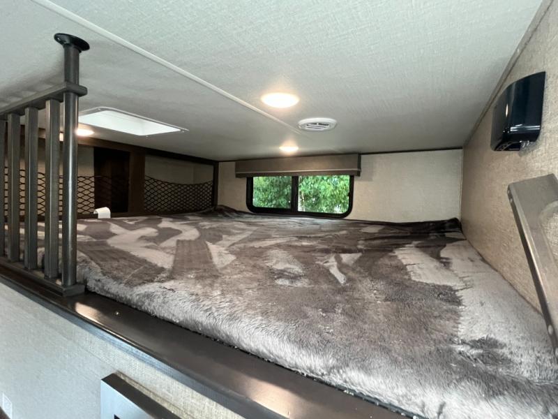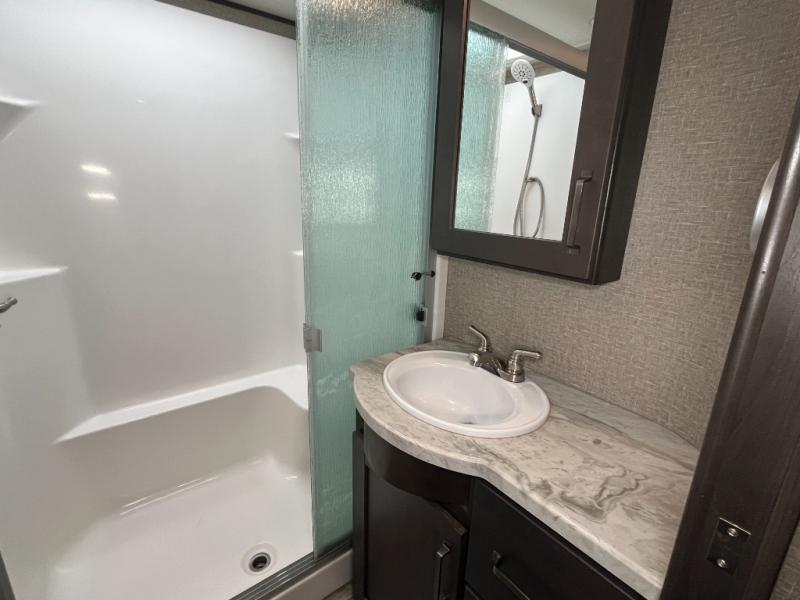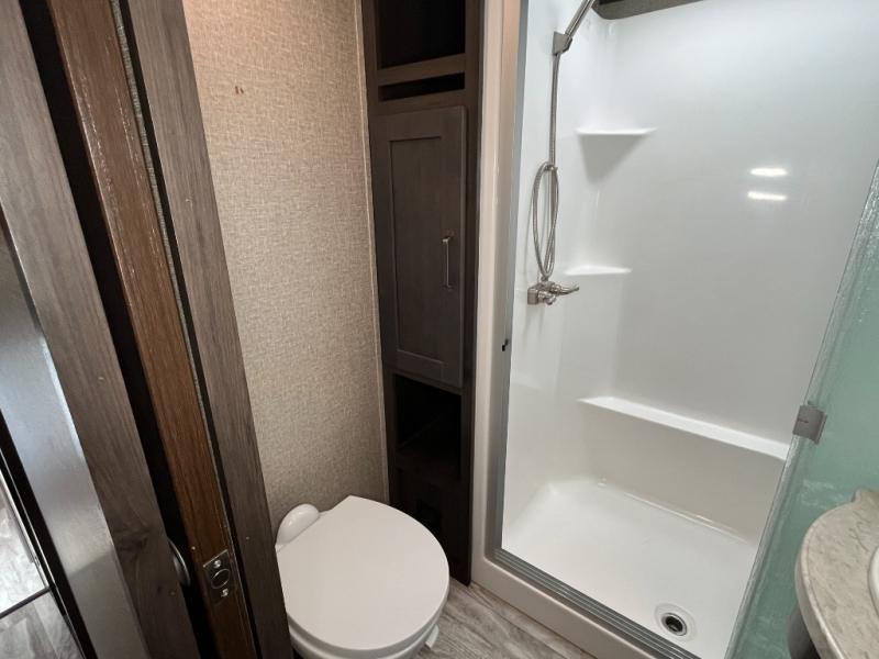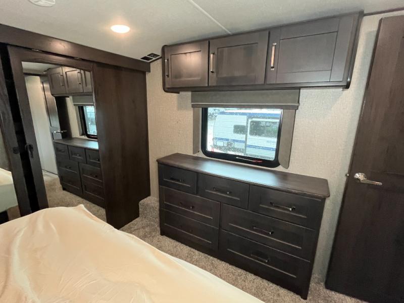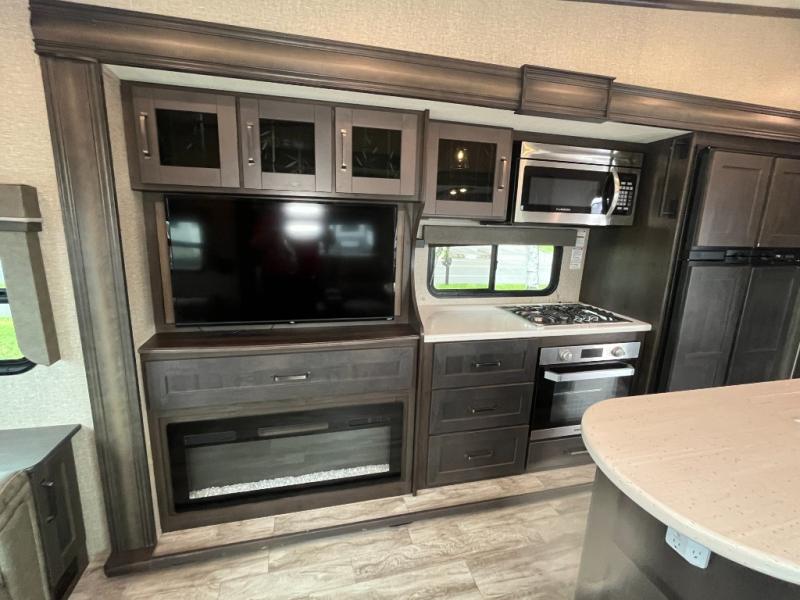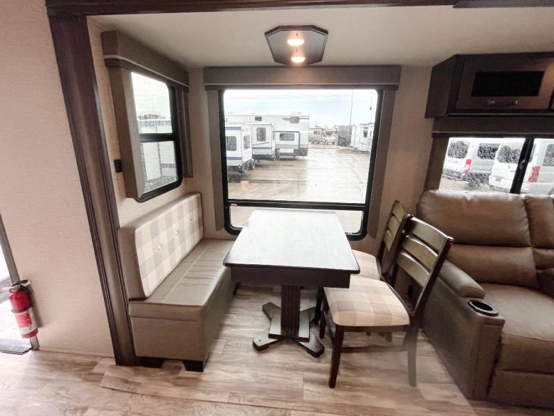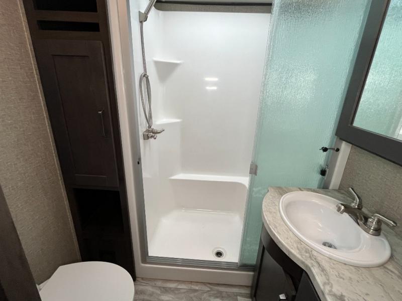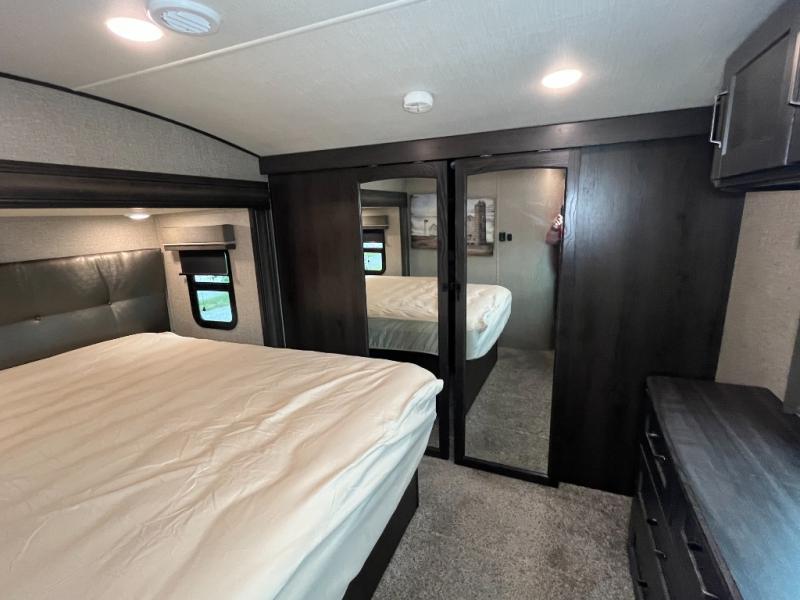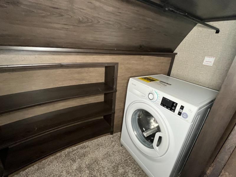 Travel to see new state parks, RV resorts or your family in other states as you tow this fifth wheel to each destination to enjoy comfort and convenience, plus a place to work and be able to offer extra sleeping space for friends and family when they visit! The middle extra room provides a tri-fold sofa slide, a desk, a wardrobe, plus a 64" x 88" upper bed loft area with access from the hallway, which provides two different places to accommodate overnight guests. The full bathroom will keep everyone refreshed, and the front bedroom allows you to sleep on a queen bed slide or choose the king option. And you will love the front wardrobe, the dresser, and the option to add a washer/dryer. The main living and kitchen area provides plenty of seating from the rear tri-fold sofa, the booth dinette or choose the free standing dinette option, and the theatre seats with cupholders. And the kitchen island, the appliances, and the large pantry allow you to take everything you need with you.