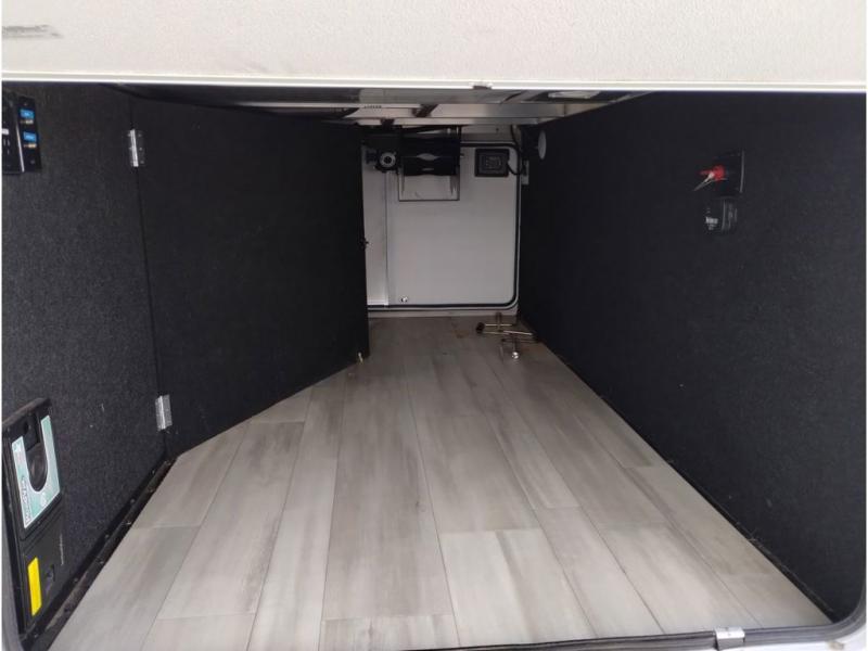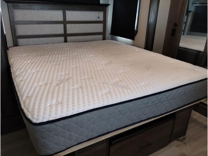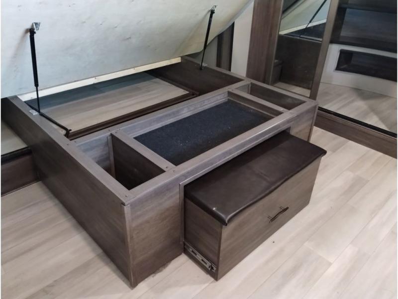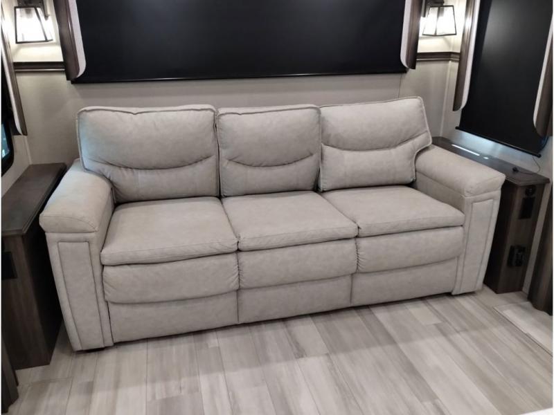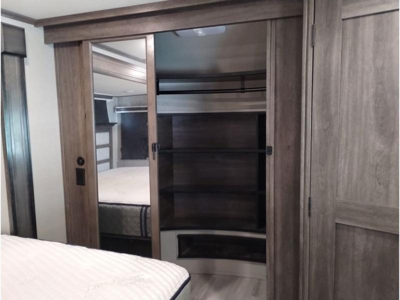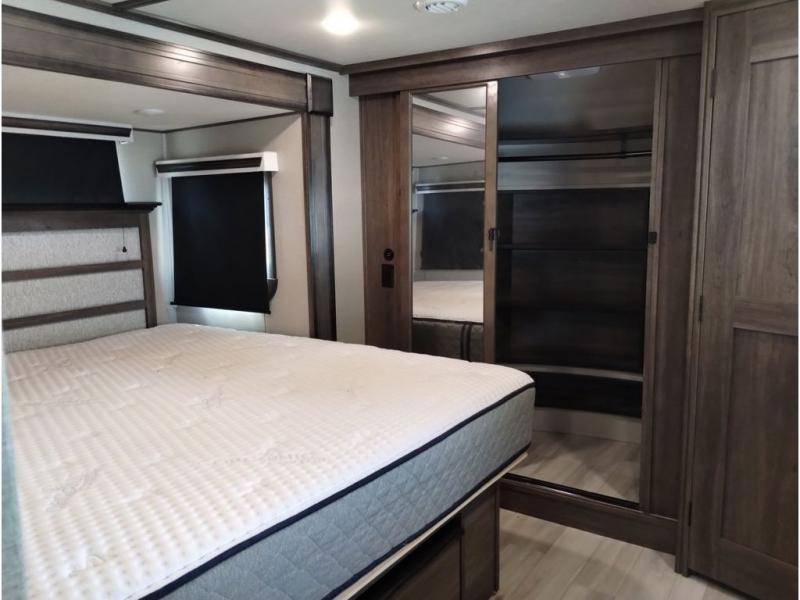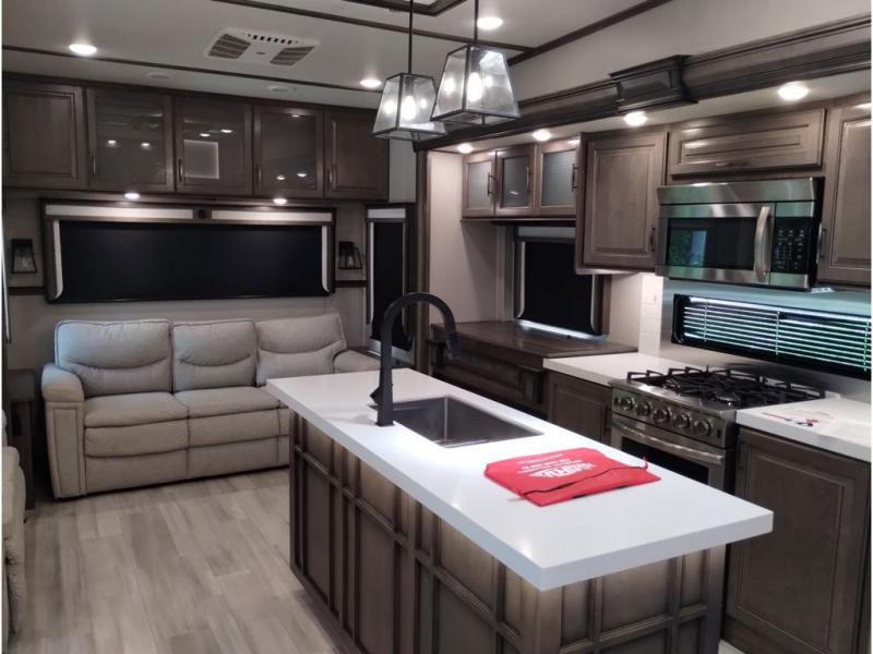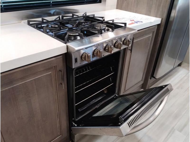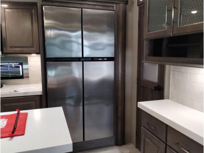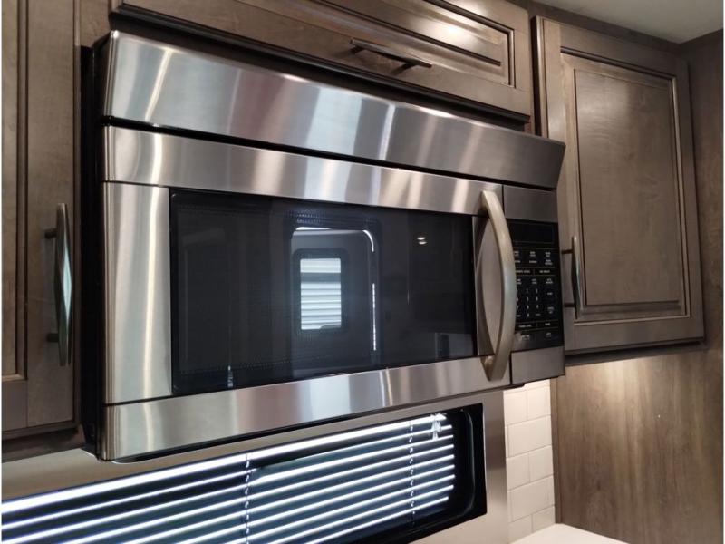Traveling for long periods at a time is made easy with this kitchen that can feed a group a holiday meal! The professional-grade stainless steel cooktop with built-in oven, the microwave, the stainless steel 18 cu. ft. four-door refrigerator and the kitchen island offer everything you will need to enjoy cooking. Yet you might like to add the French door refrigerator option instead. You will find storage throughout including in the hutch, under the interior steps, and in the front master bedroom. There is a queen bed or choose a king, a pull-out ottoman, a closet prepped for a washer/dryer option, a larger wardrobe, plus a flip-top dresser with LED TV above. And the bathroom includes a shower with a seat and skylight. Plus you can add the exterior pull-out kitchen option to enjoy while relaxing under one of the two power awnings.