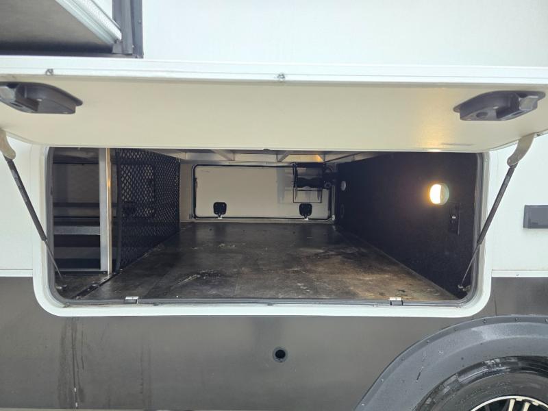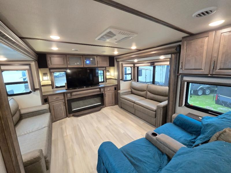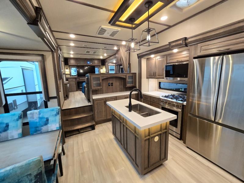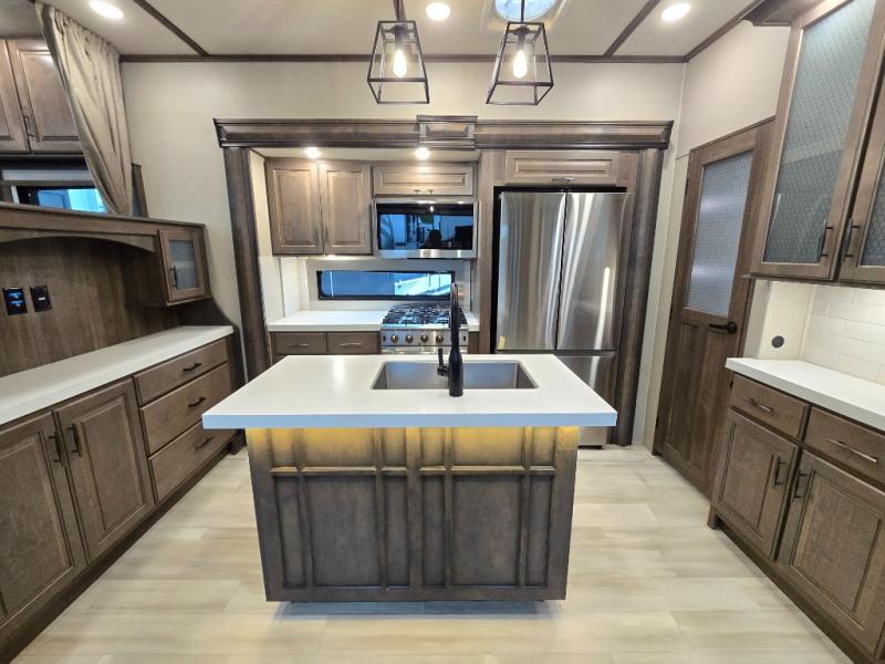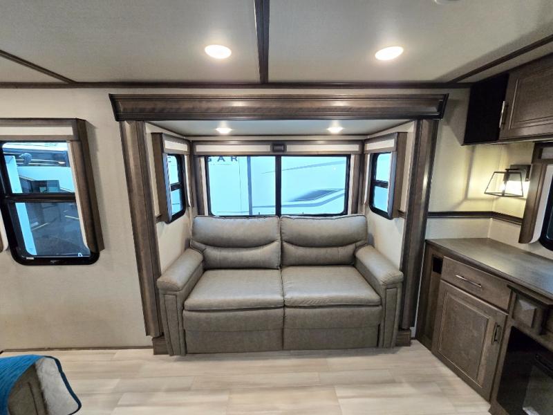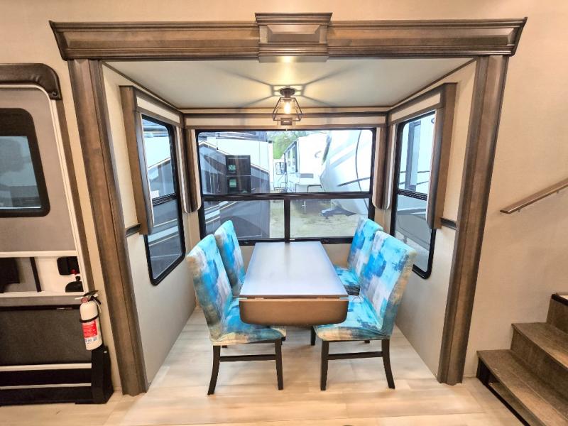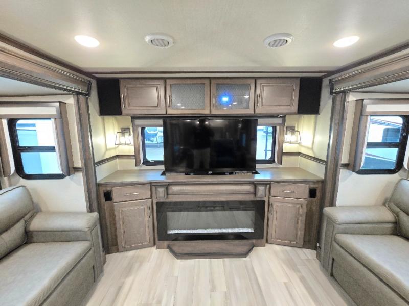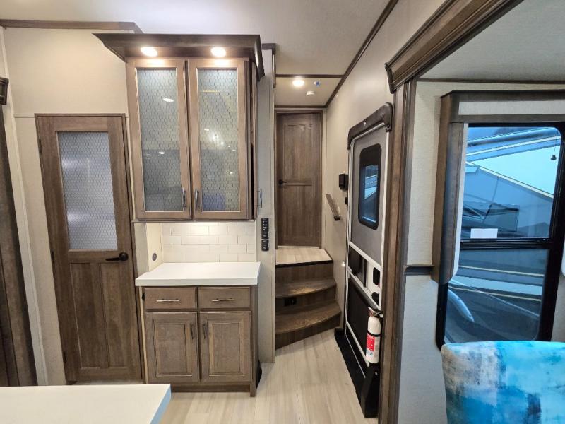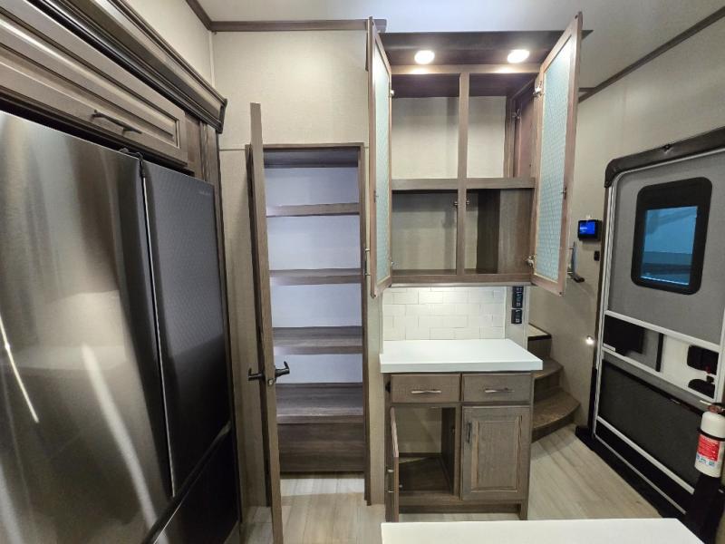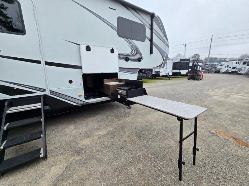 Your extended stays at any location will be enjoyable in this fifth wheel with the separate rooms, the five slide outs and the storage found inside as well as outside! The exterior rear storage with sliding tray is super handy to carry the larger camping items and totes plus there are several other compartments for items such as charcoal, outdoor games, hiking boots, fishing gear and more. The separate rear entertainment and living area provides an LED TV with fireplace below, several windows for great views, furniture to relax on as well as sleep on, plus USB charging outlets for your cellphones and such. The middle kitchen offers a buffet, a hutch, an oversized pantry, stainless steel appliances, and a free-standing dinette slide out with more views out of the windows. The full bathroom is up a few steps and before you reach the front bedroom. You will love the seated shower and linen storage. The bedroom provides a queen bed slide, a pull-out ottoman, a flip-up dresser with LED TV, and a mirrored wardrobe. There are a few more options to add if you wish such as a washer/dryer, an outside pull-out kitchen, and/or a Solitude solar system.