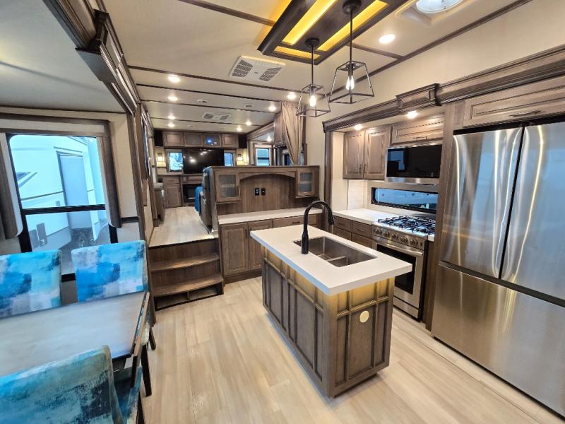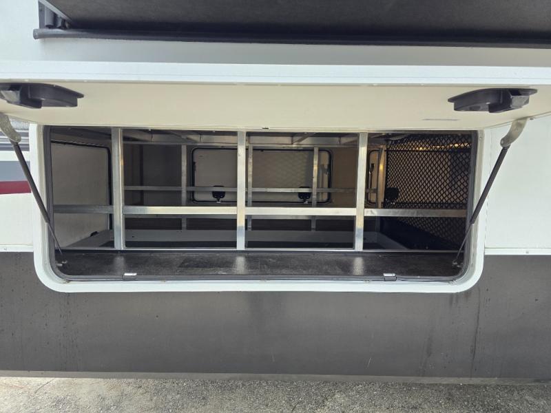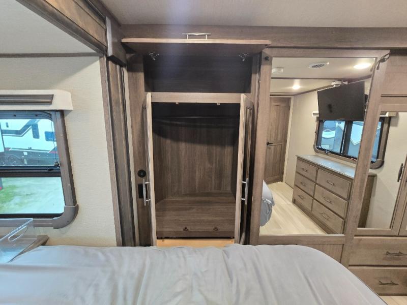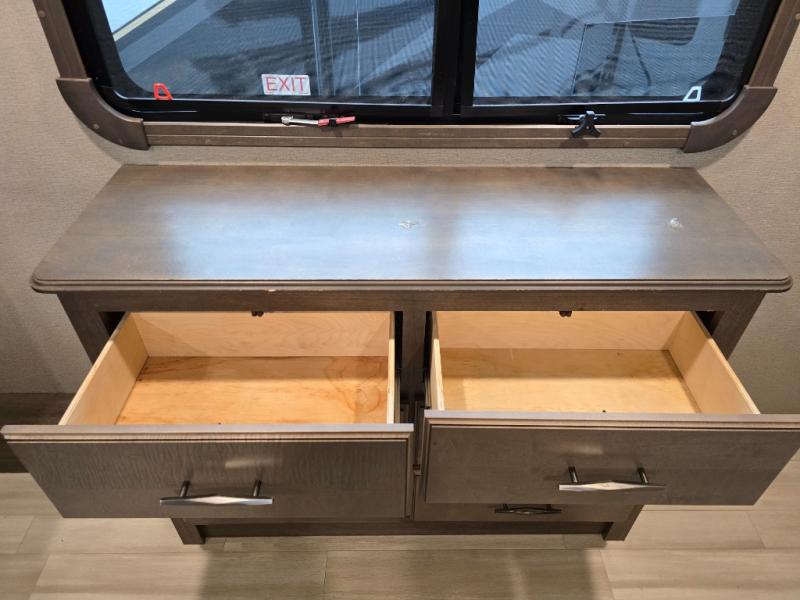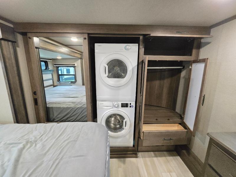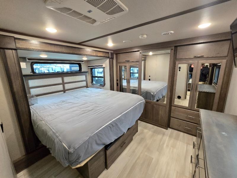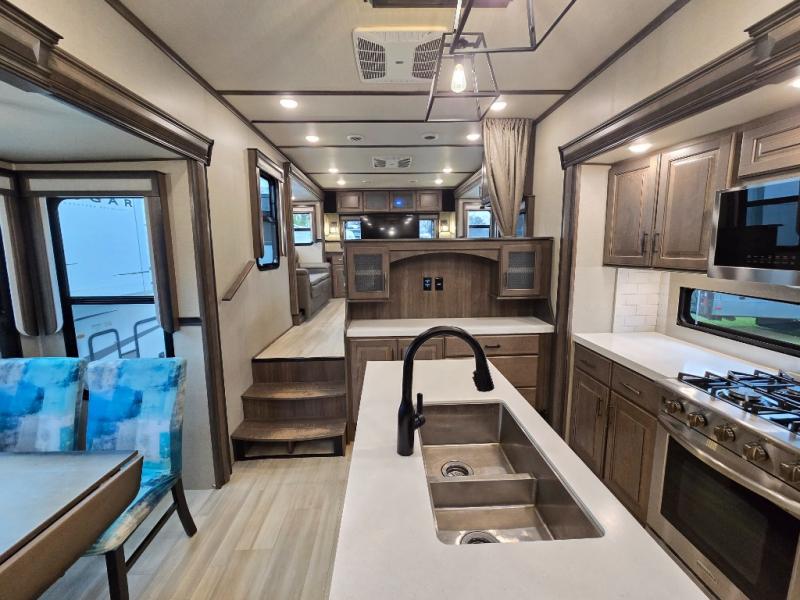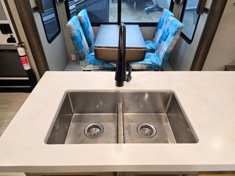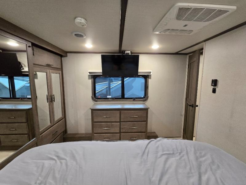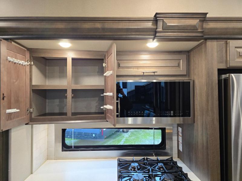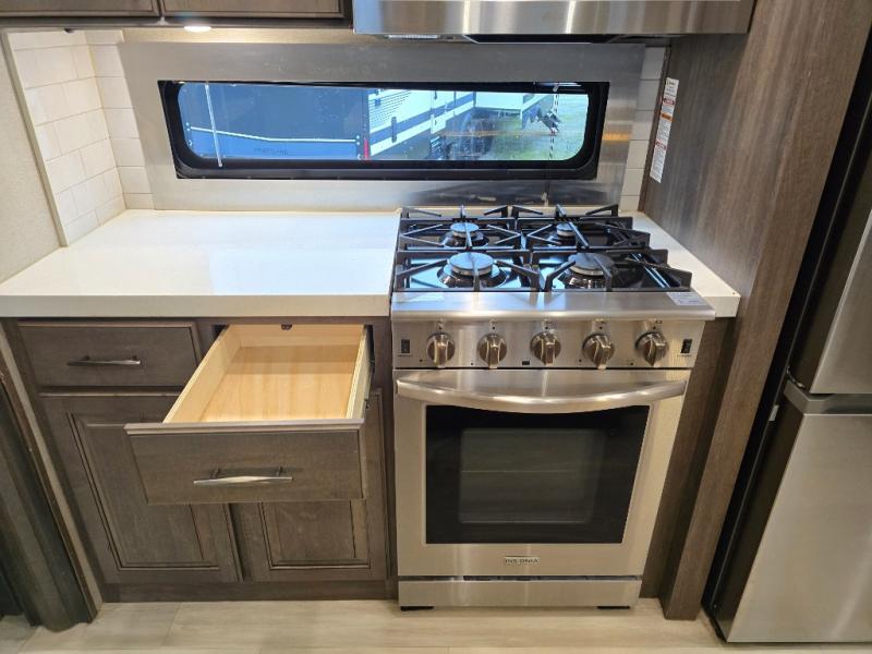 Your extended stays at any location will be enjoyable in this fifth wheel with the separate rooms, the five slide outs and the storage found inside as well as outside! The exterior rear storage with sliding tray is super handy to carry the larger camping items and totes plus there are several other compartments for items such as charcoal, outdoor games, hiking boots, fishing gear and more. The separate rear entertainment and living area provides an LED TV with fireplace below, several windows for great views, furniture to relax on as well as sleep on, plus USB charging outlets for your cellphones and such. The middle kitchen offers a buffet, a hutch, an oversized pantry, stainless steel appliances, and a free-standing dinette slide out with more views out of the windows. The full bathroom is up a few steps and before you reach the front bedroom. You will love the seated shower and linen storage. The bedroom provides a queen bed slide, a pull-out ottoman, a flip-up dresser with LED TV, and a mirrored wardrobe. There are a few more options to add if you wish such as a washer/dryer, an outside pull-out kitchen, and/or a Solitude solar system.