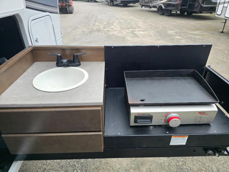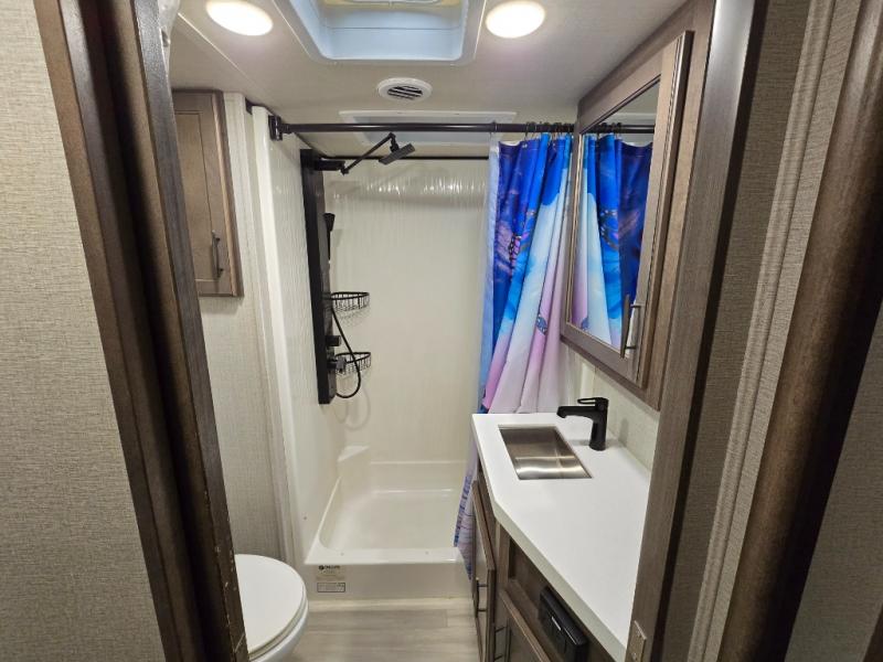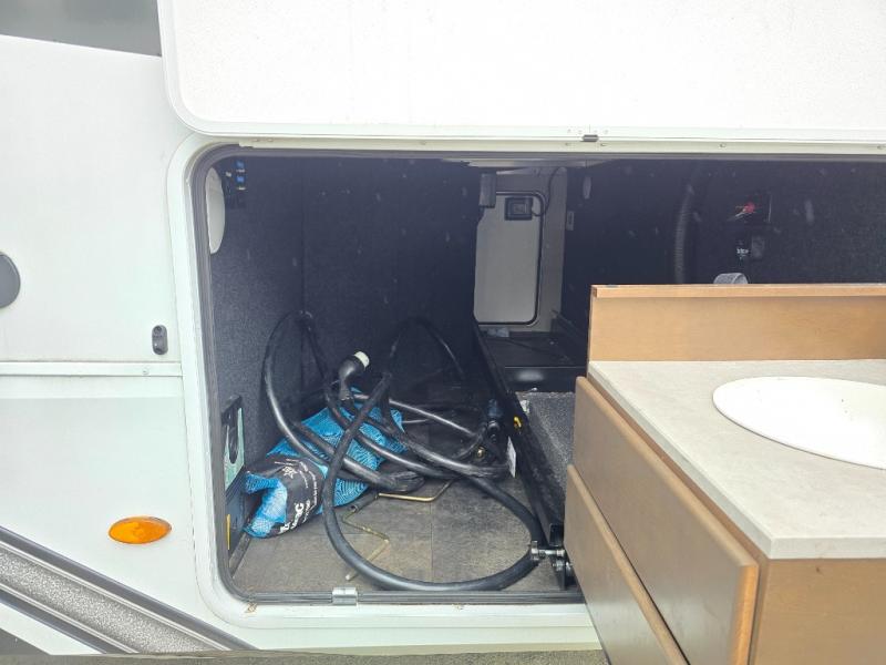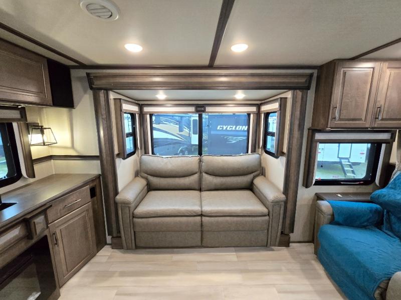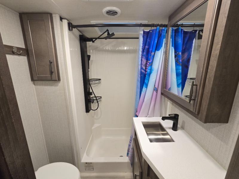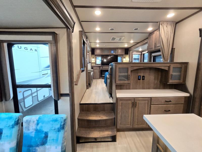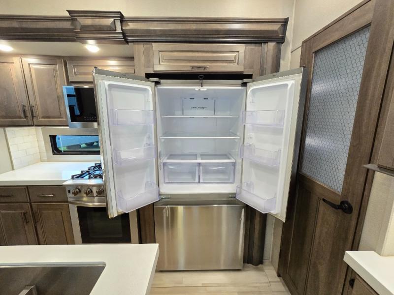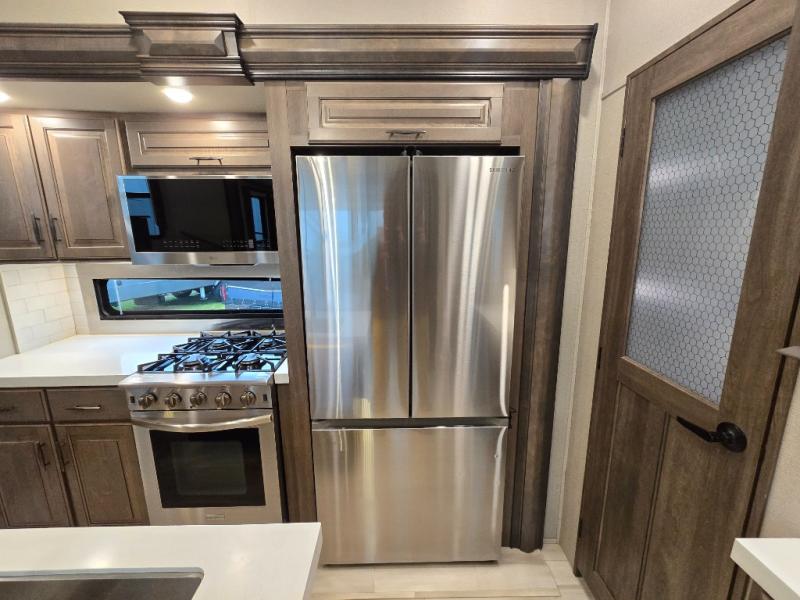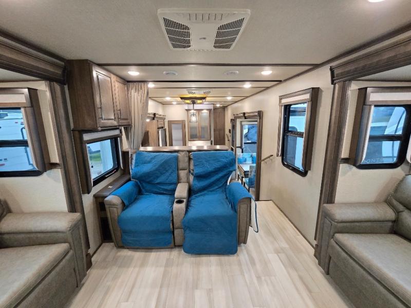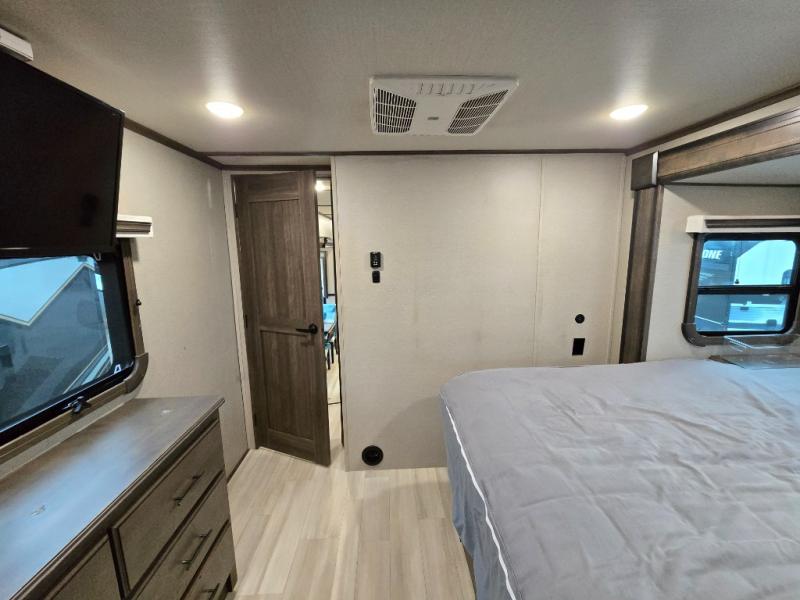 Your extended stays at any location will be enjoyable in this fifth wheel with the separate rooms, the five slide outs and the storage found inside as well as outside! The exterior rear storage with sliding tray is super handy to carry the larger camping items and totes plus there are several other compartments for items such as charcoal, outdoor games, hiking boots, fishing gear and more. The separate rear entertainment and living area provides an LED TV with fireplace below, several windows for great views, furniture to relax on as well as sleep on, plus USB charging outlets for your cellphones and such. The middle kitchen offers a buffet, a hutch, an oversized pantry, stainless steel appliances, and a free-standing dinette slide out with more views out of the windows. The full bathroom is up a few steps and before you reach the front bedroom. You will love the seated shower and linen storage. The bedroom provides a queen bed slide, a pull-out ottoman, a flip-up dresser with LED TV, and a mirrored wardrobe. There are a few more options to add if you wish such as a washer/dryer, an outside pull-out kitchen, and/or a Solitude solar system.