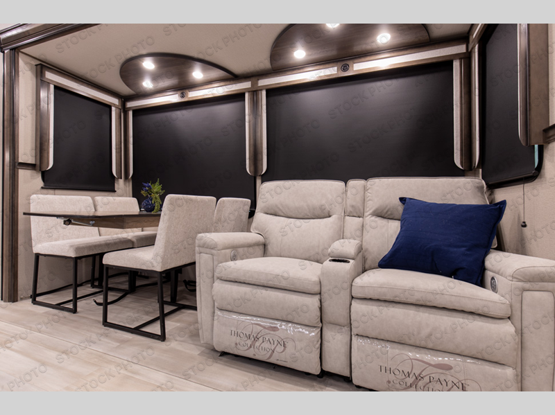 Looking for an extra room to utilize many ways in your next extended stay RV? Well you have found it in this middle bunkhouse with a fold down bunk above a tri-fold sofa that offers seating for an extra living room as well as sleeping space for a bedroom, plus there is a desk to work from and a closet for clothing and supplies making this room multi-functional. You can then retreat to your own master bedroom with a queen bed slide or choose the king option, a pull-out ottoman giving you a place to sit while taking off your shoes, an LED TV as well as a space prepped for a washer/dryer option. The main living and kitchen area is spacious with dual opposing slides and offers theatre seating and a tri-fold sofa to relax on while watching the LED Smart TV and visiting with the cook in the kitchen that offers a kitchen island, a 24" residential oven, and an oversized pantry to store lots of dry goods and snacks. You will surely enjoy the two power awnings and the outside grill plus beverage cooler while relaxing outdoors.